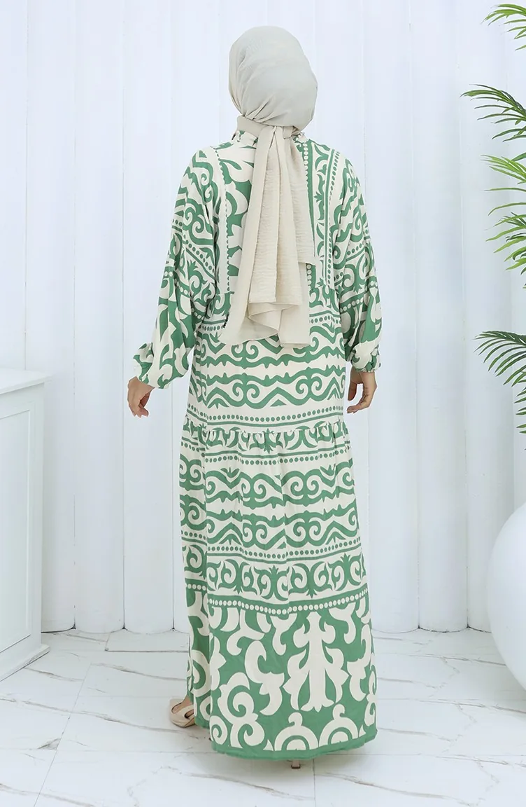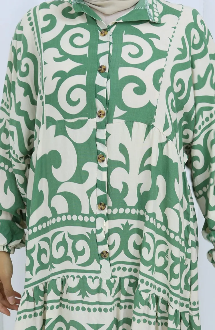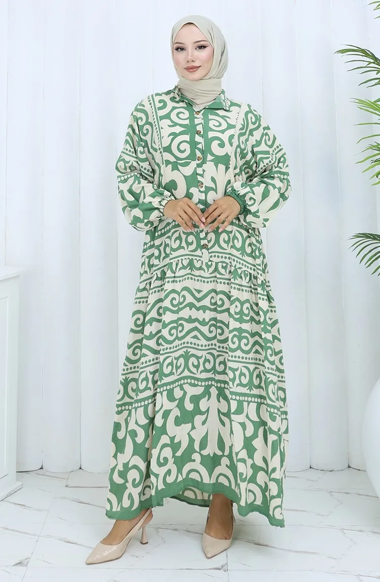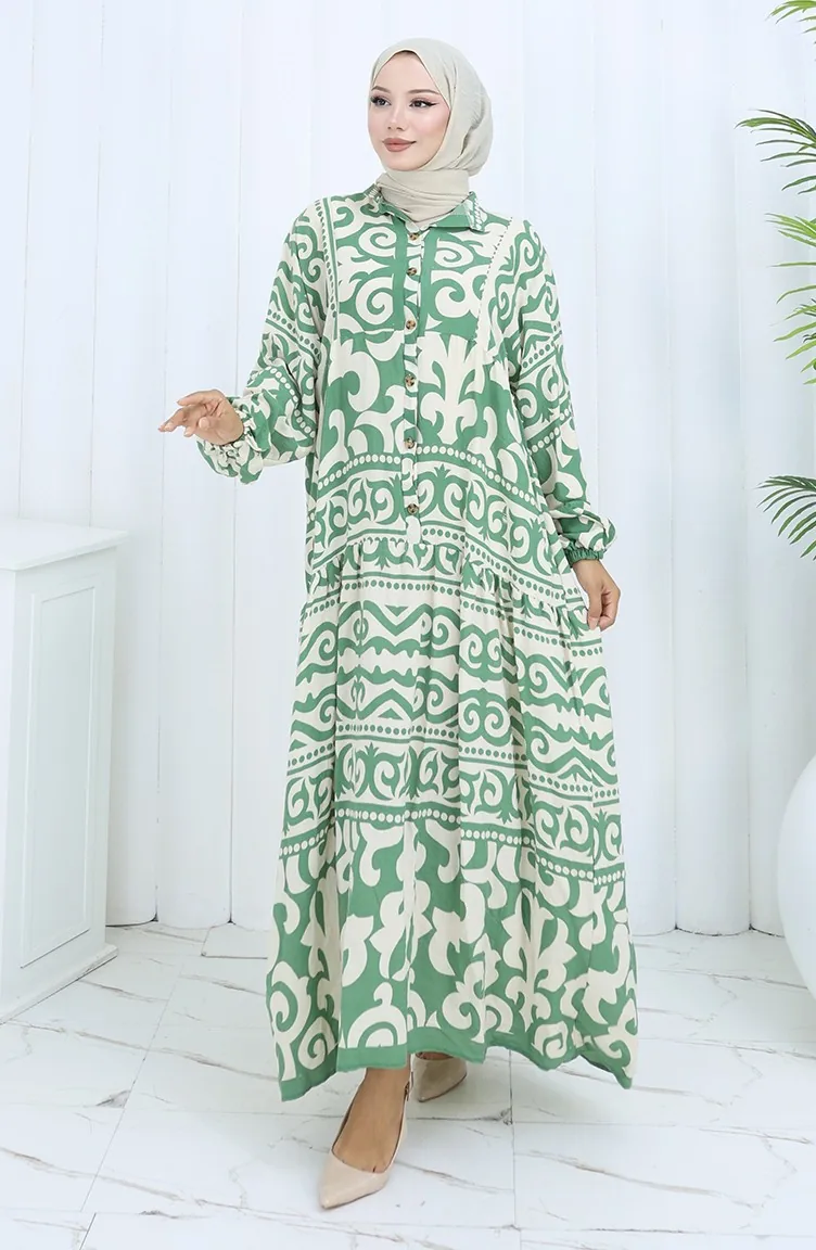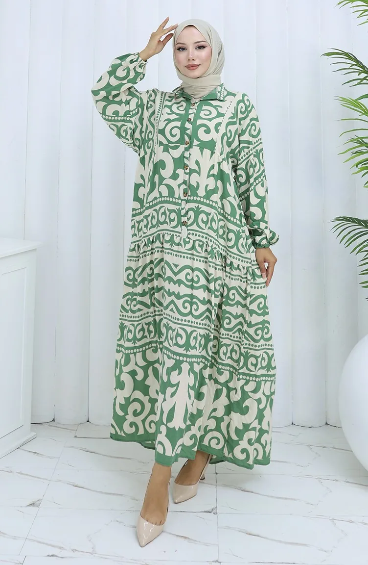 Alaçatı Desen Yarım Düğmeli Elbise 2137-05 Çağla Yeşili Krem