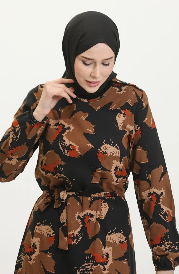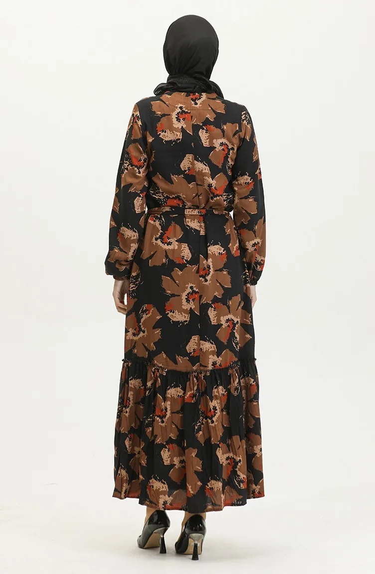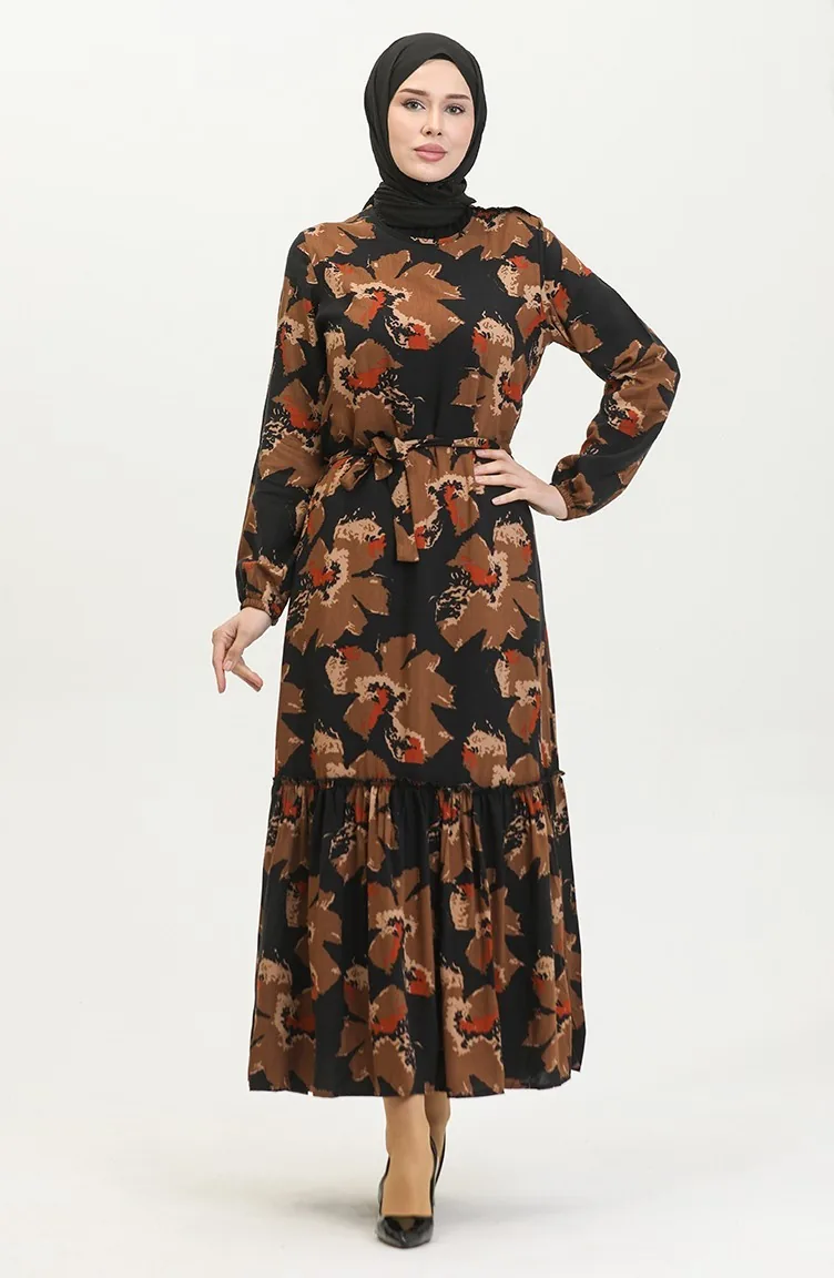 Alisa Farbalı Kuşaklı Viskon Elbise 4599C-01 Kahverengi Siyah