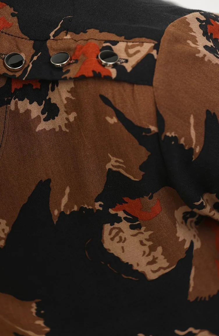 Kahverengi renktedir. Viskon kumaş. Desenli kumaş. Kuşaklı'dır. Sıfır yaka detayı ile rahat kullanıma sahiptir. Yazlık. Mankenin giydiği beden ölçüsü'dür.
