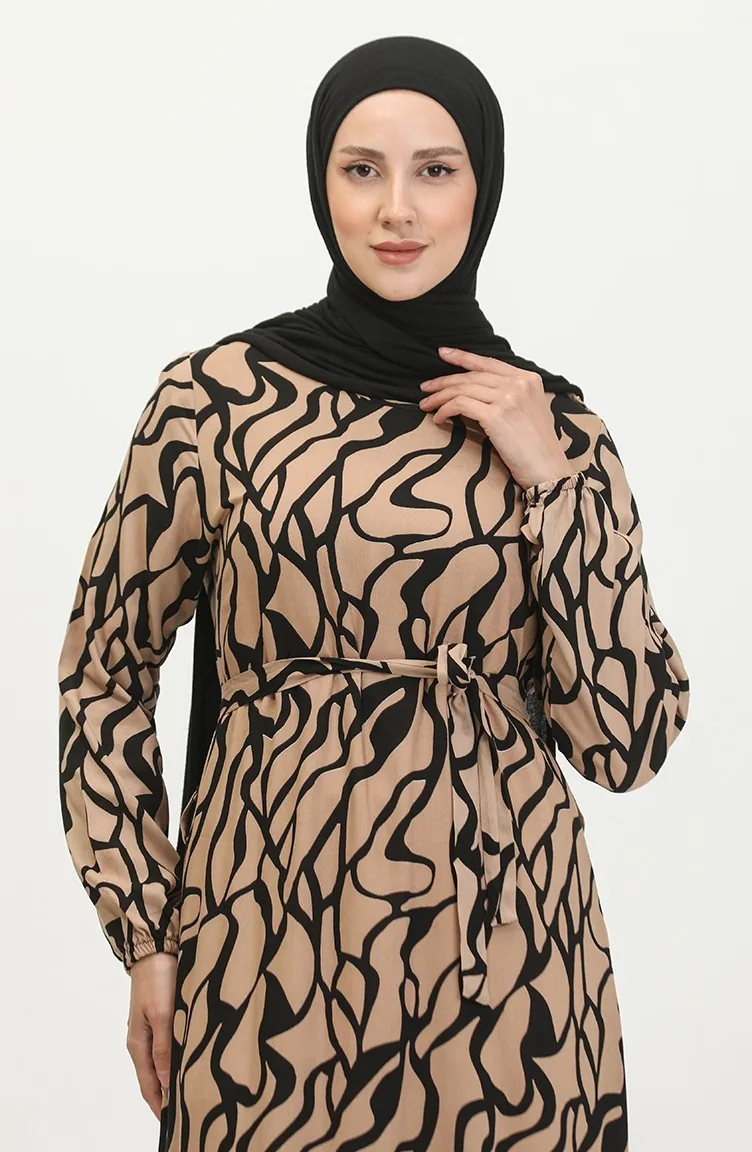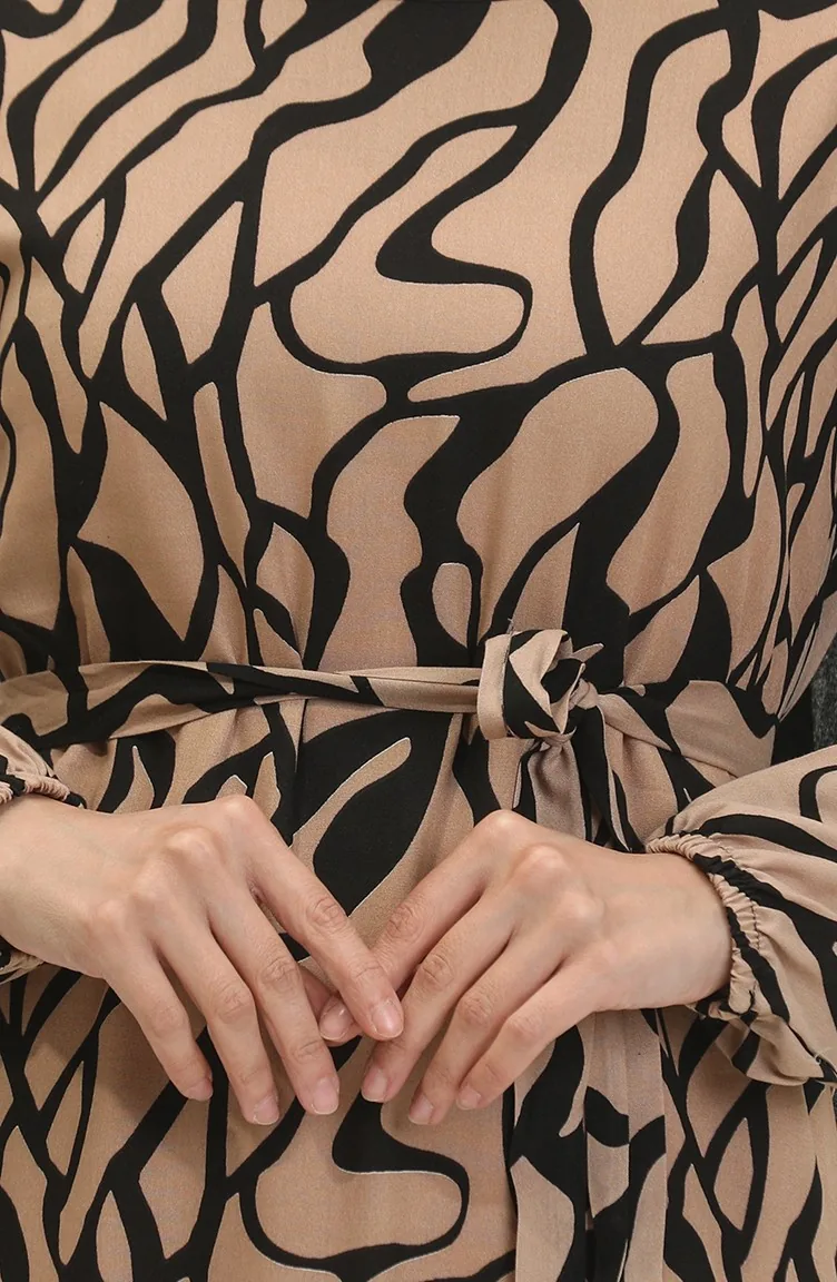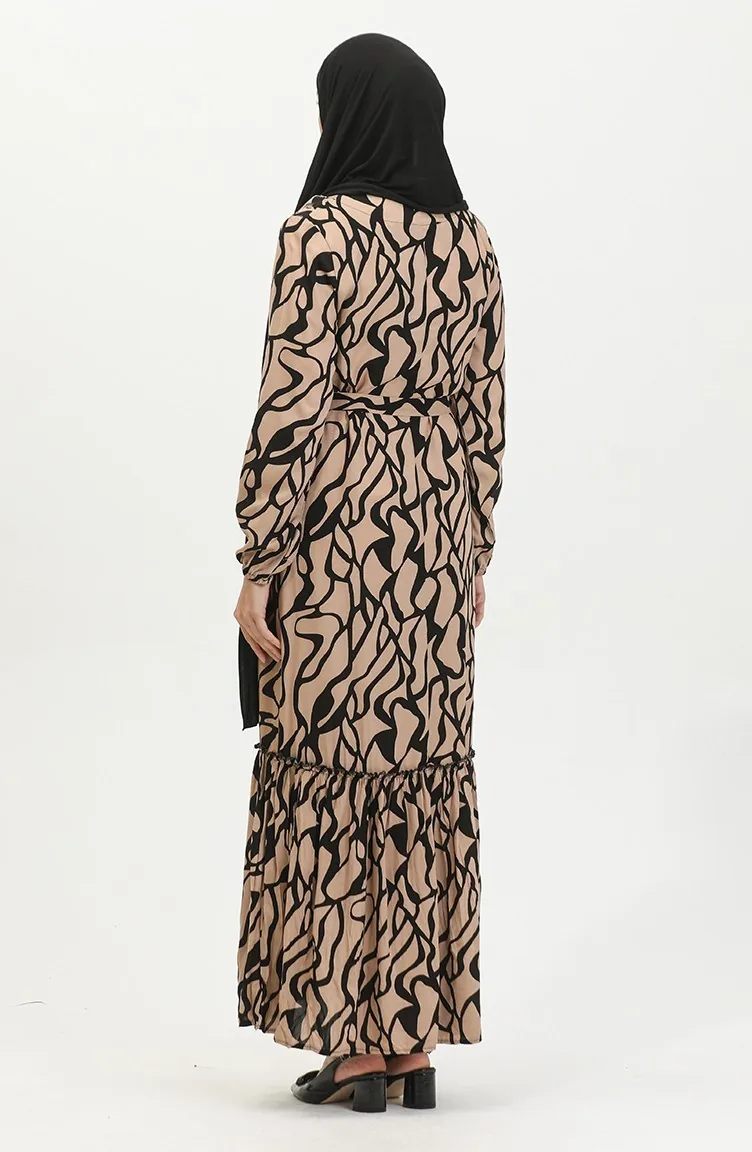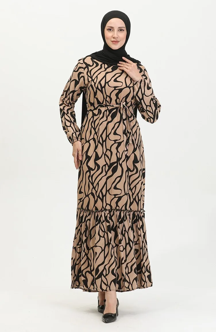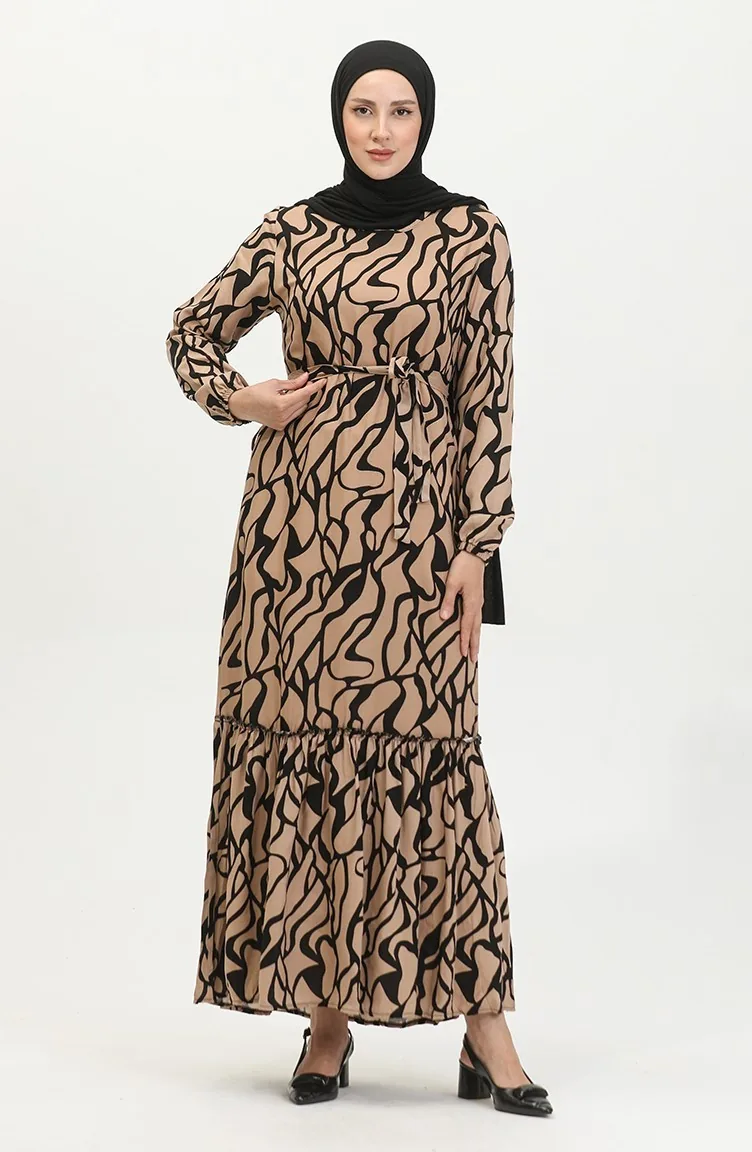 Alisa Farbalı Kuşaklı Viskon Elbise 4599F-01 Vizon
