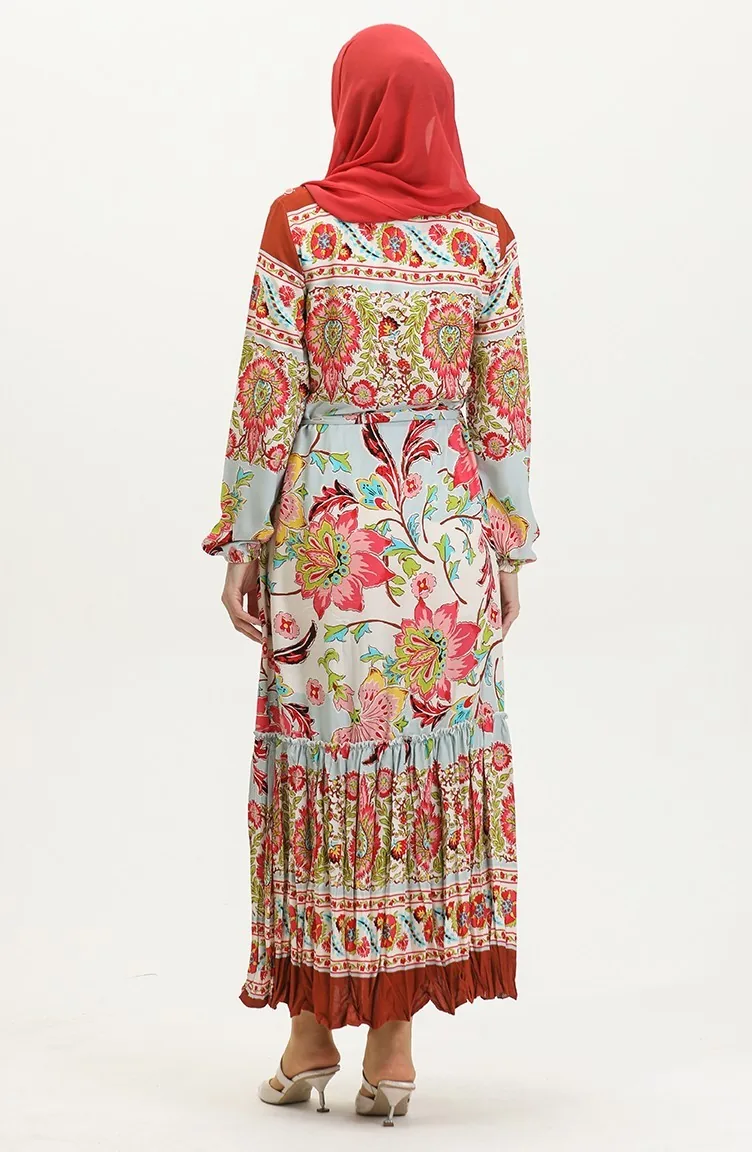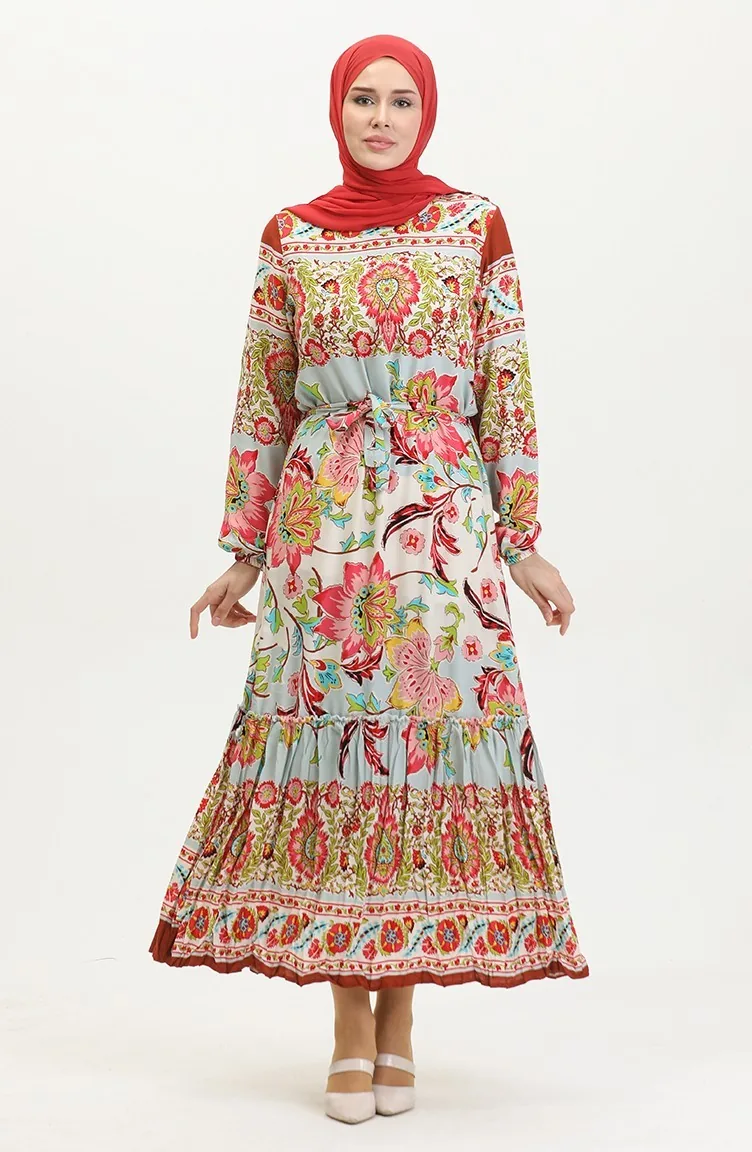 Alisa Farbalı Kuşaklı Viskon Elbise 4599H-01 Haki Gül Kurusu