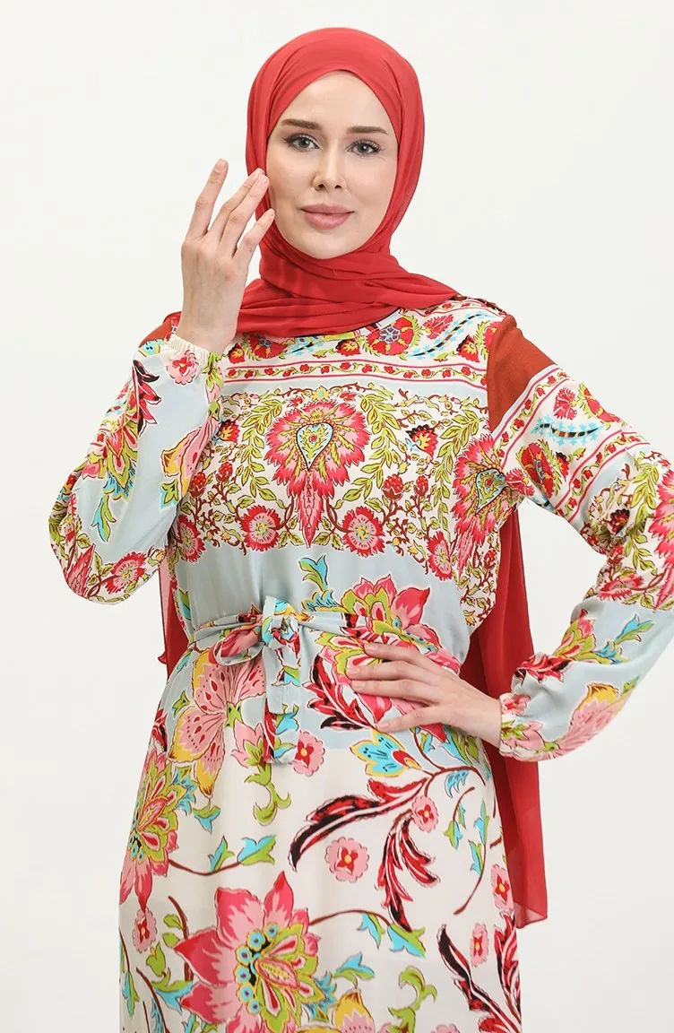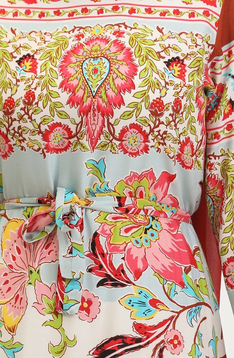 Haki renktedir. Viskon kumaş. Desenli kumaş. Kuşaklı'dır. Sıfır yaka detayı ile rahat kullanıma sahiptir. Yazlık. Mankenin giydiği beden ölçüsü'dür.
