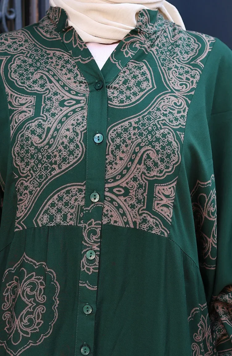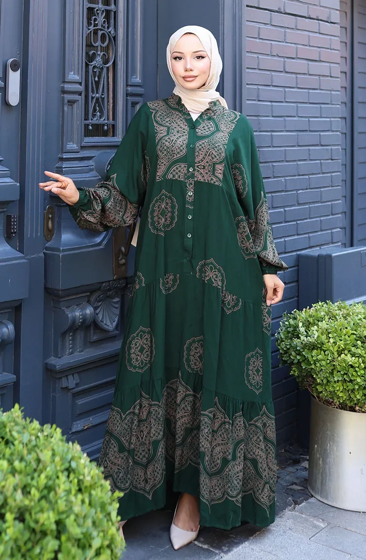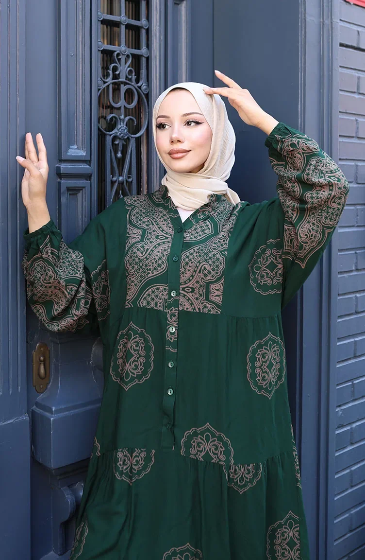 Balon Kol Viskon Elbise 5581-04 Zümrüt Yeşili
