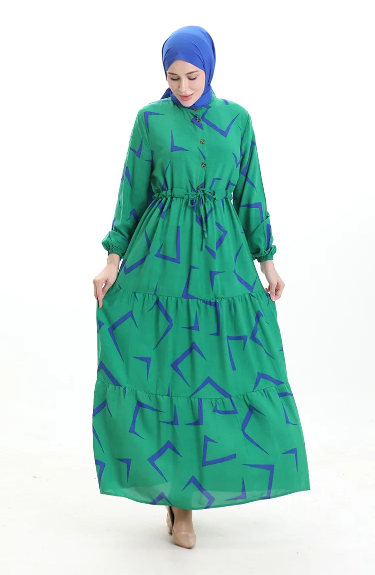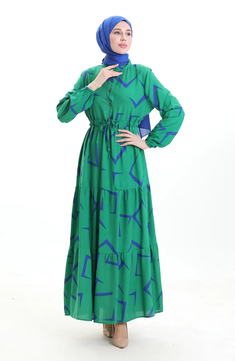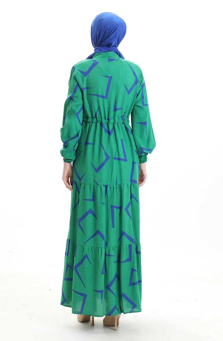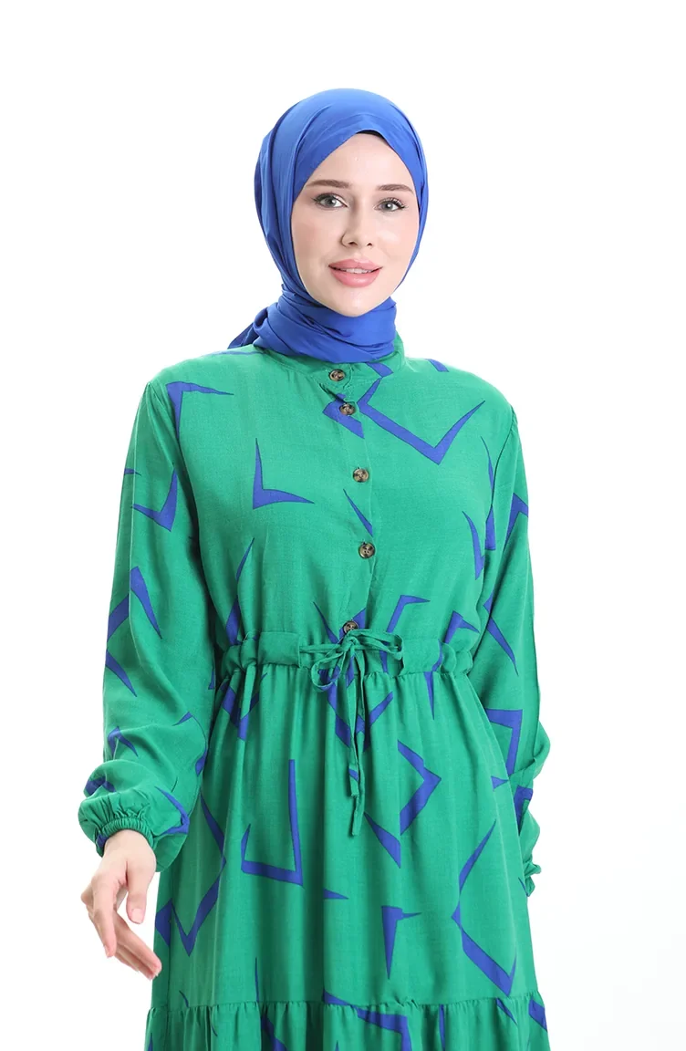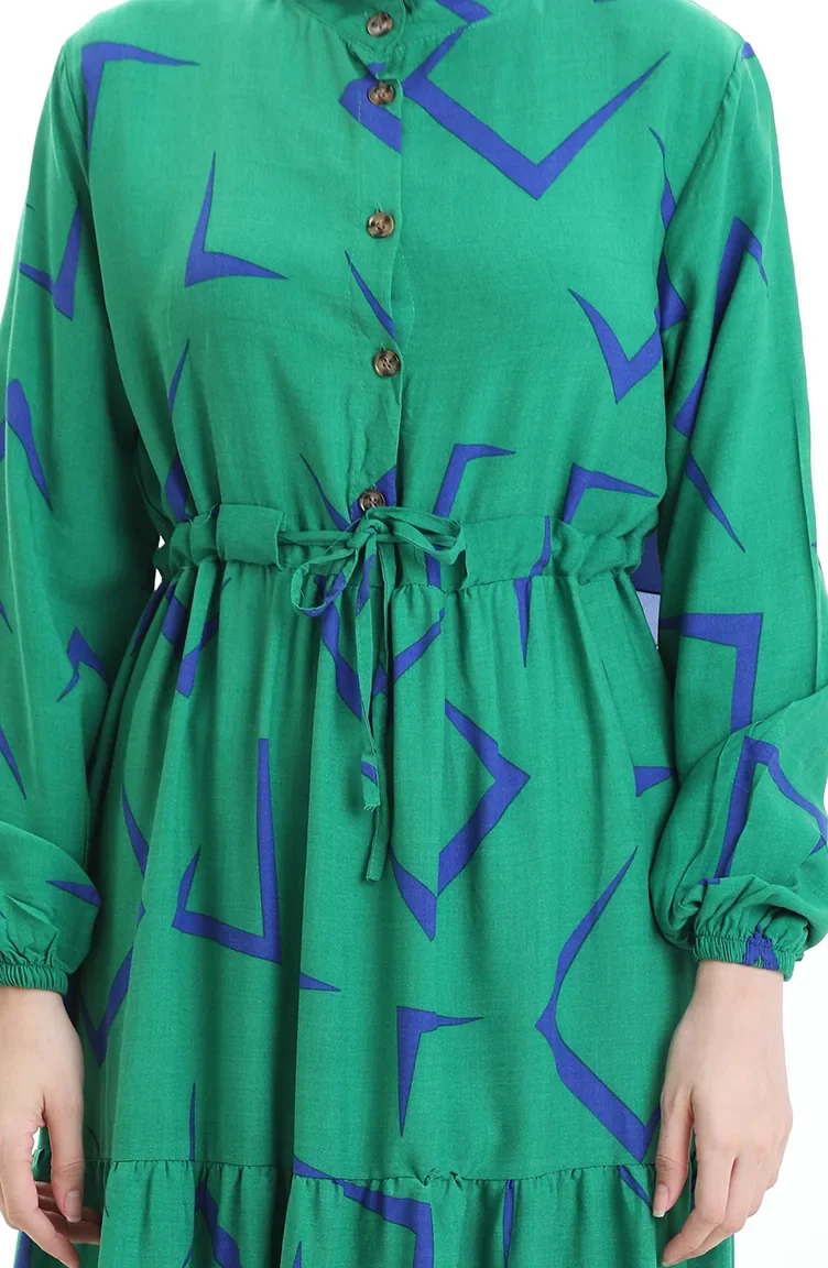Beli Bağcıklı Düğmeli Desenli Elbise 2109-04 Zümrüt Yeşili Saks