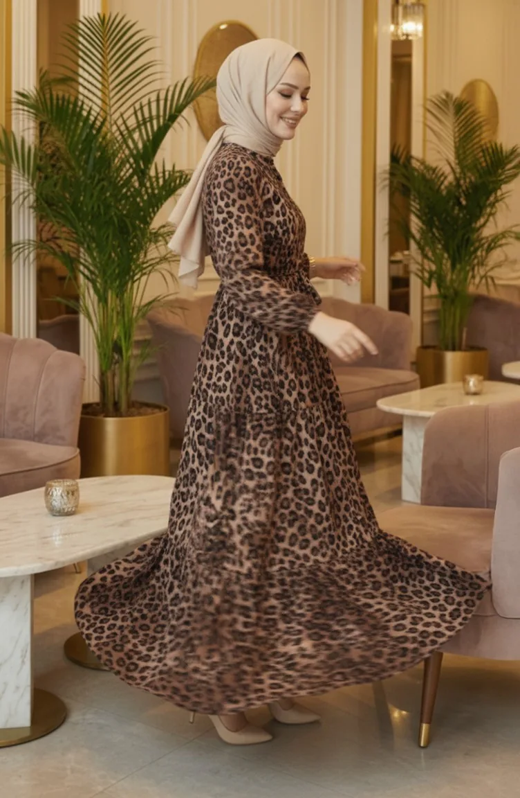 Beli Tünelli Leopar Elbise 7130-02 Kahverengi