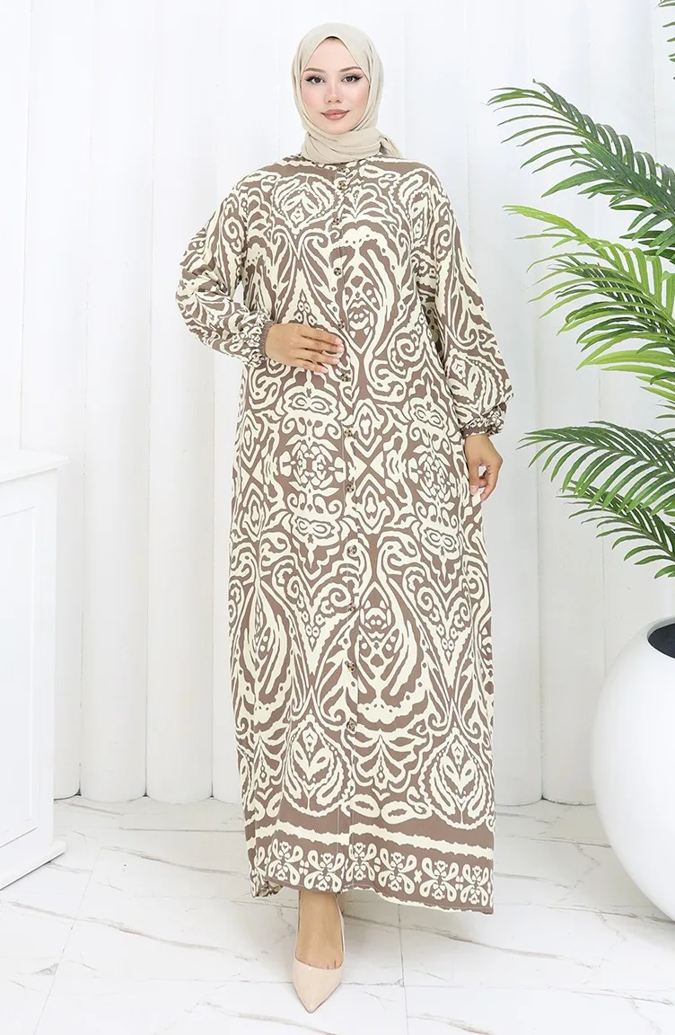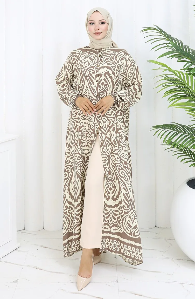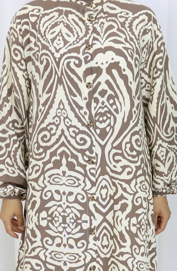 Kahverengi renktedir. Viskon kumaş. Desenli kumaş. Düğmeli. Lastik kollu. Hakim yaka detayı ile kullanışlı modeldir. 4 Mevsim tercih edebilirsiniz. Rahat. Büyük beden seçeneği mevcuttur.
