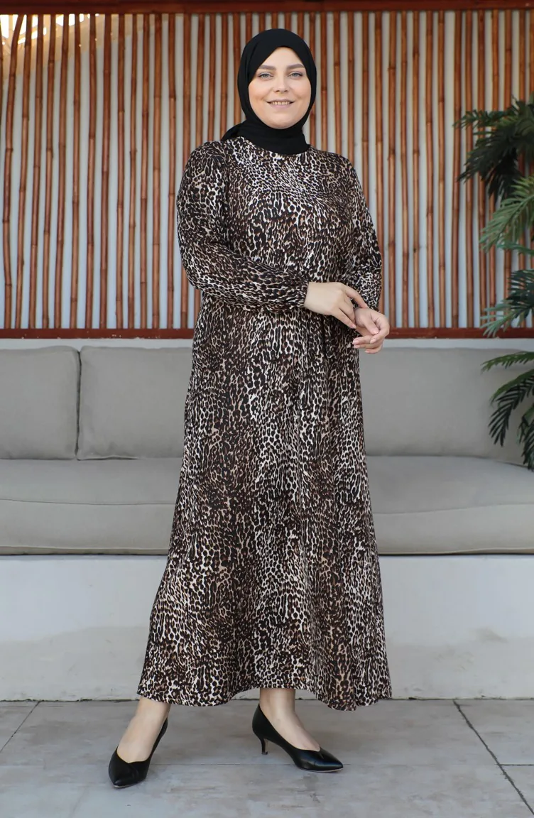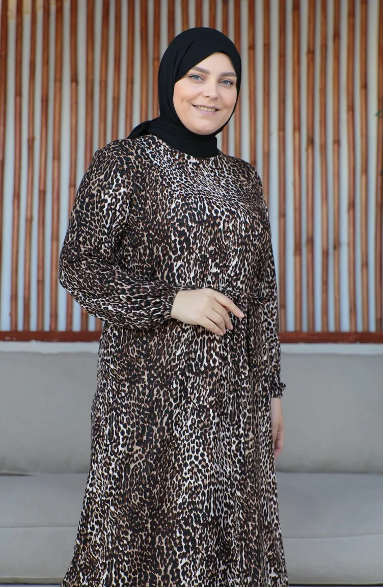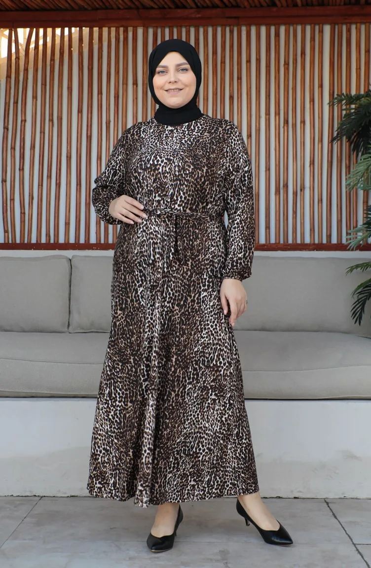 Büyük Beden Kuşaklı Elbise 4579F-01 Kahverengi