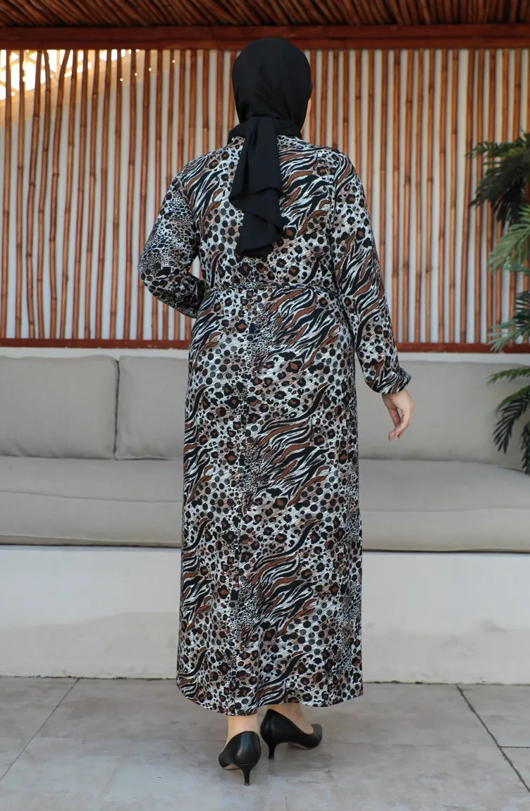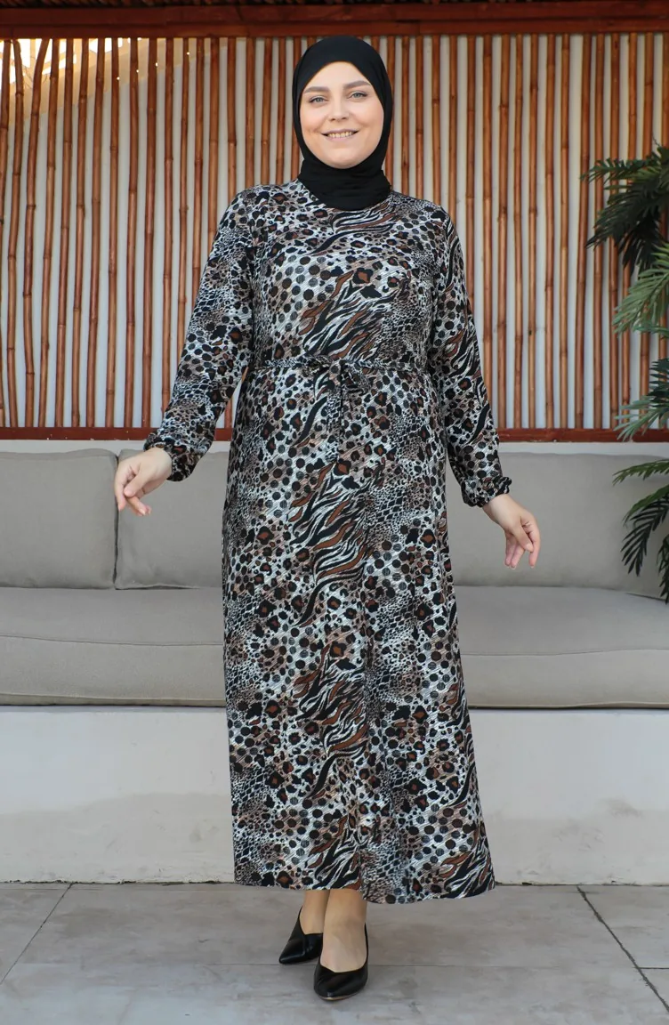 Büyük Beden Kuşaklı Elbise 4579G-01 Kahverengi