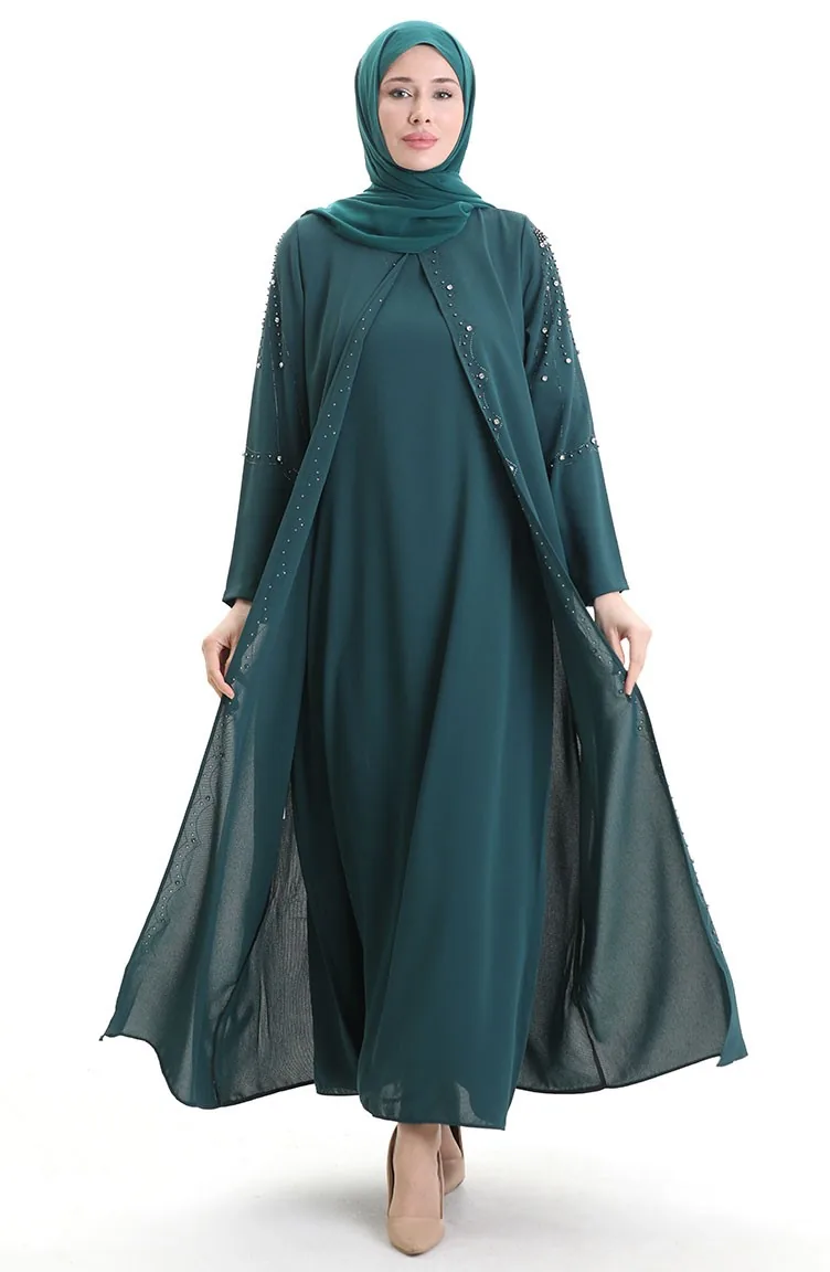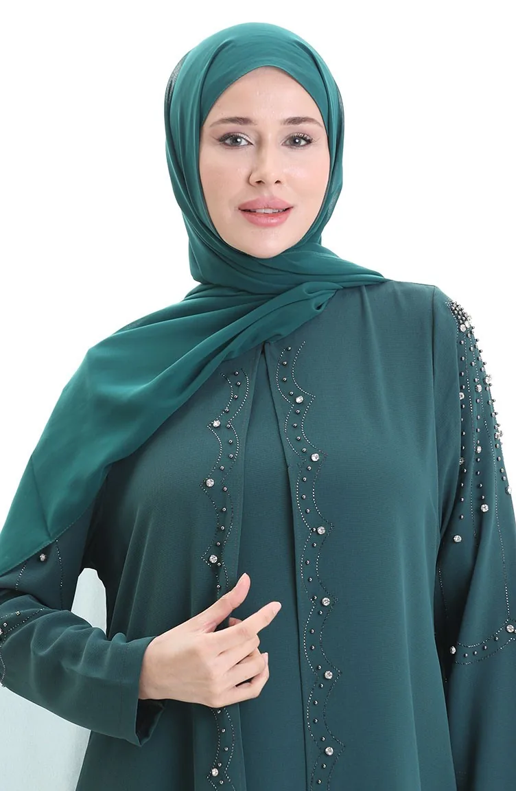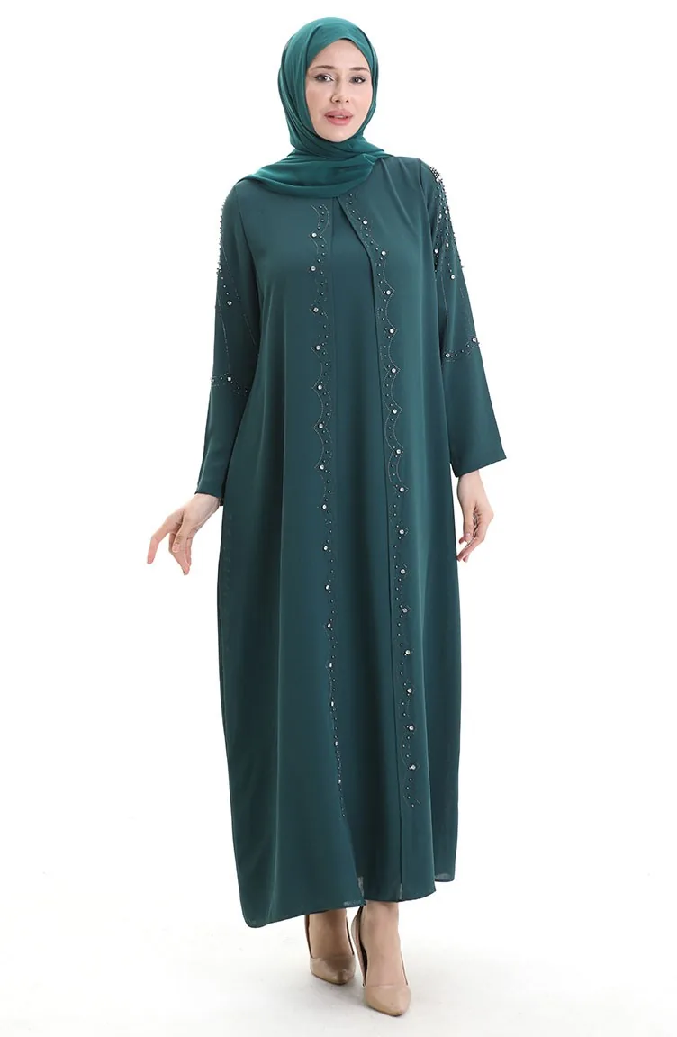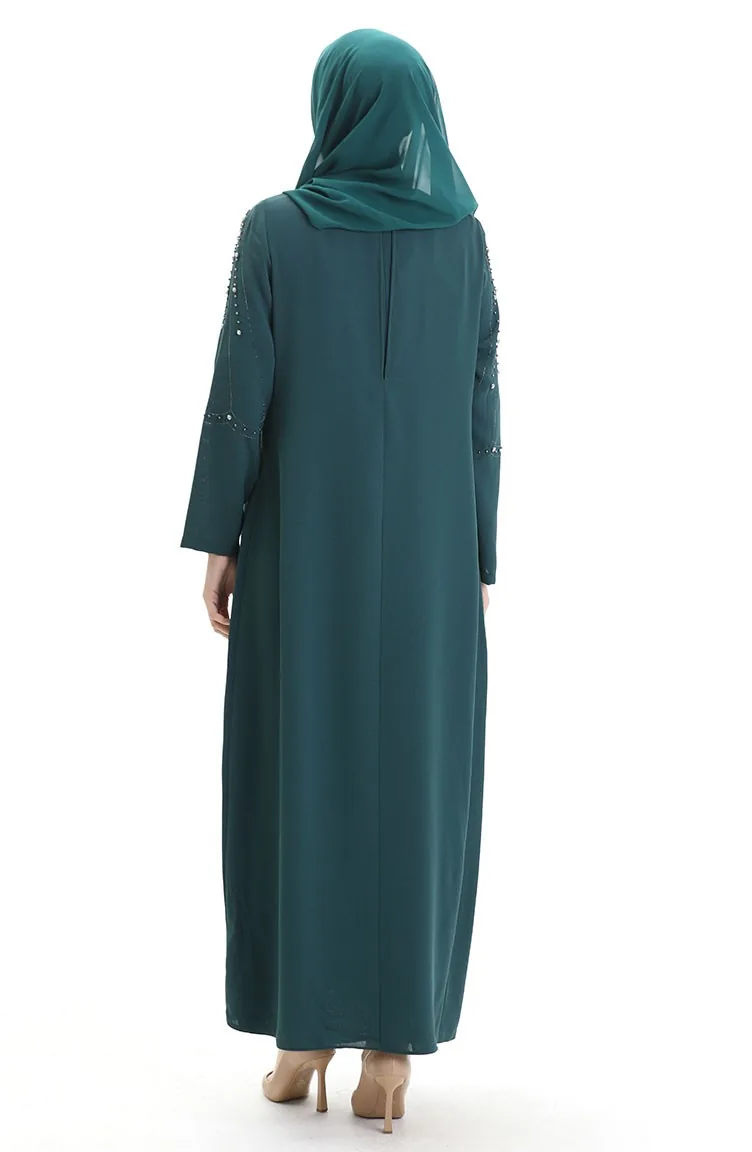 Büyük Beden Petek Kumaş Taşlı Elbise 6246-07 Zümrüt Yeşili