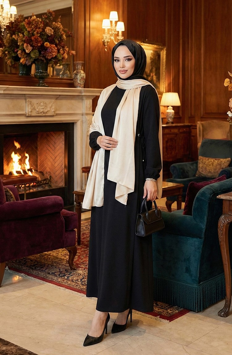 Hijab (tesettür) stilinin en zarif ve en rahat modest dress (elbise) modellerinden biri: siyah beli büzgülü elbise. Islamic clothing (İslami giyim) anlayışına uygun bol kesim (kloş) kalıbı, dökümlü krep (veya polyester) kumaşıyla birleşir.