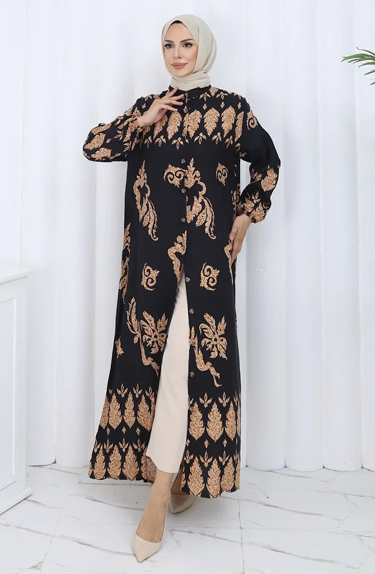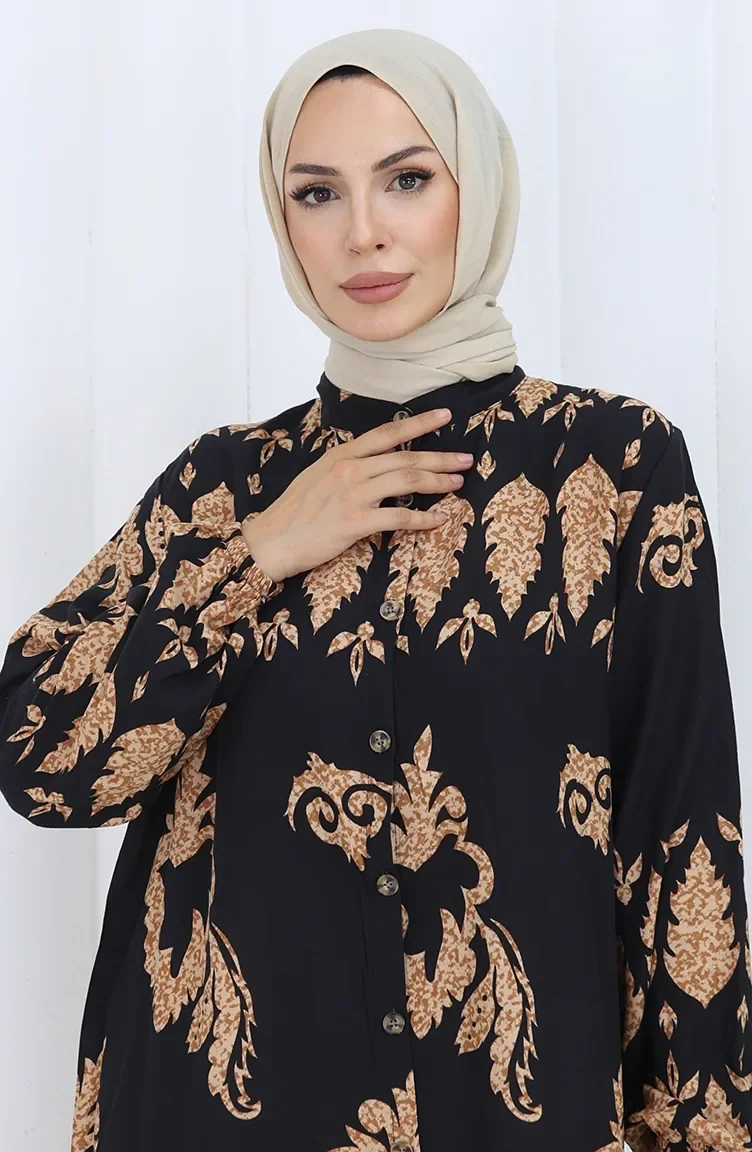 Siyah renktedir. Viskon kumaş. Desenli kumaş. Düğmeli. Lastik kollu. 4 Mevsim tercih edebilirsiniz. Büyük beden seçeneği mevcuttur.