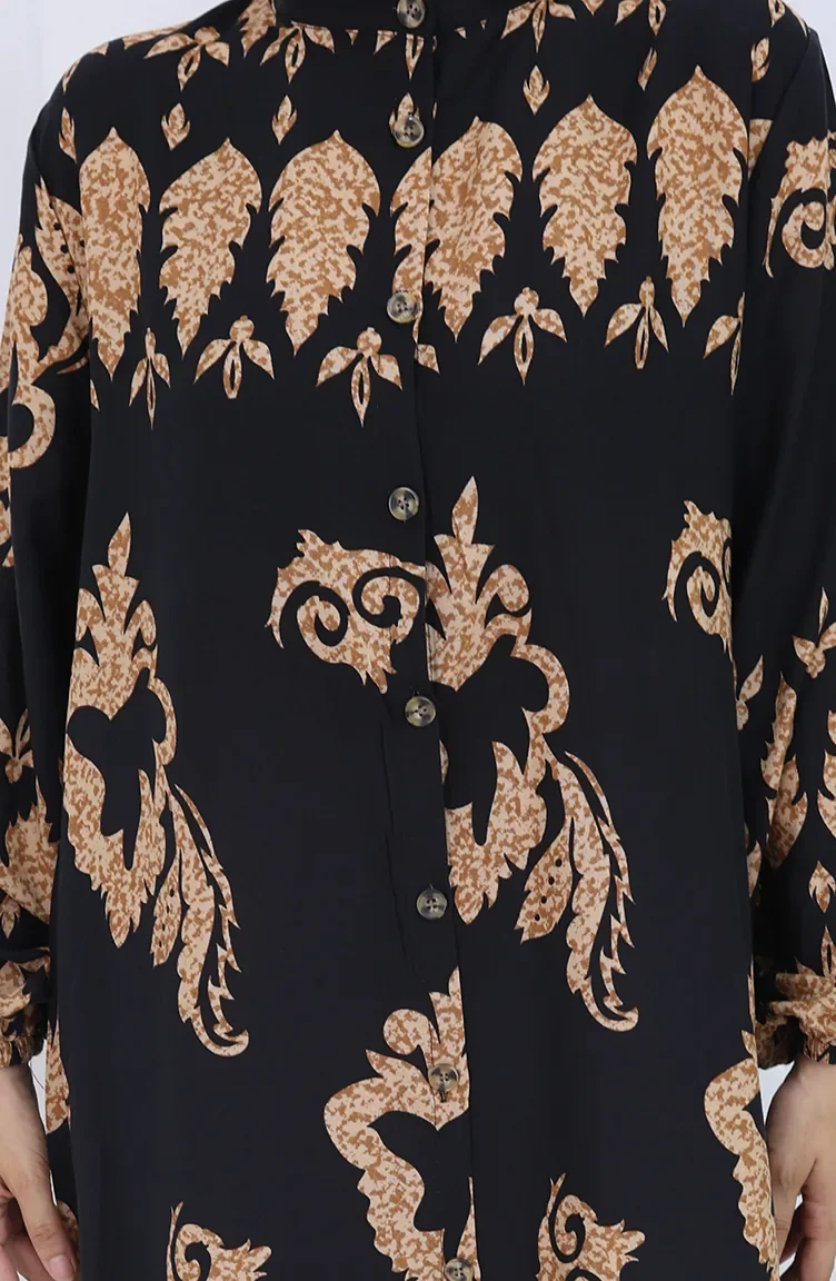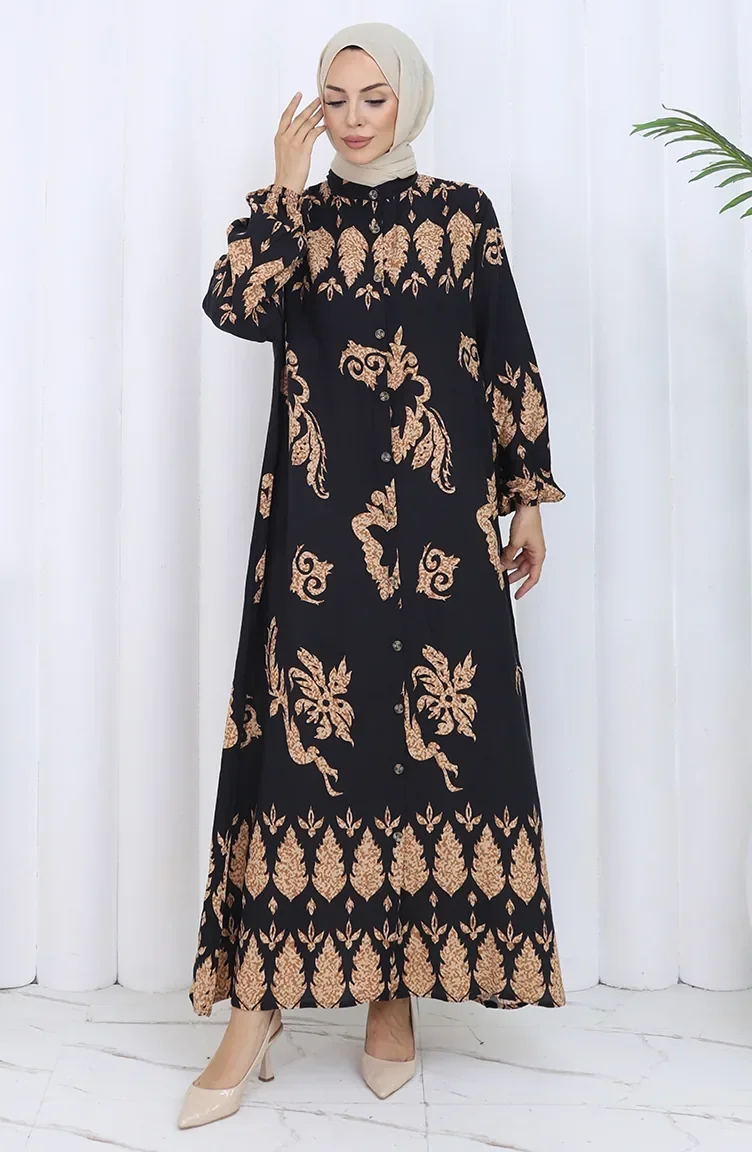 Desenli Düğmeli Elbise 2125-01 Siyah Bej