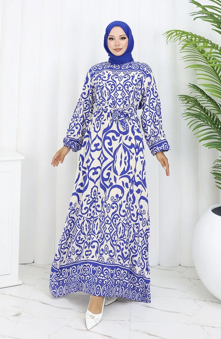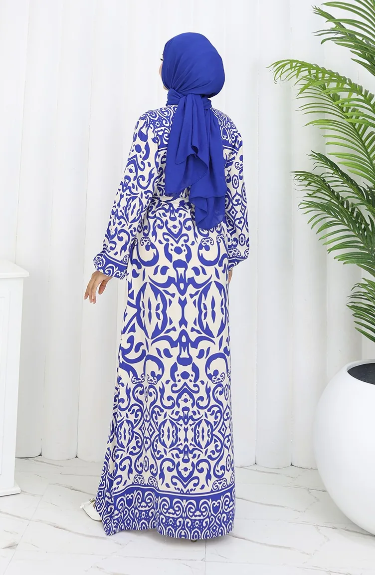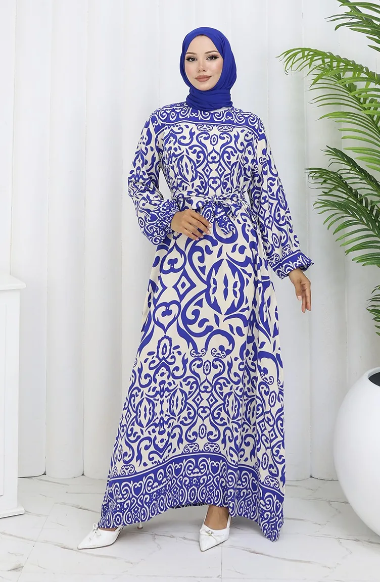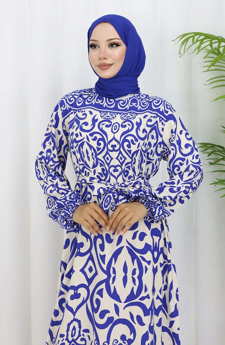 Desenli Kuşaklı Elbise 2091-02 Beyaz Lacivert