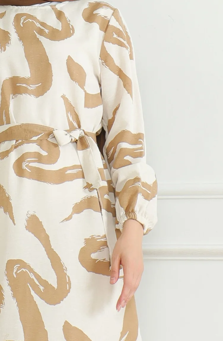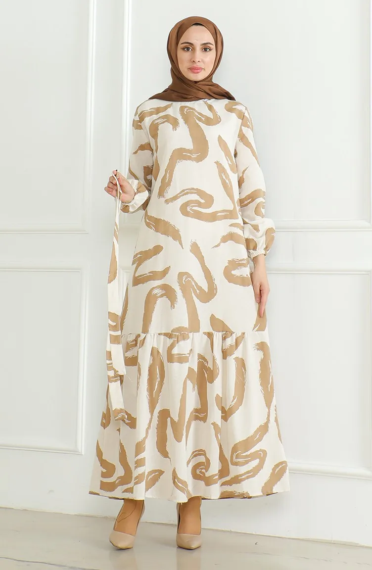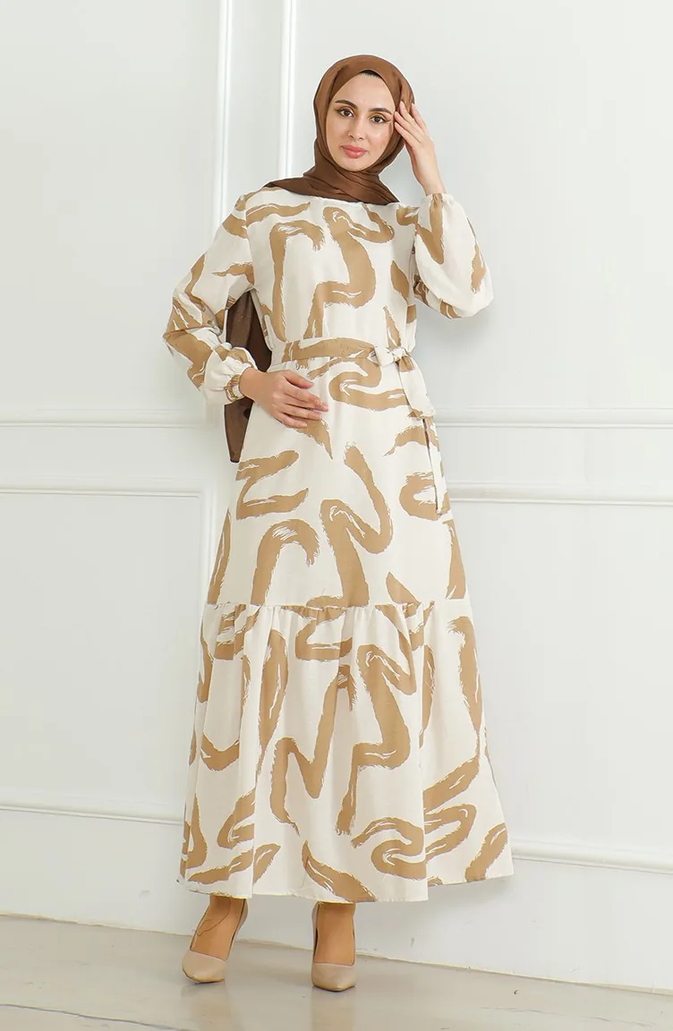 Desenli Kuşaklı Keten Elbise 0471A-05 Bej Sütlü kahve