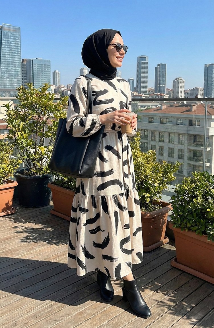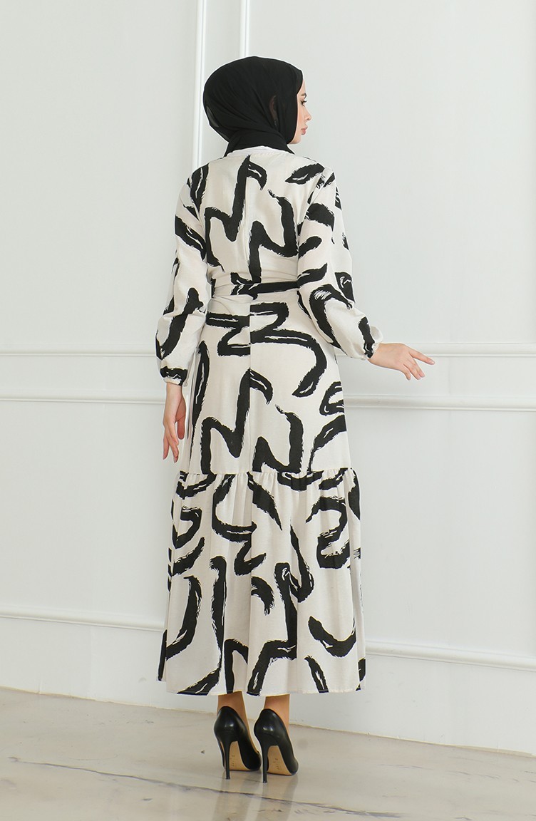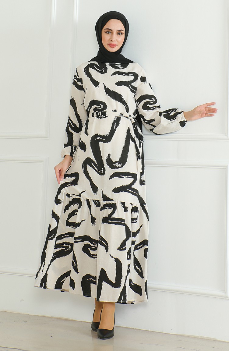 Desenli Kuşaklı Keten Elbise 0471A-06 Bej Siyah