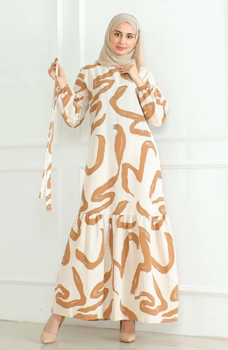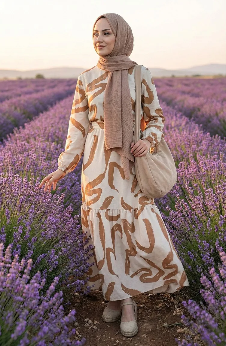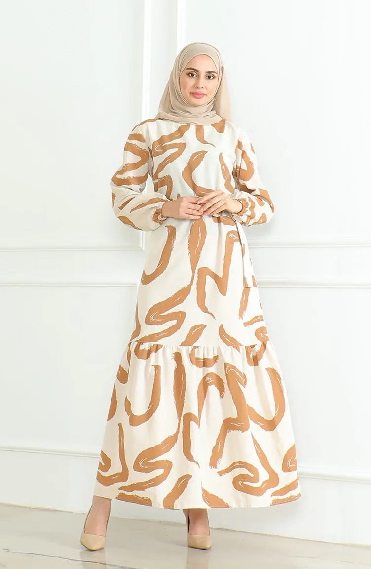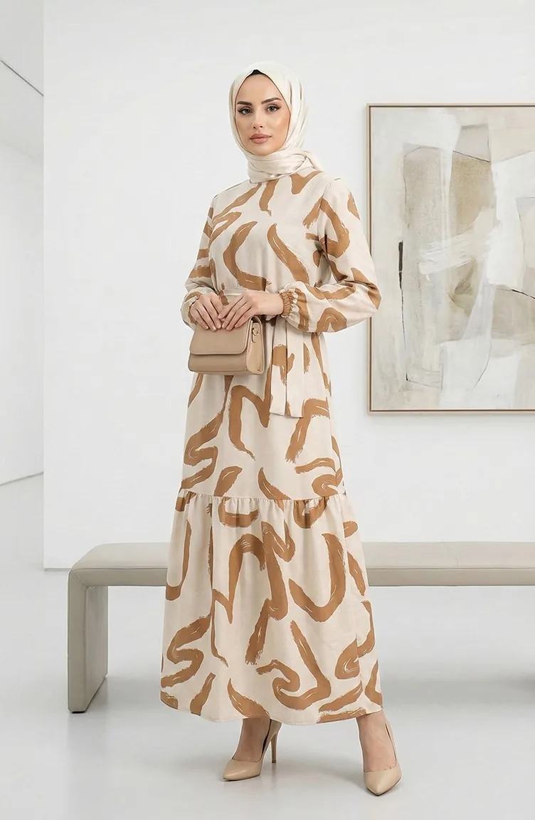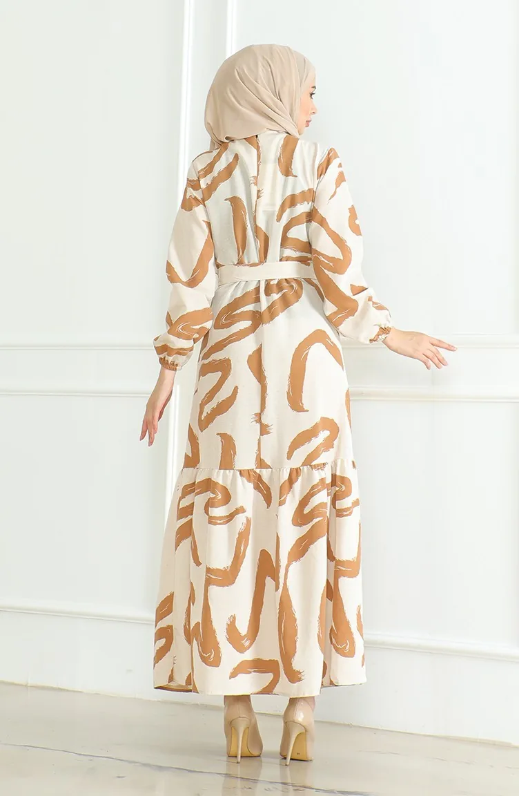 Desenli Kuşaklı Keten Elbise 0471A-08 Bej Taba