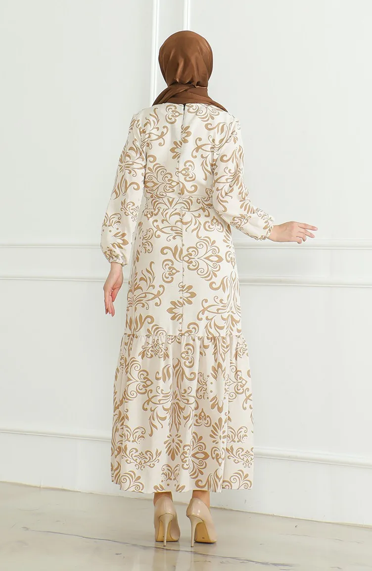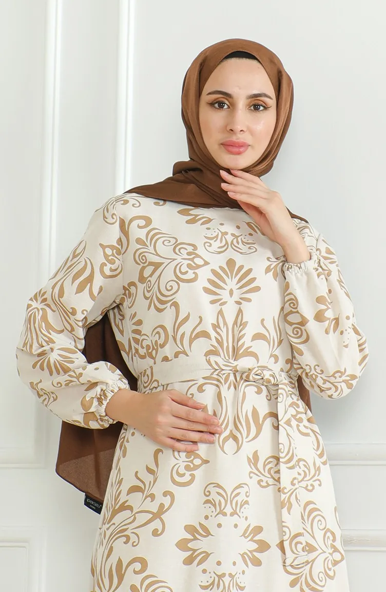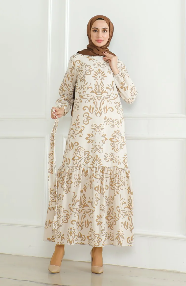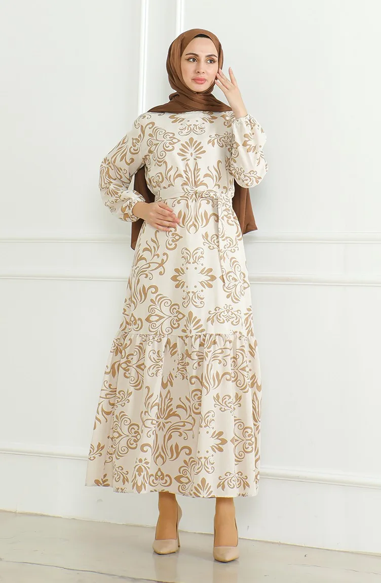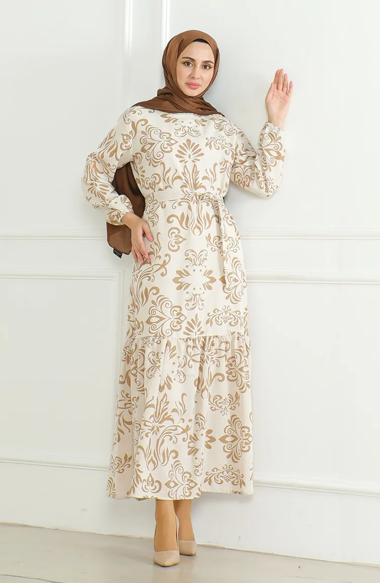 Desenli Kuşaklı Keten Elbise 0471B-04 Bej Sütlü kahve