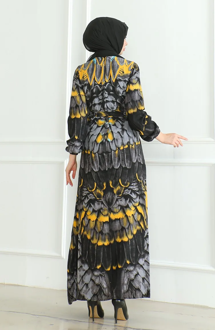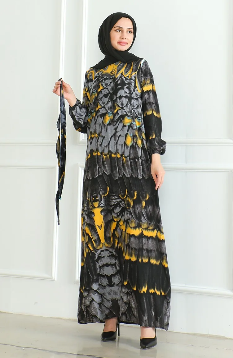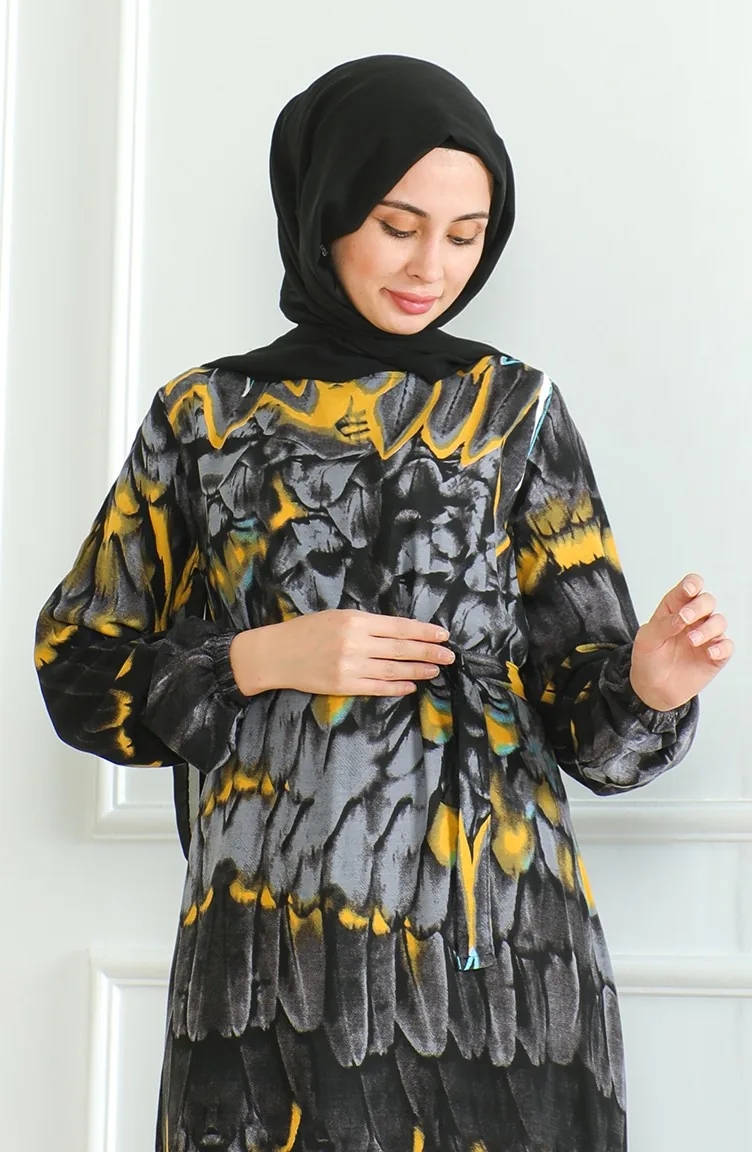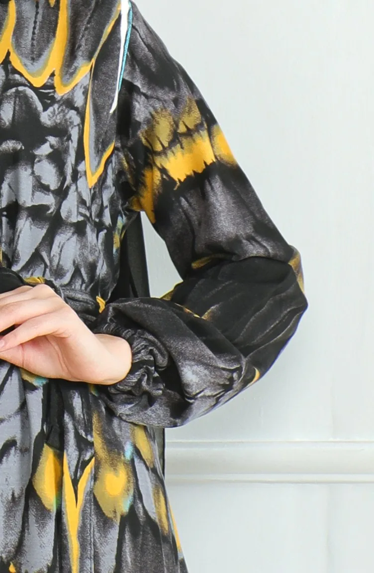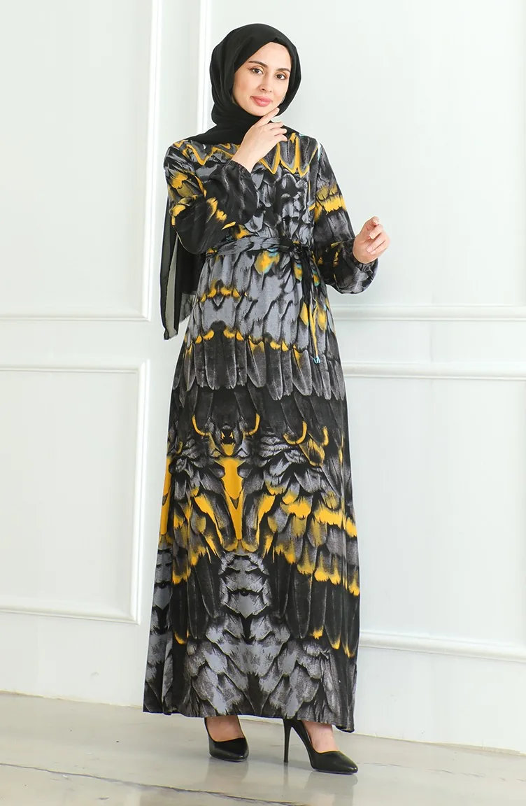 Desenli Kuşaklı Viskon Elbise 0496-03 Antrasit