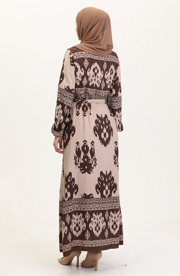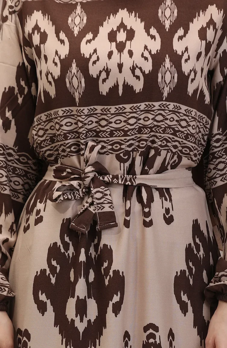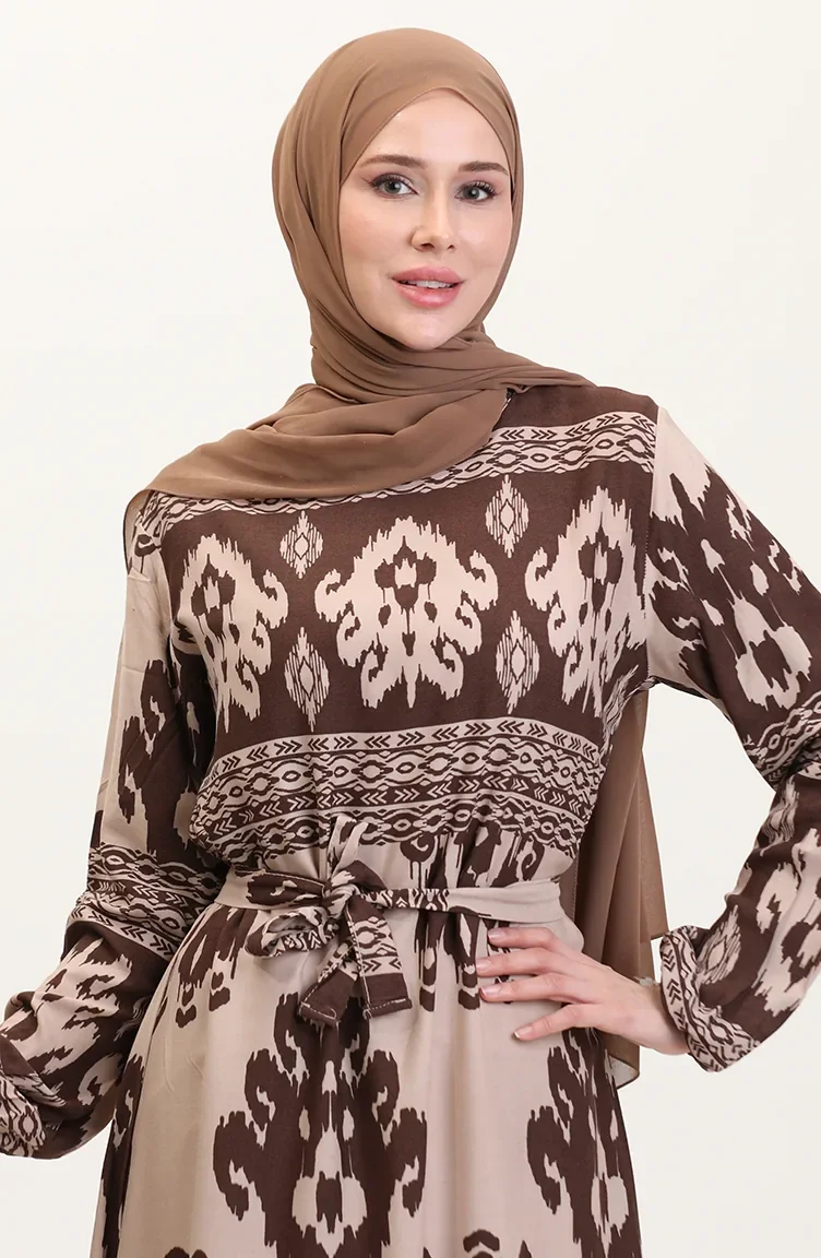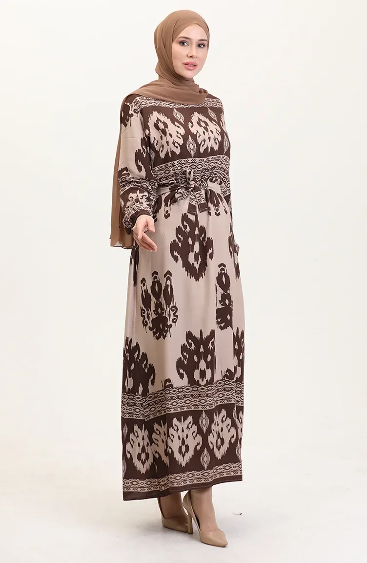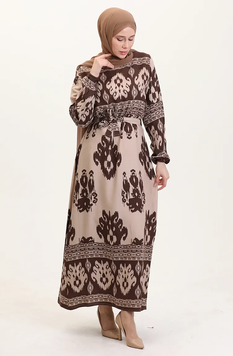 Desenli Viskon Elbise 0006-07 Kahve Sütlü Kahve