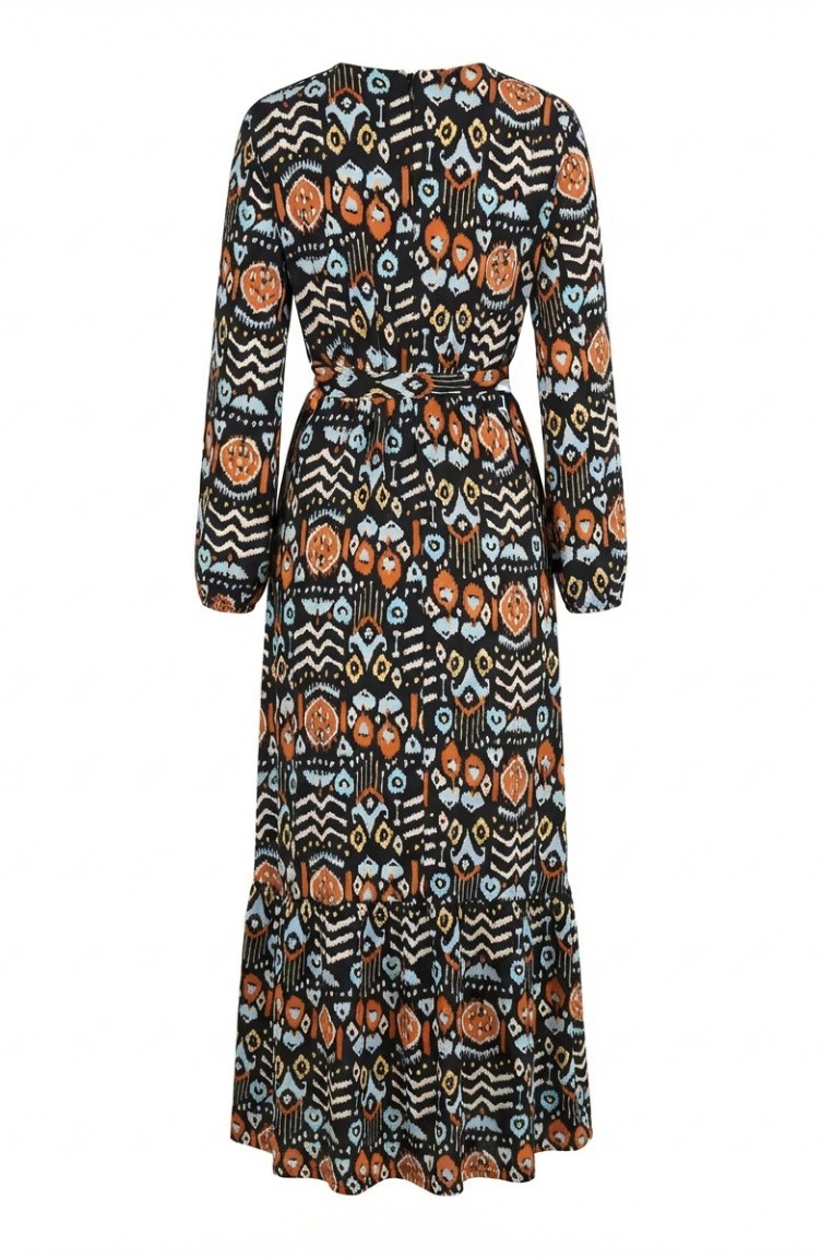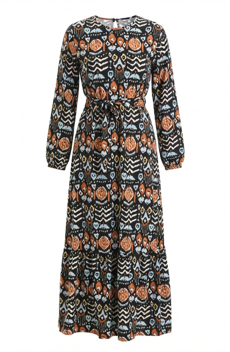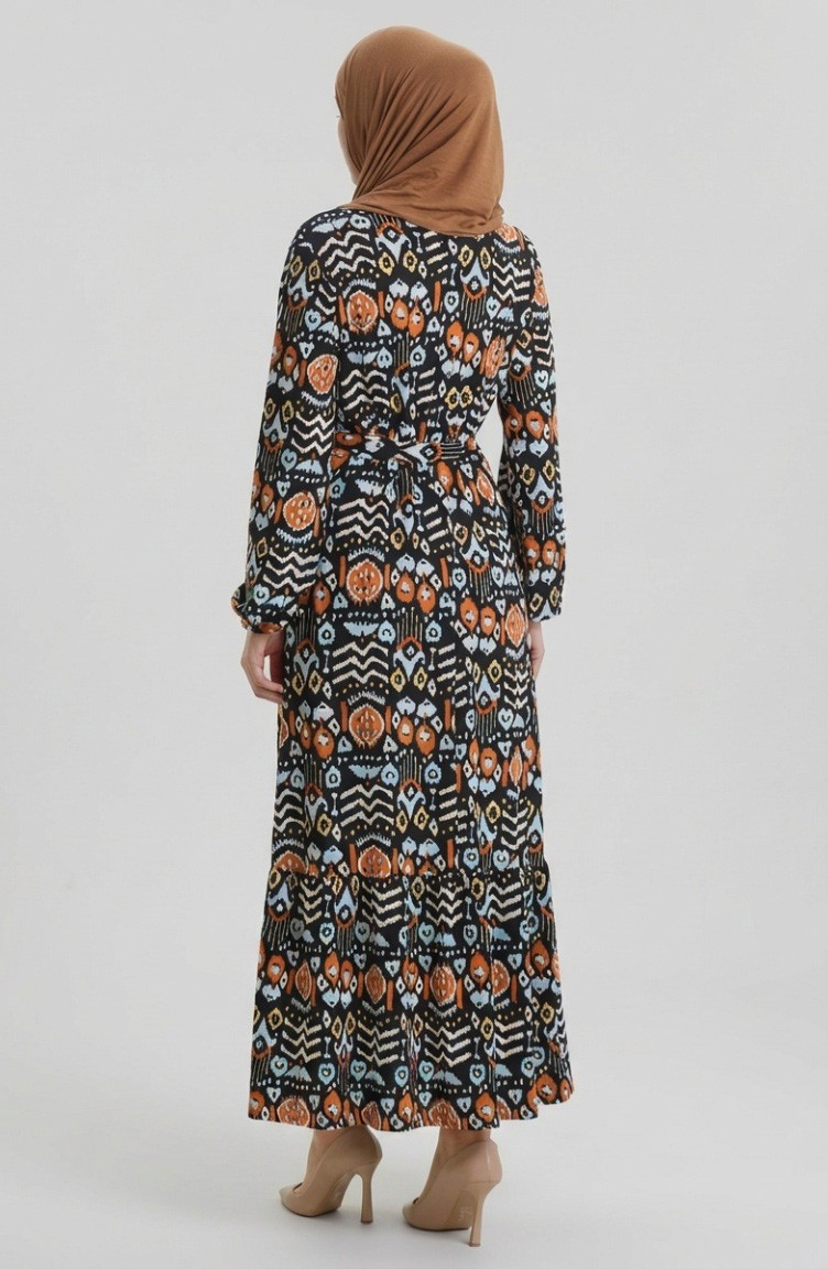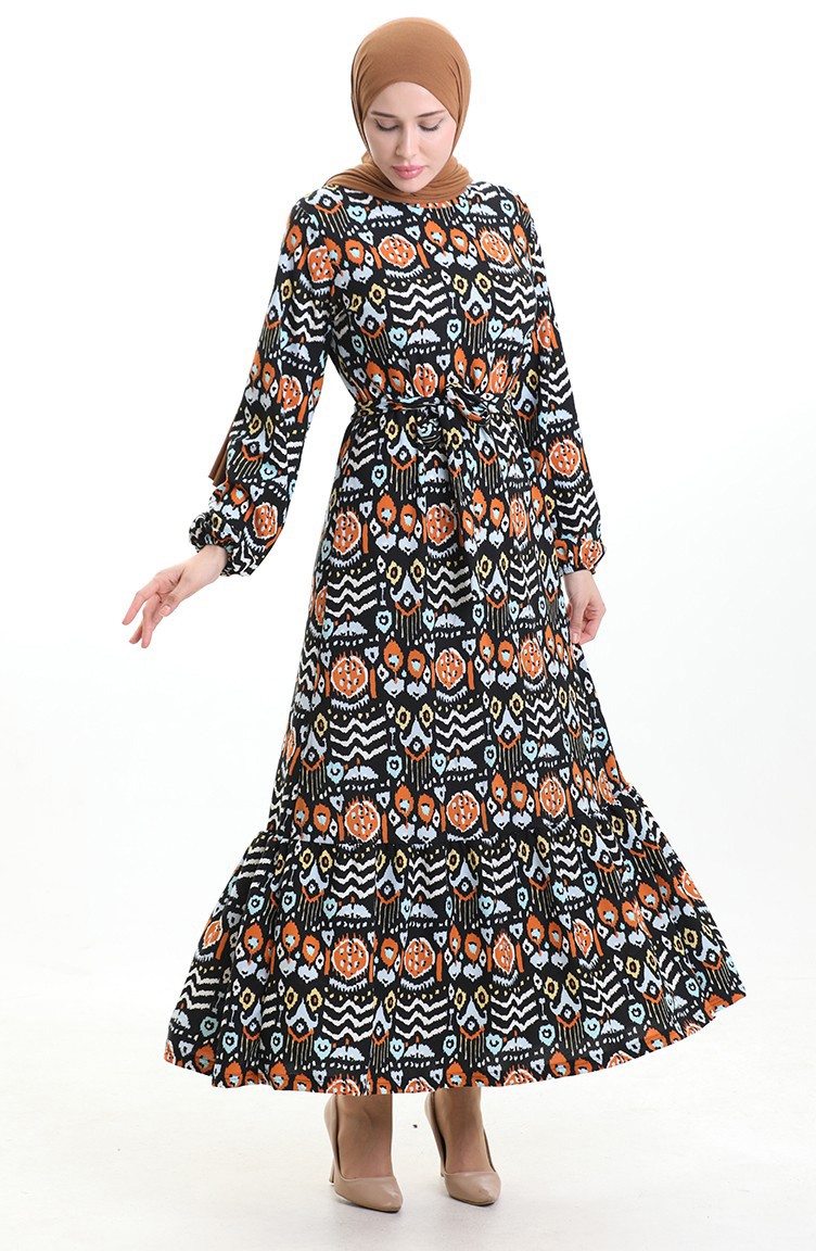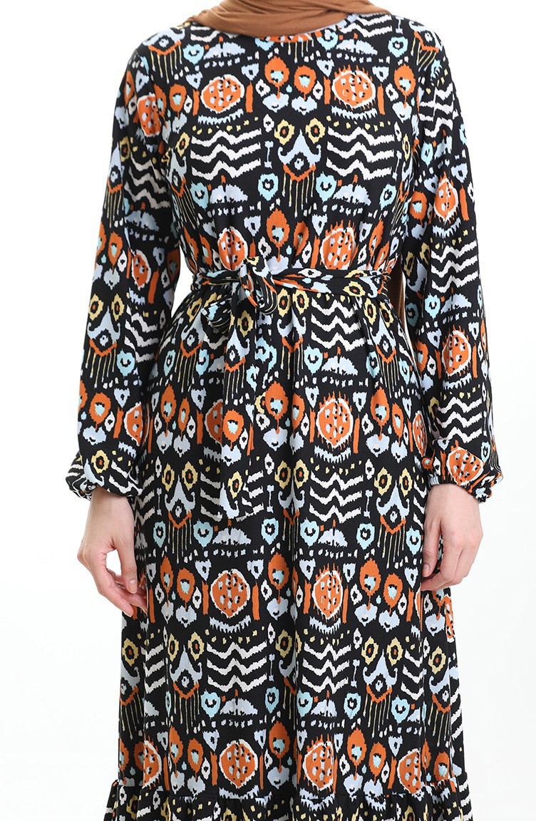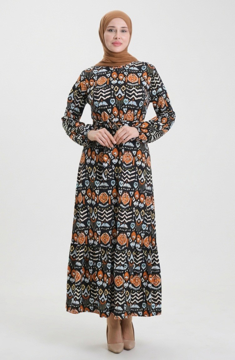 Dijital Baskılı Büzgülü Kuşaklı Elbise 1006-01 Siyah Kiremit