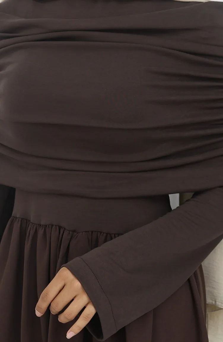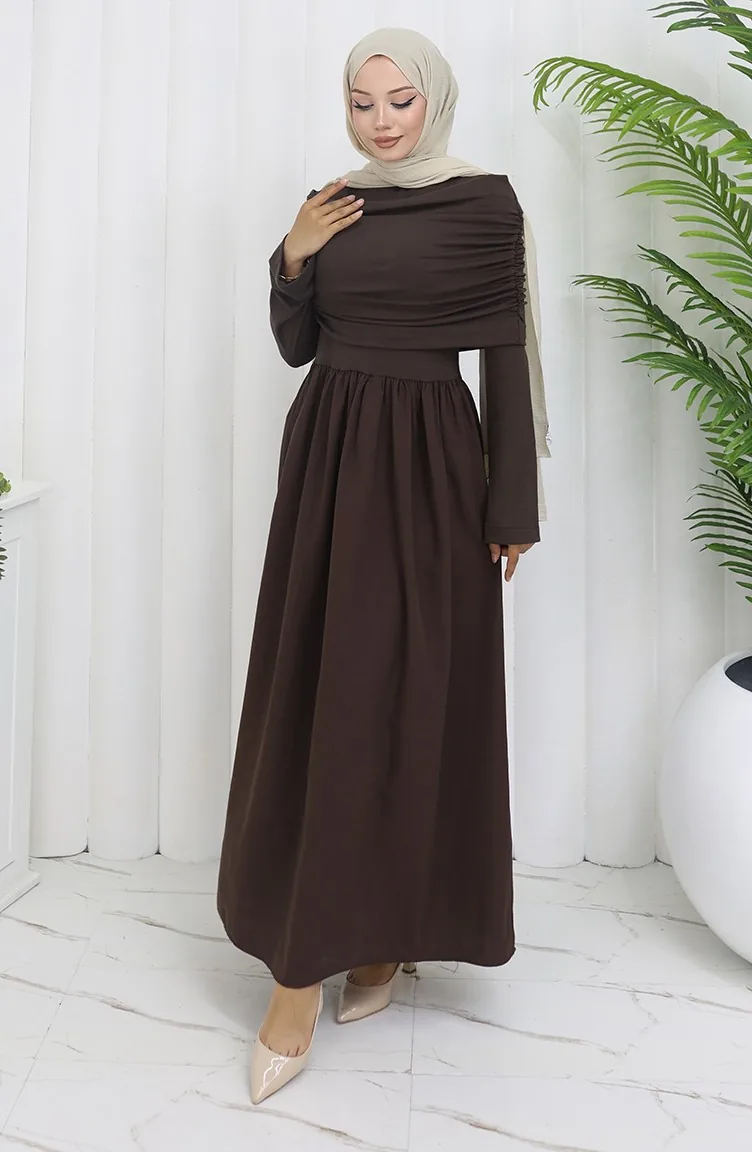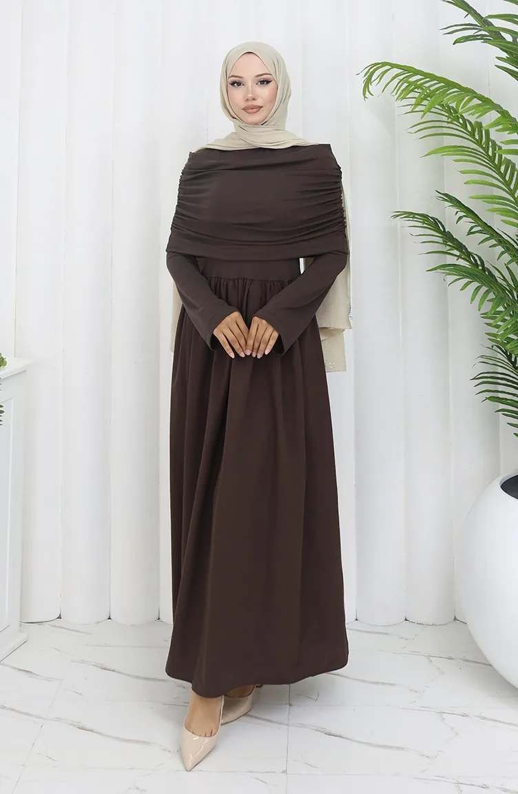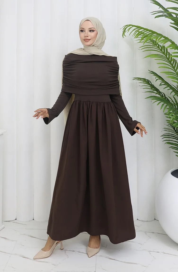 Drapeli Madonna Yaka Tesettür Elbise 81900-03 Kahverengi