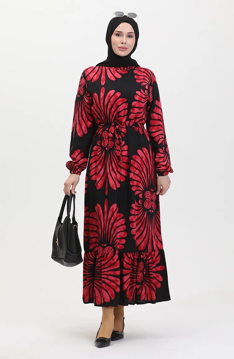 Eteği Fırfırlı Kemerli Elbise 50171-06 Bordo