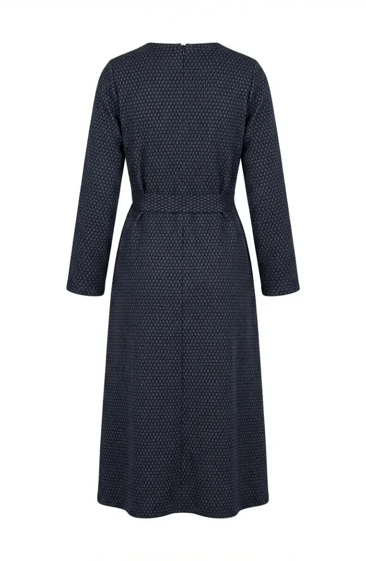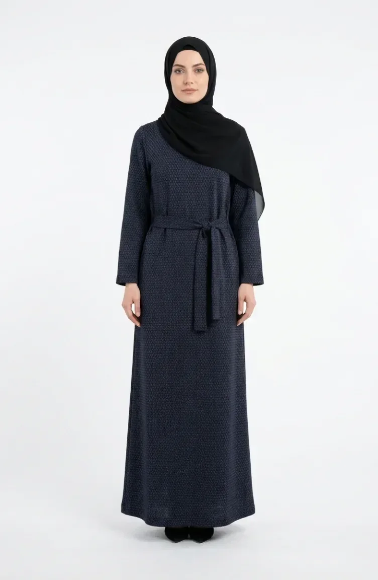 Geometrik Desenli Kuşaklı Tesettür Elbise 2222-02 Petrol