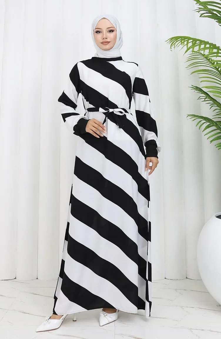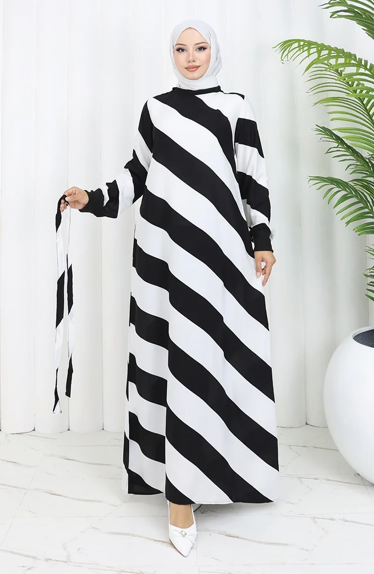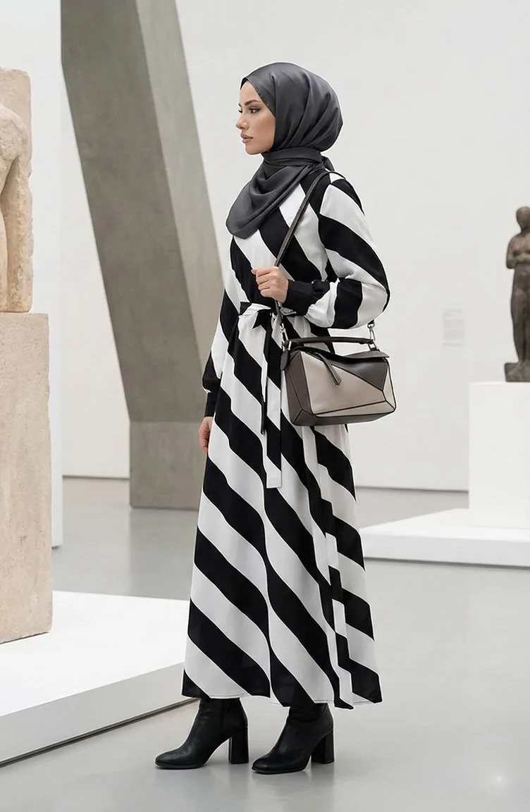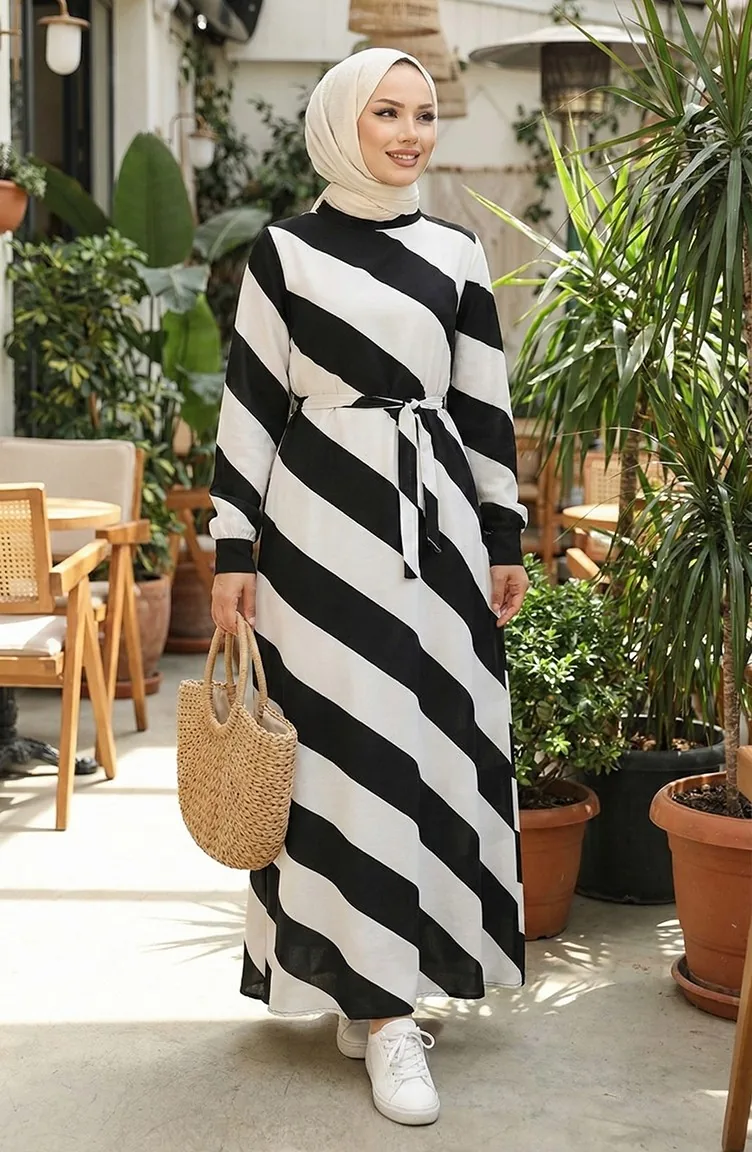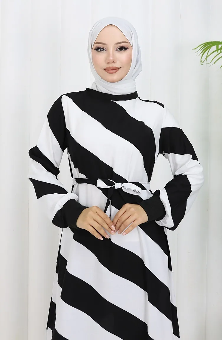 Hijab (tesettür) stilinde iddialı ve modern bir parça: siyah-beyaz çizgili elbise. Modest dress (elbise) koleksiyonunuza enerjik bir dokunuş katan bu islamic clothing (İslami giyim) parçası, sade bir sıfır yaka ile dengelenmiştir. Dökümlü Viskon Kumaşı (Pamuk/Polyester karışımlı) sayesinde 4 Mevsim (mevsimlik) kullanımda terletmez.