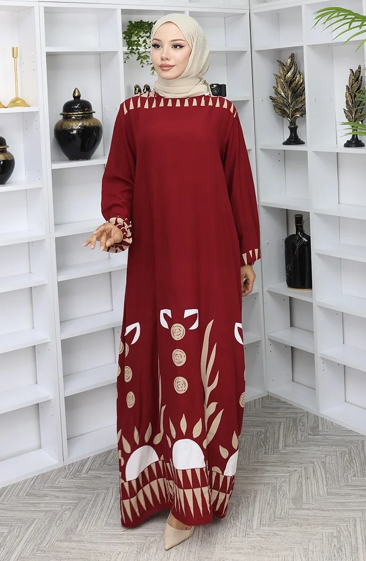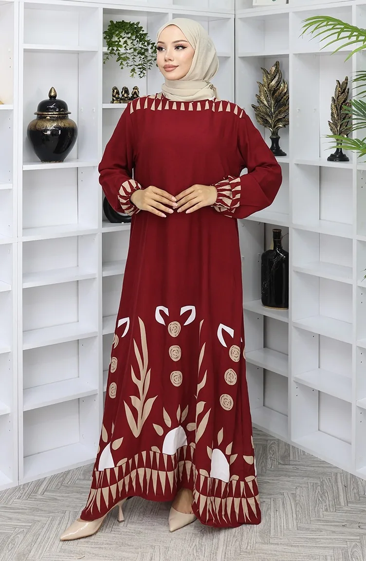 Kolu lastikli Desenli Elbise 0084-04 Bordo