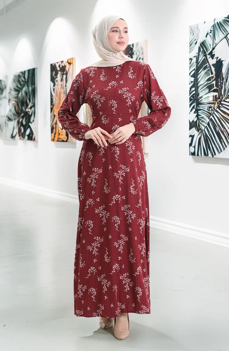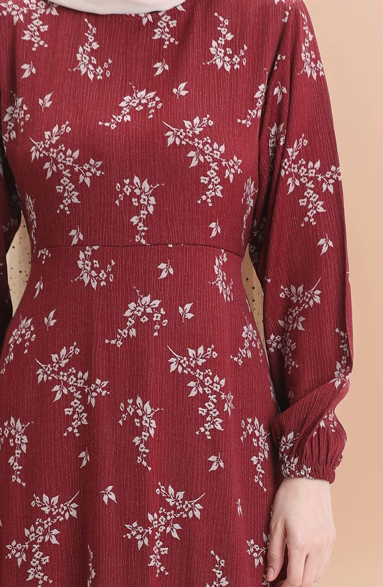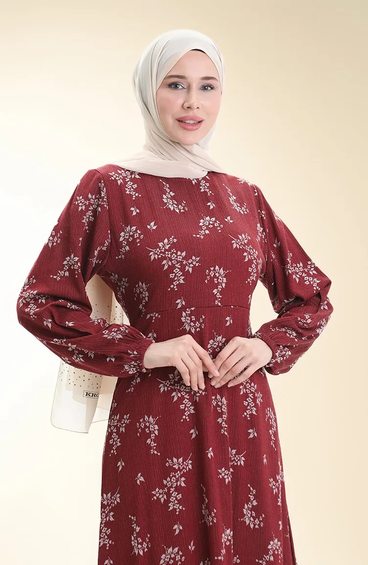 Kolu Lastikli Desenli Elbise 2047-05 Bordo