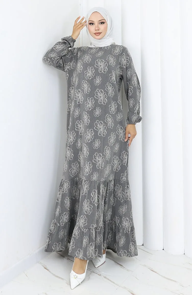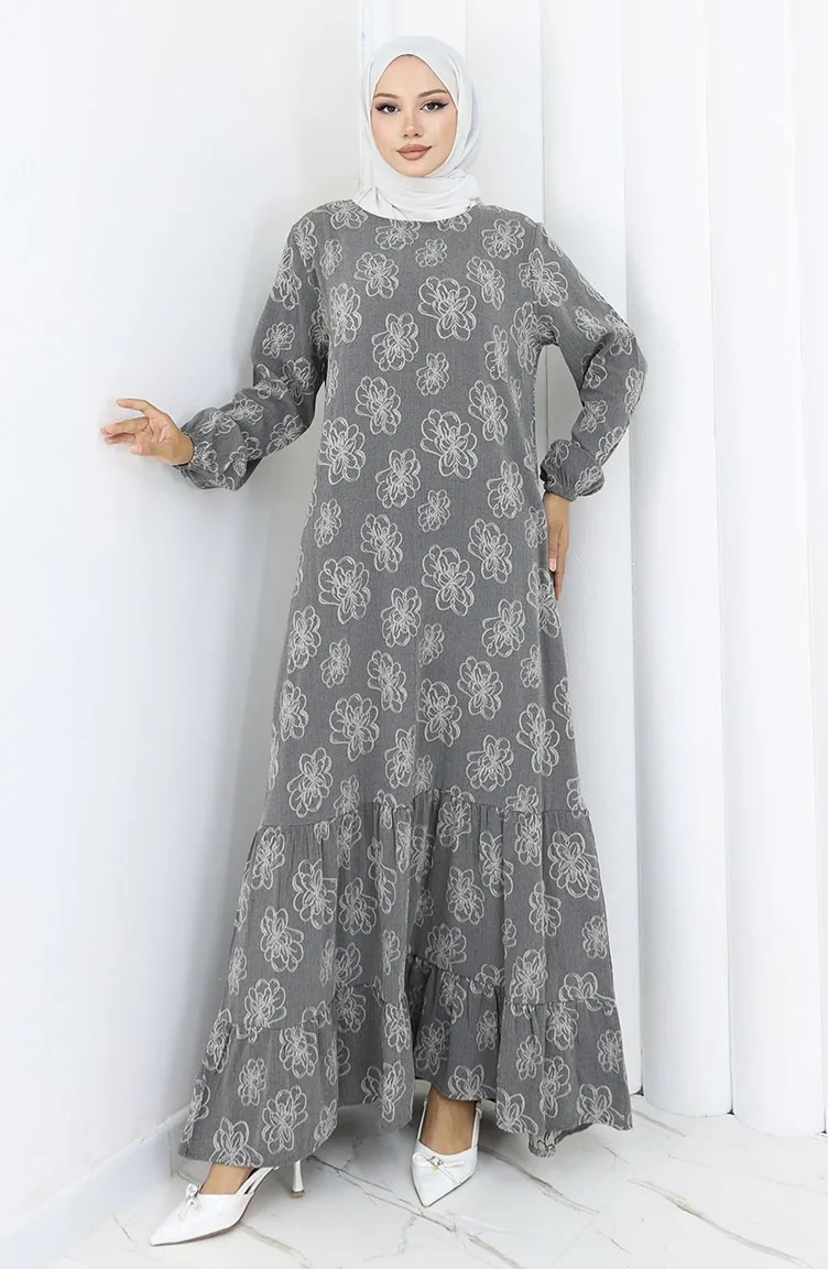Kolu lastikli Desenli Elbise 2056-03 Antrasit