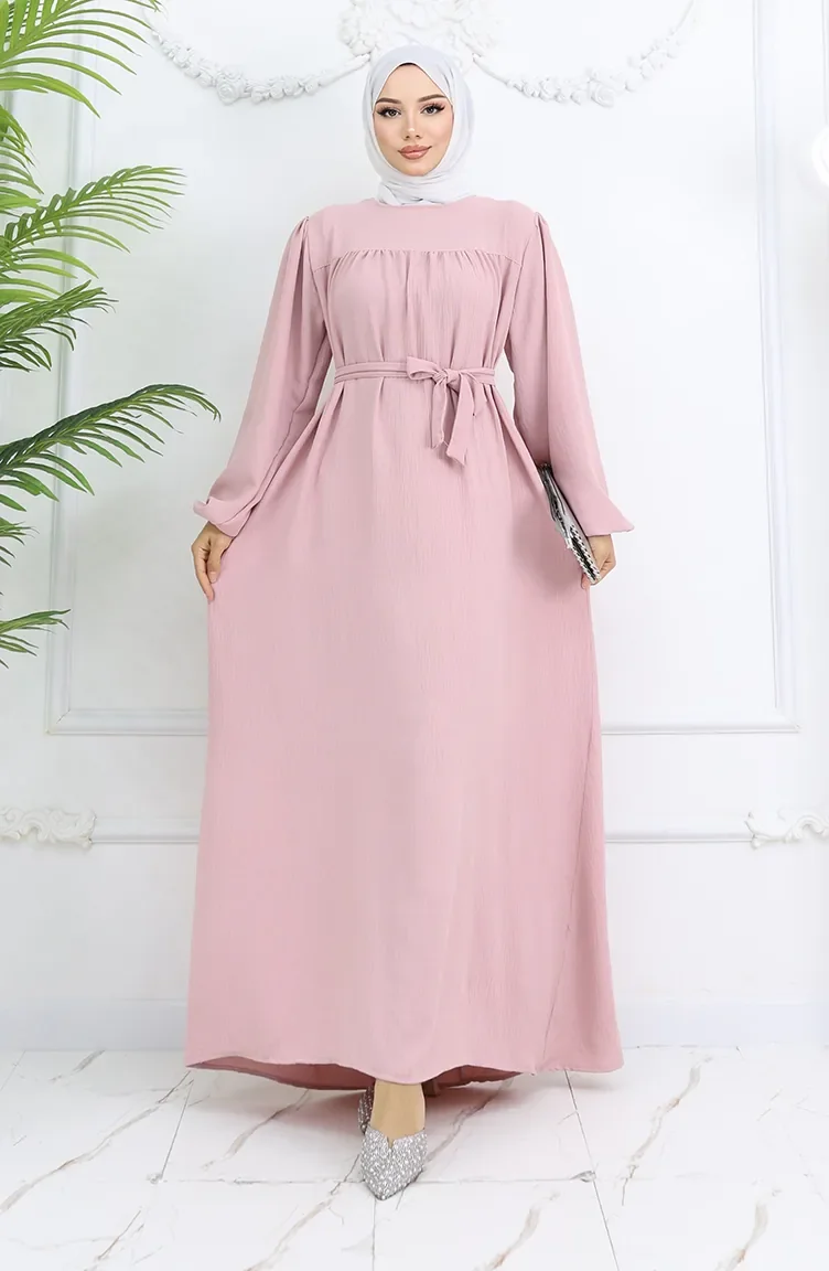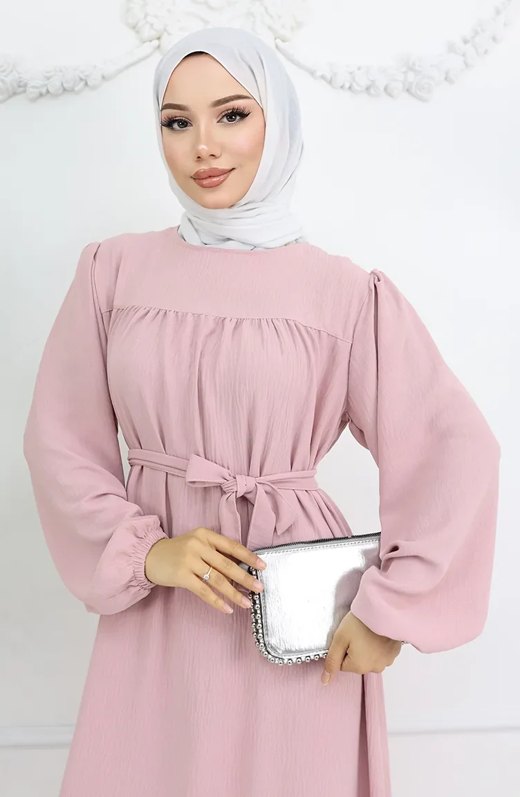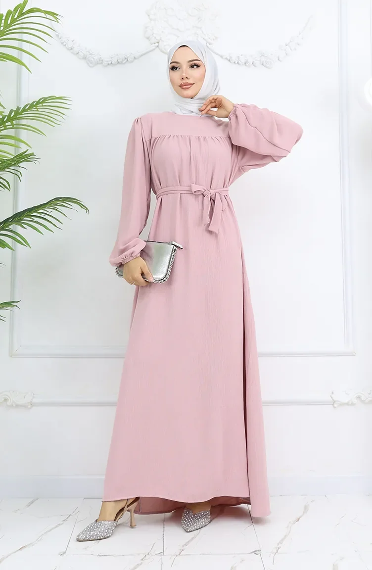 Krep Kumaş Kolu Lastikli Elbise 0029-09 Pudra