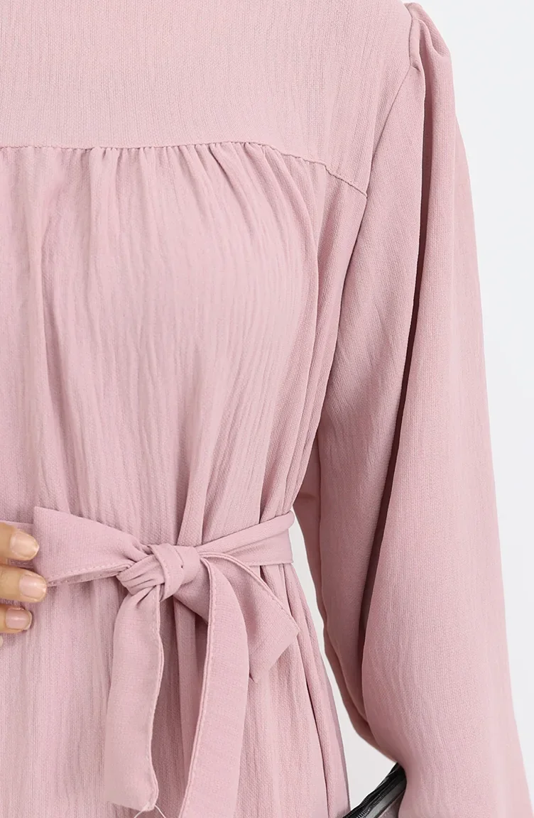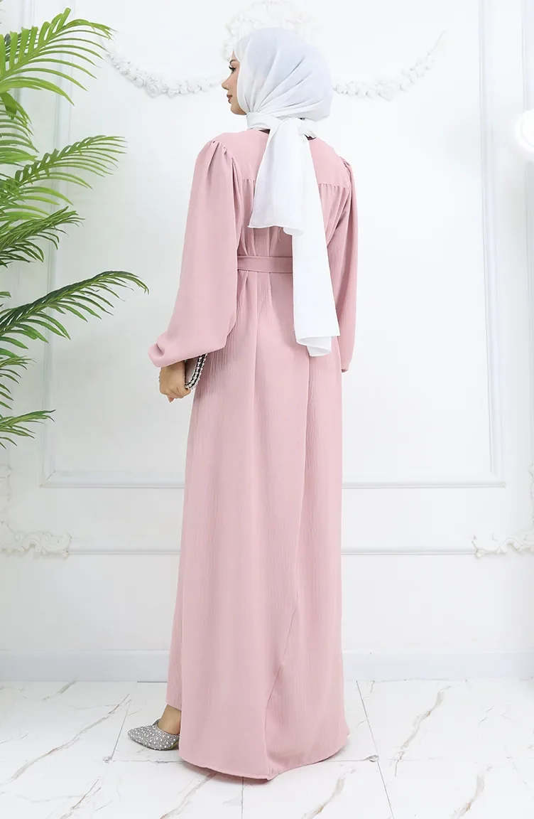 Pudra renktedir. Krep kumaş. Sade. Kuşaklı'dır. Lastik kollu. Sıfır yaka detayı ile rahat kullanıma sahiptir. 4 Mevsim tercih edebilirsiniz. Rahat. Büyük beden seçeneği mevcuttur.