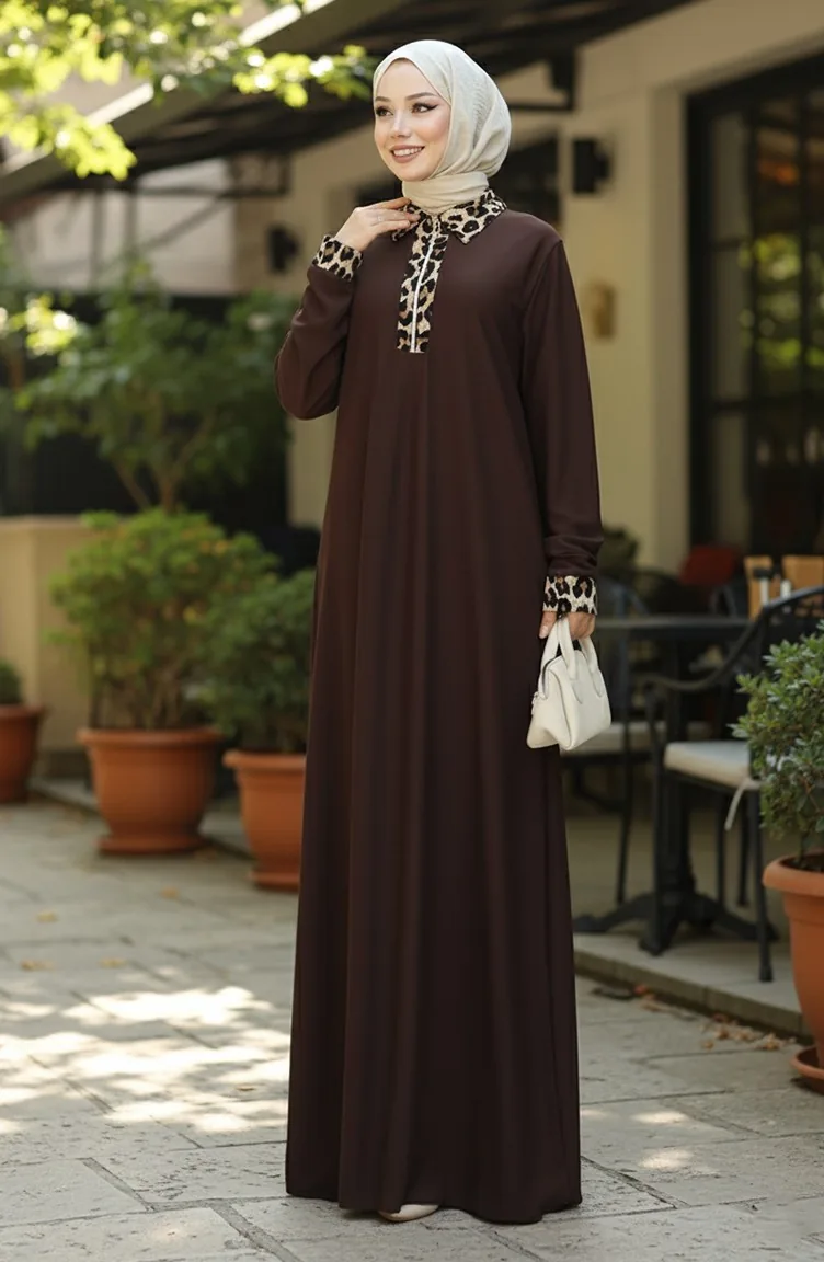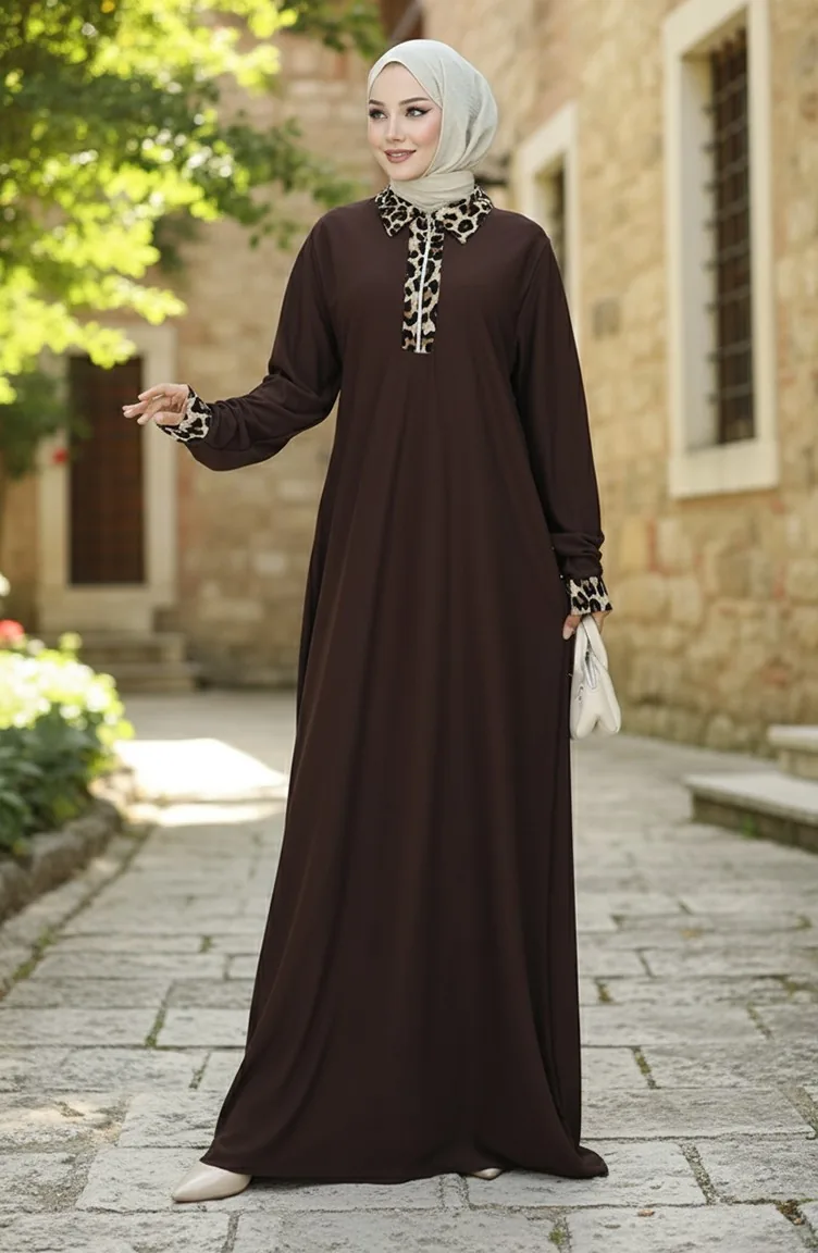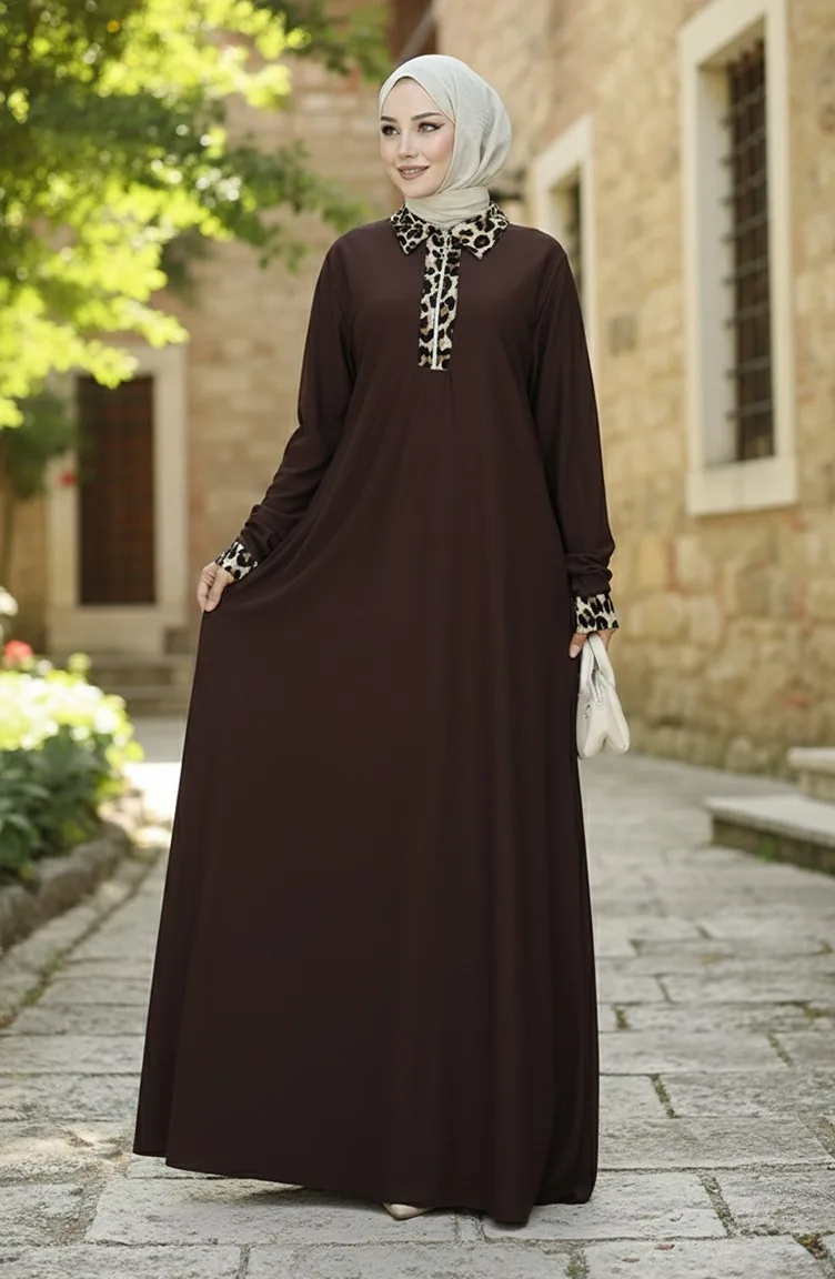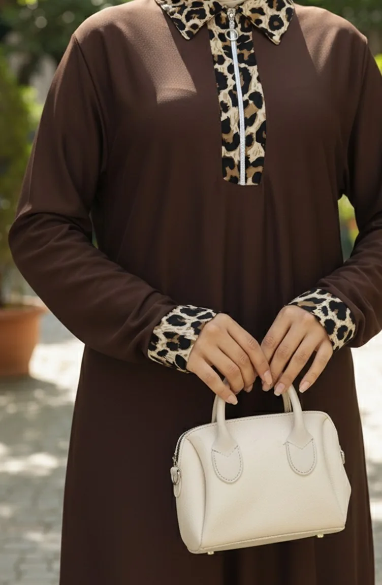 Kahverengi renktedir. Pamuk dokuma kumaş. Leopar desenli. Fermuarlı. Gömlek yaka detayı ile kullanışlı modeldir. 4 Mevsim tercih edebilirsiniz. Büyük beden seçeneği mevcuttur.