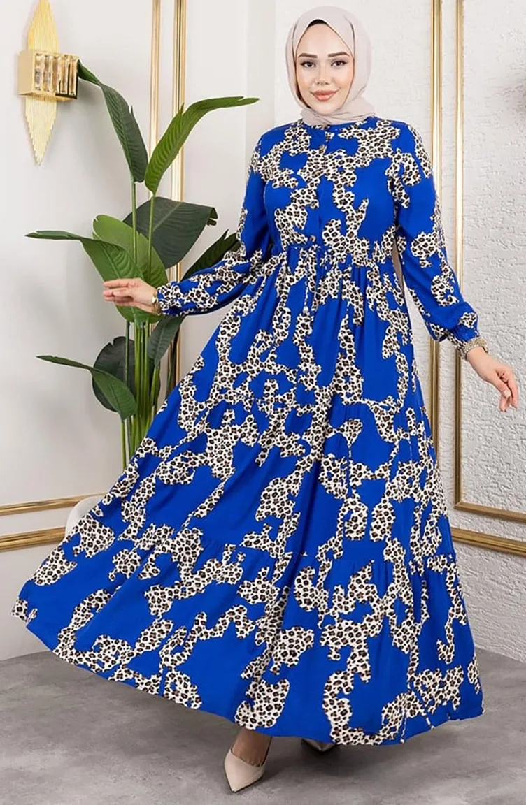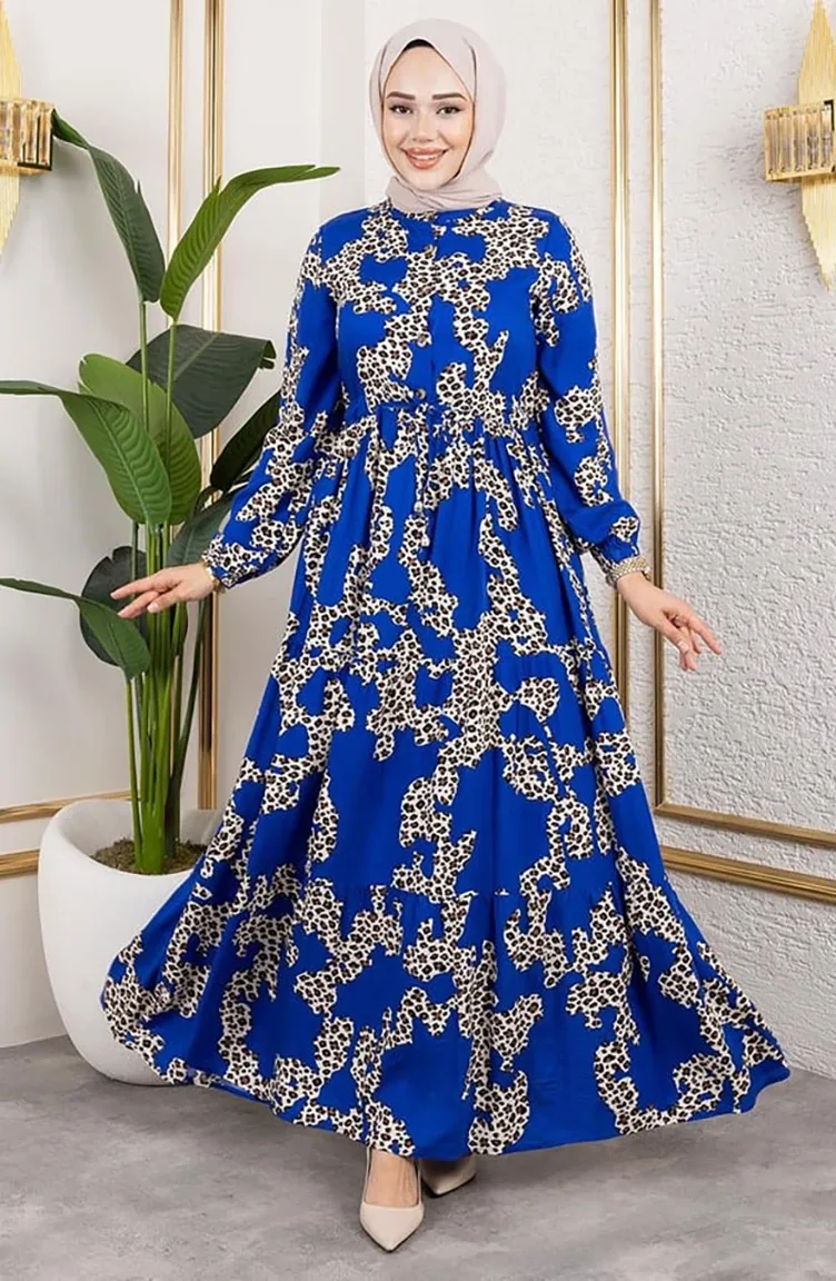 Leopar Desenli Viskon Elbise 7135-02 Mavi