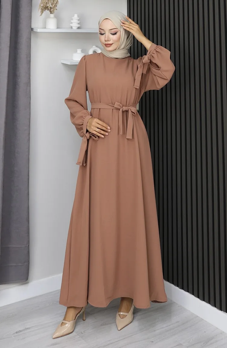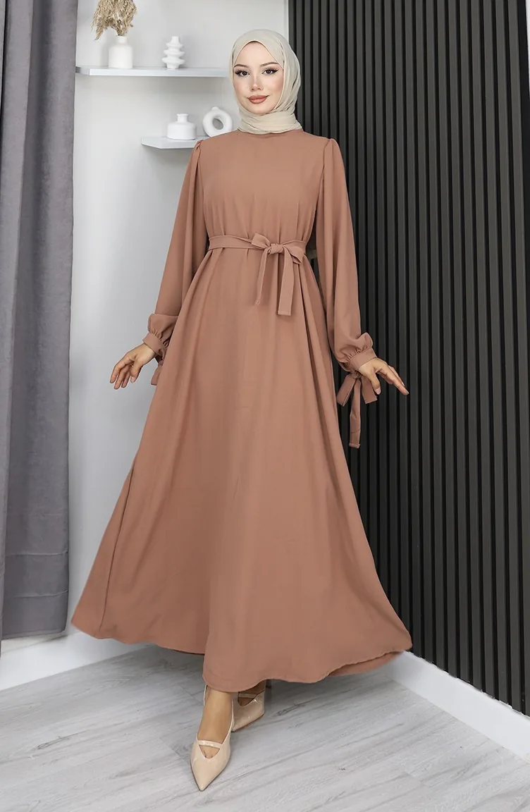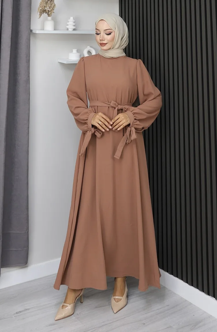 Manşeti Bağcıklı Tesettür Elbise 7121-08 Sütlü Kahve