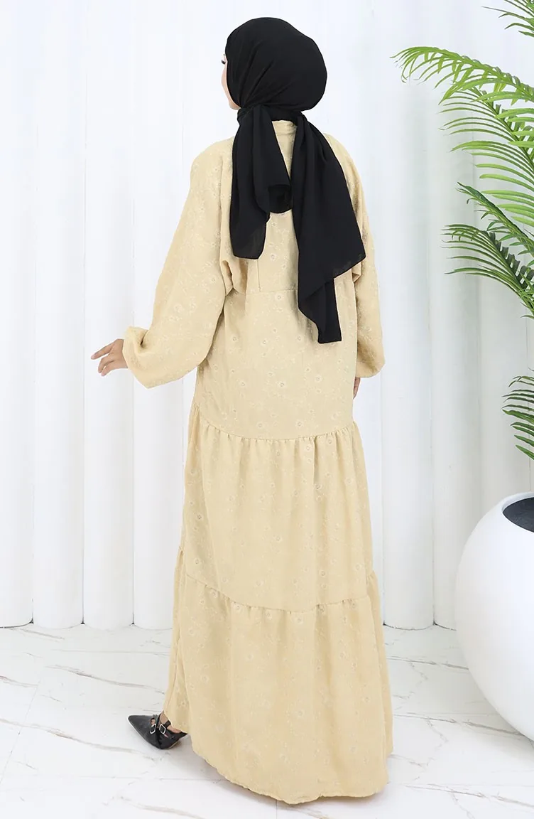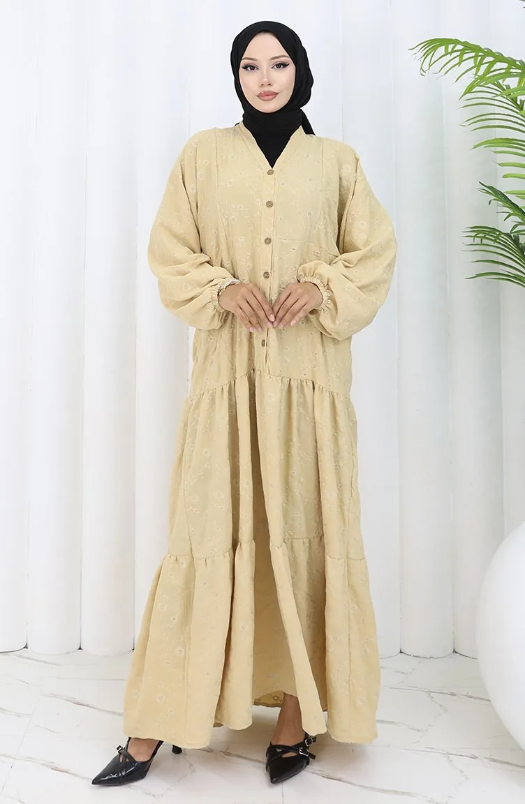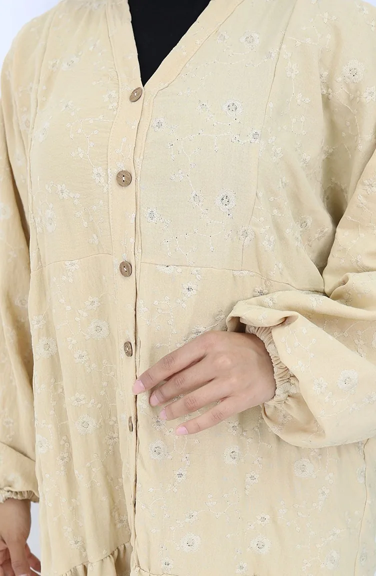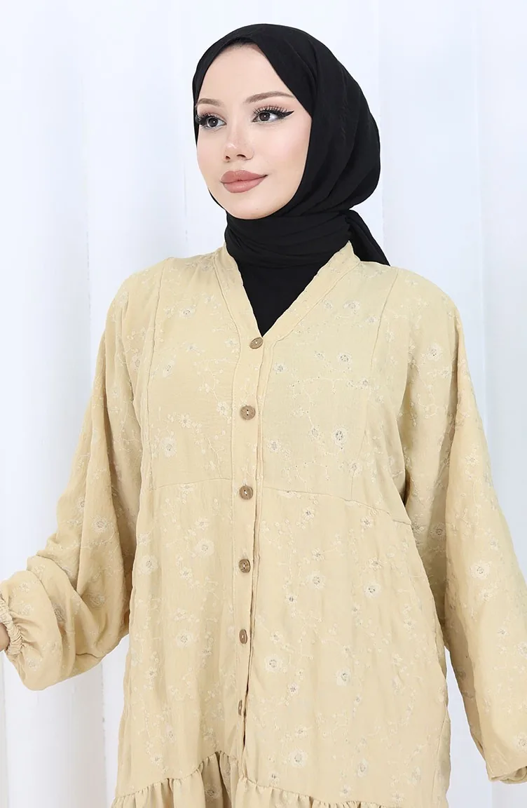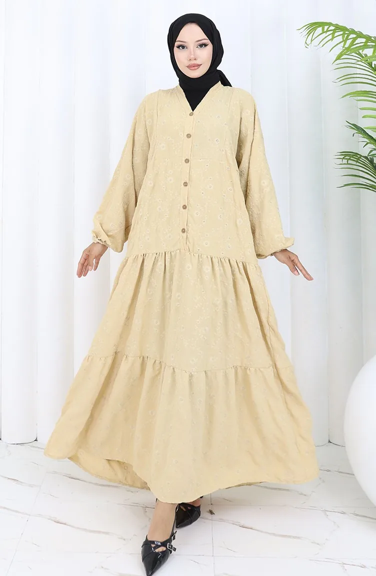 Nakış İşlemeli Yarım Düğmeli Elbise 0059-01 Bej