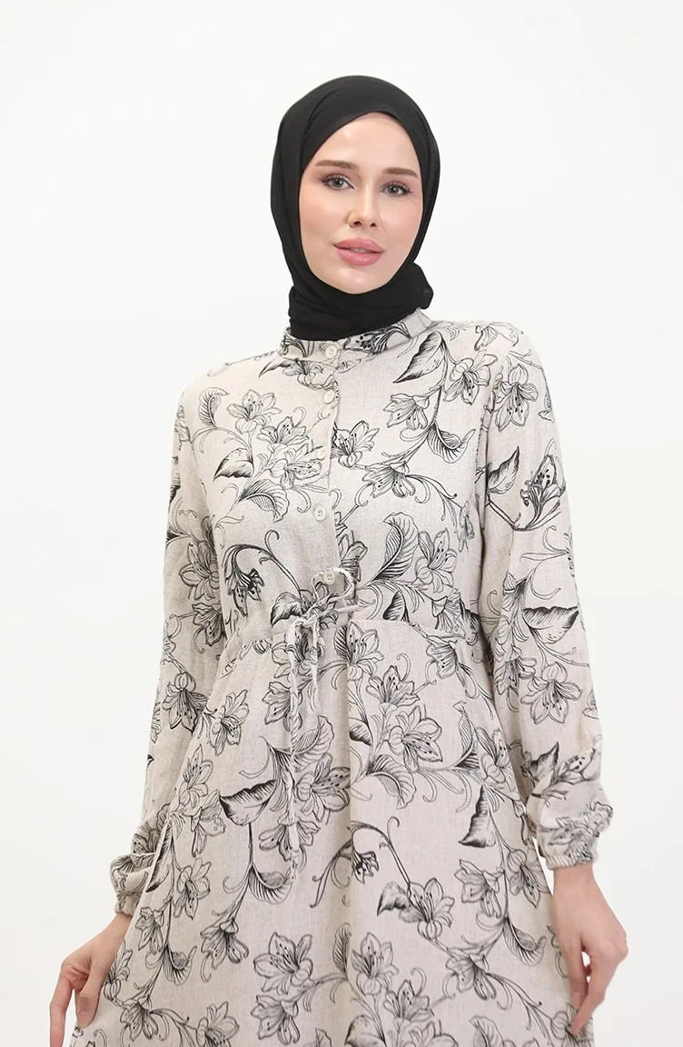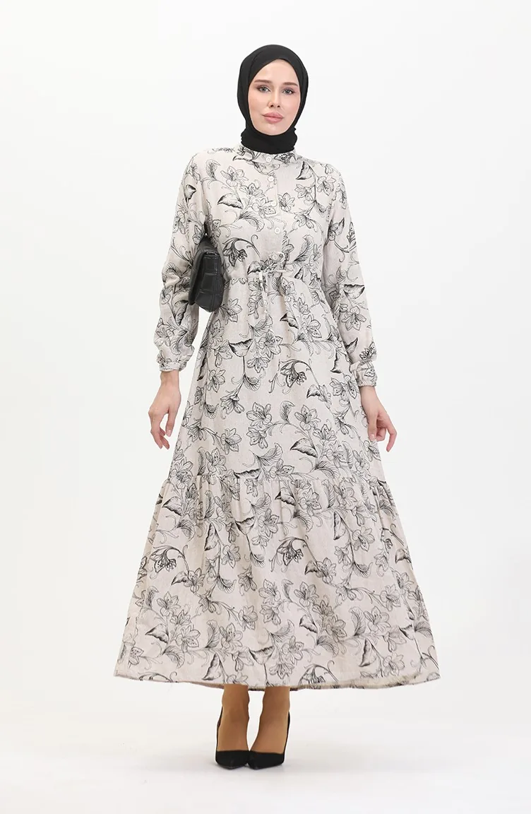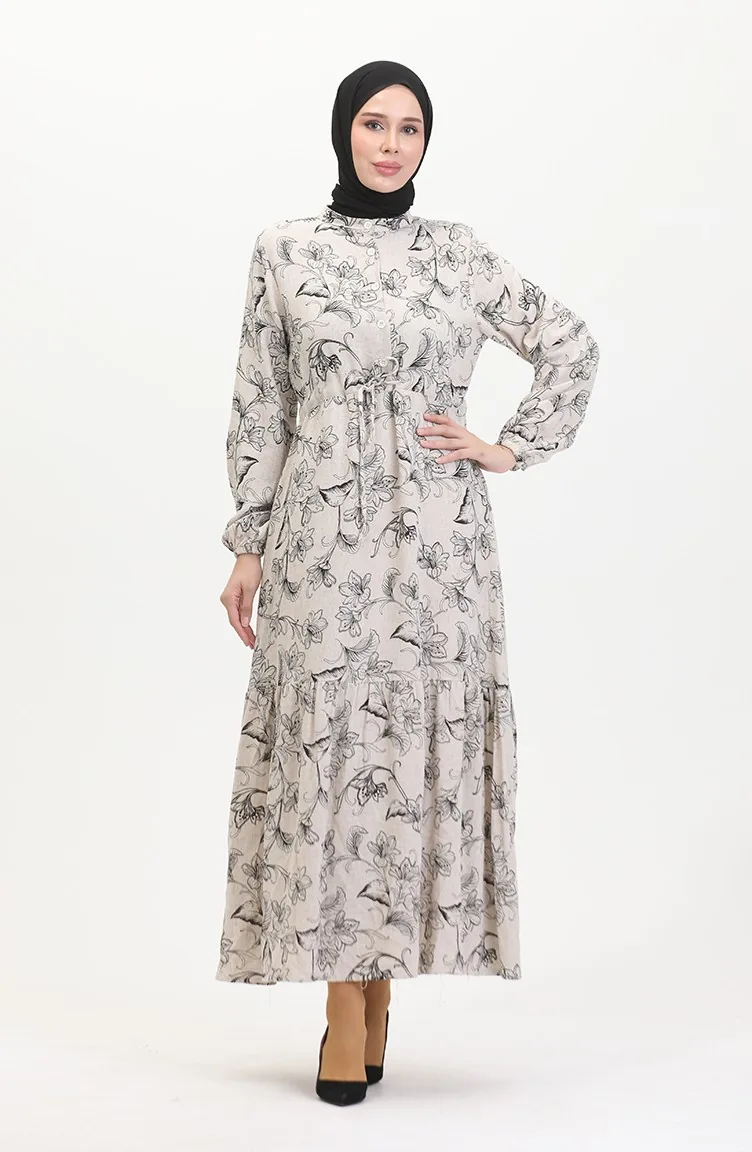 Önden Düğmeli Bağcıklı Keten Elbise 0520-01 Bej Siyah