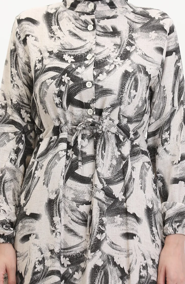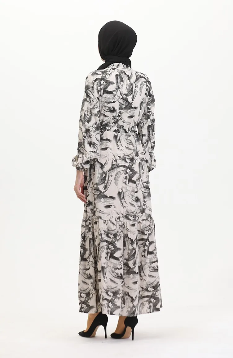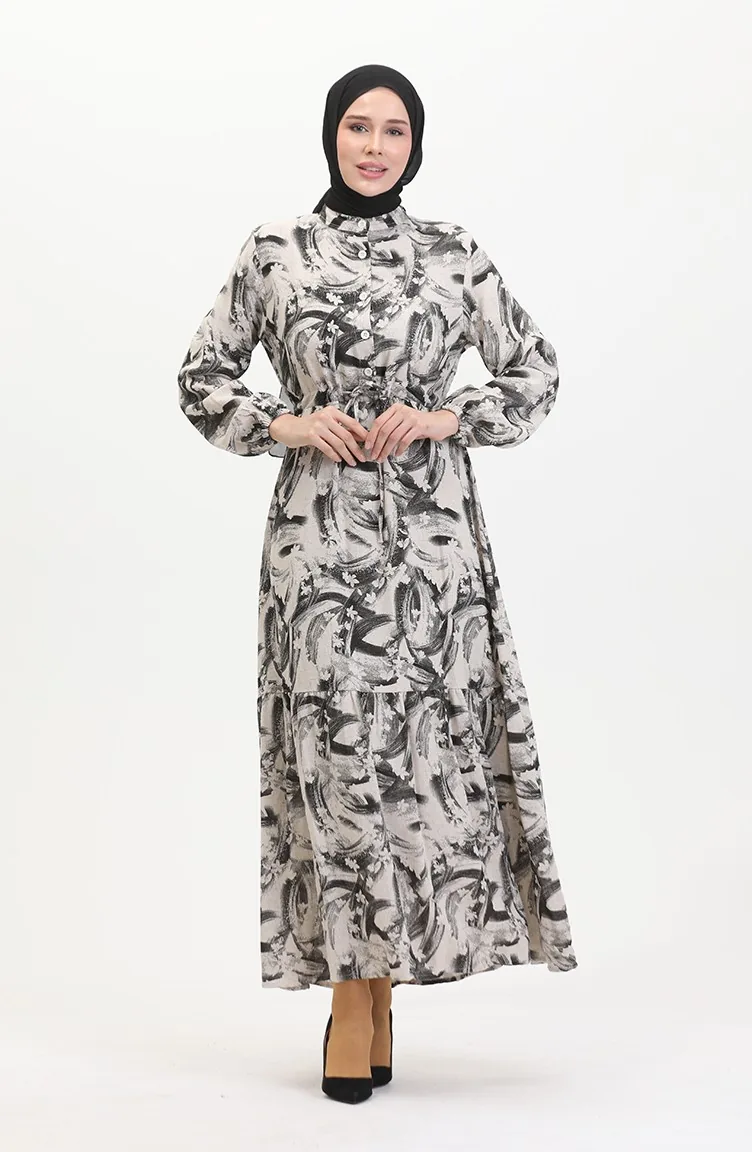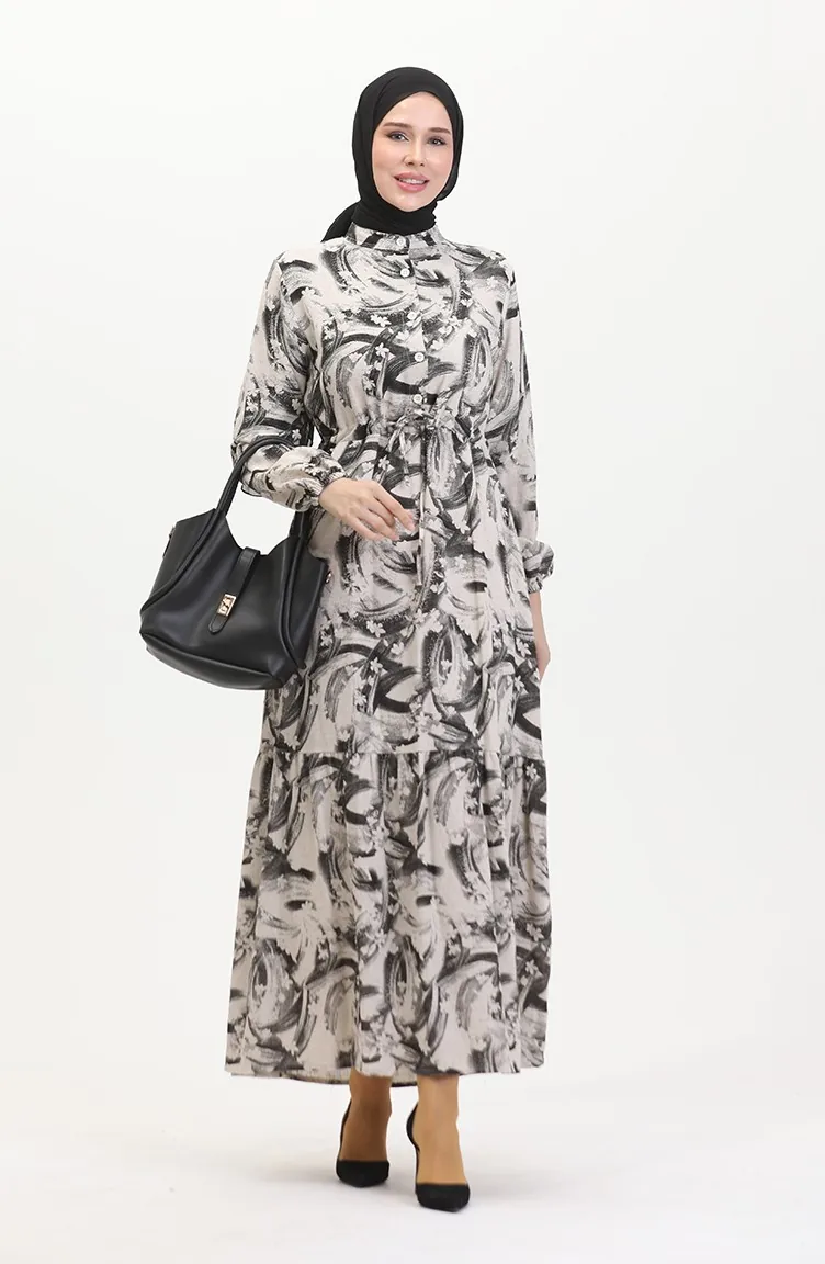 Önden Düğmeli Bağcıklı Keten Elbise 0520A-04 Bej Siyah