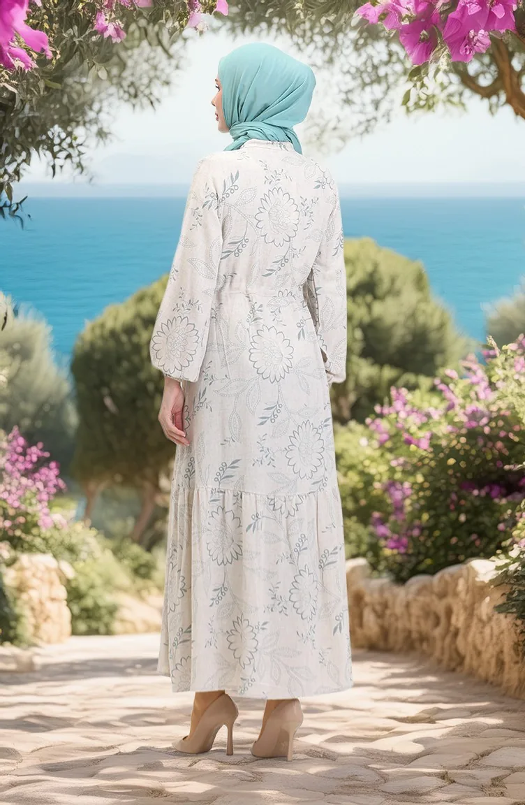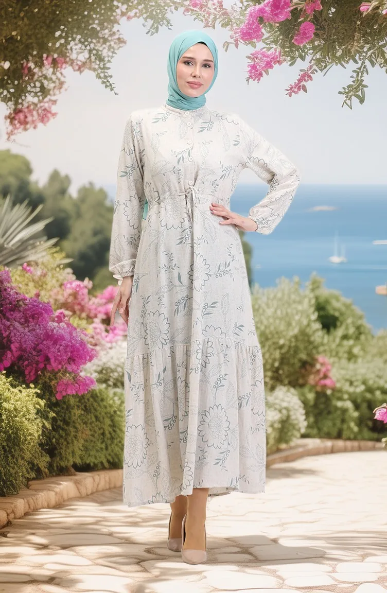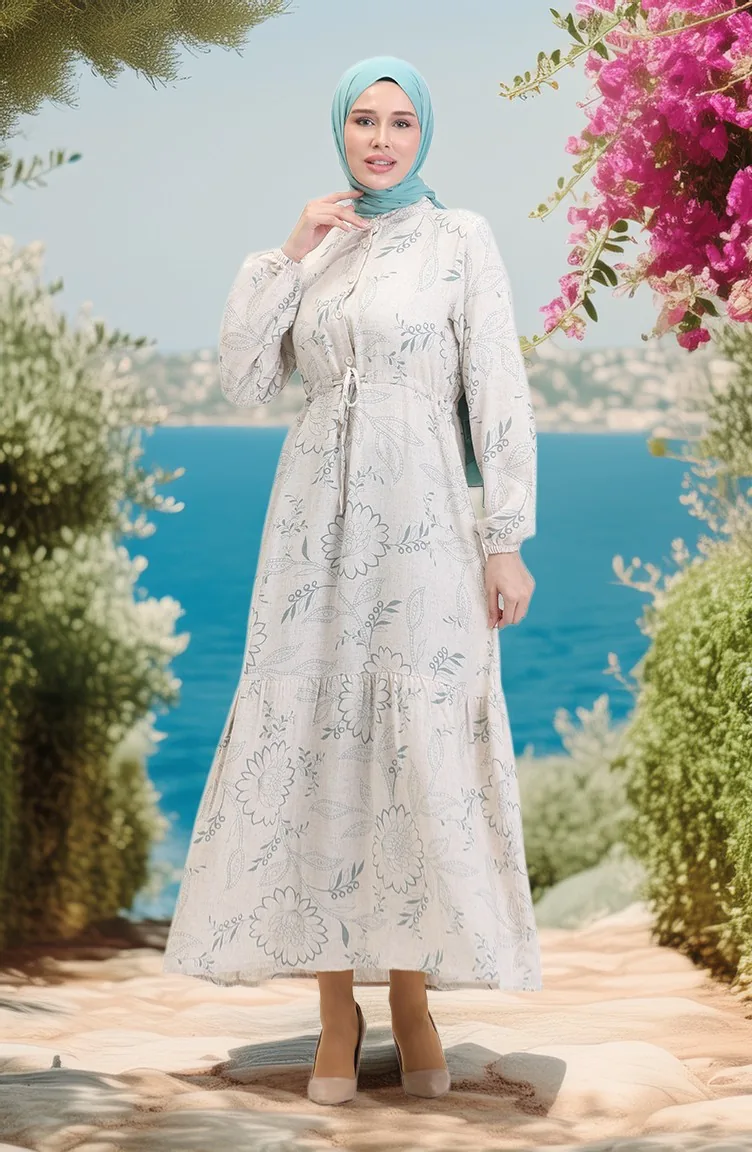 Önden Düğmeli Bağcıklı Keten Elbise 0520C-02 Bej Çağla Yeşili