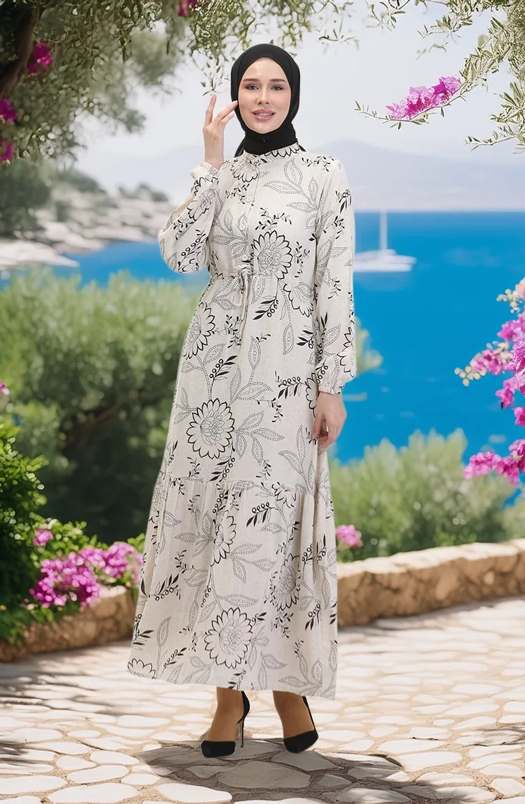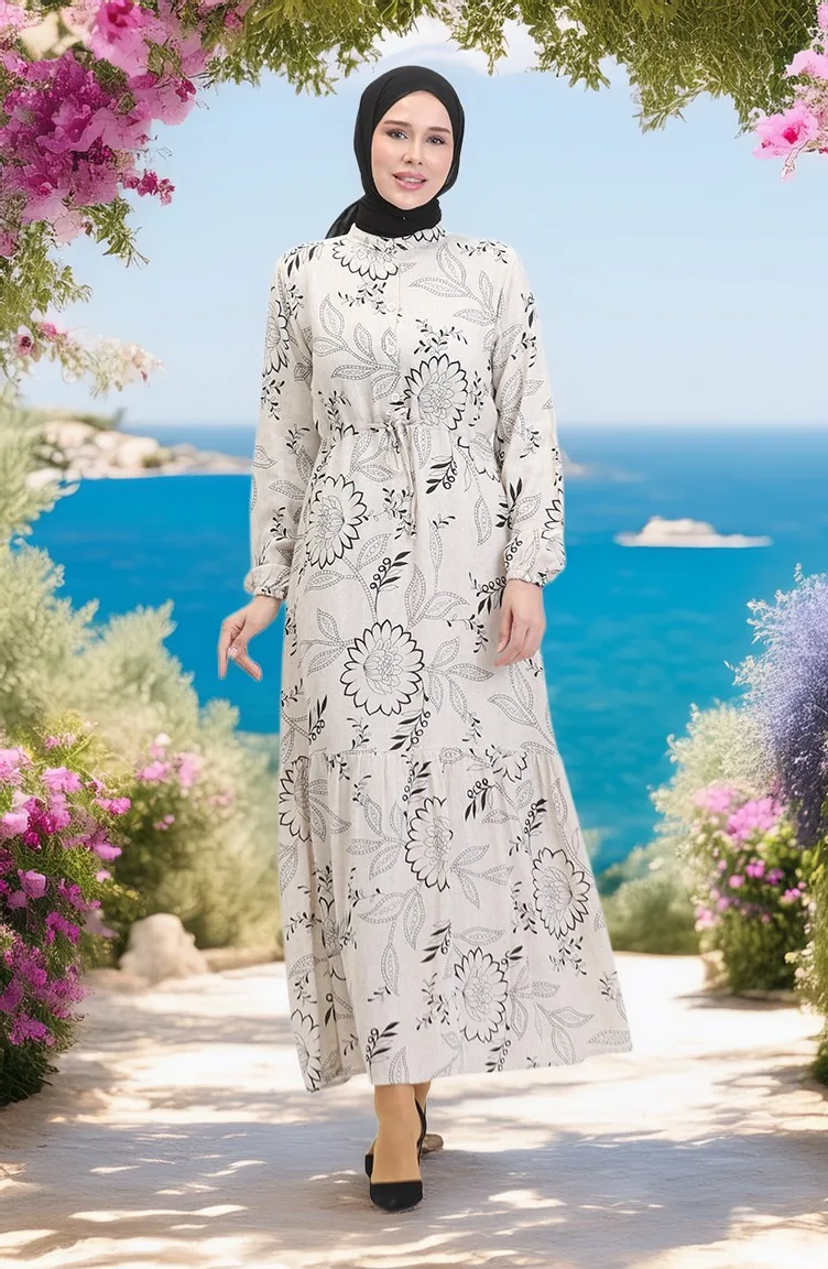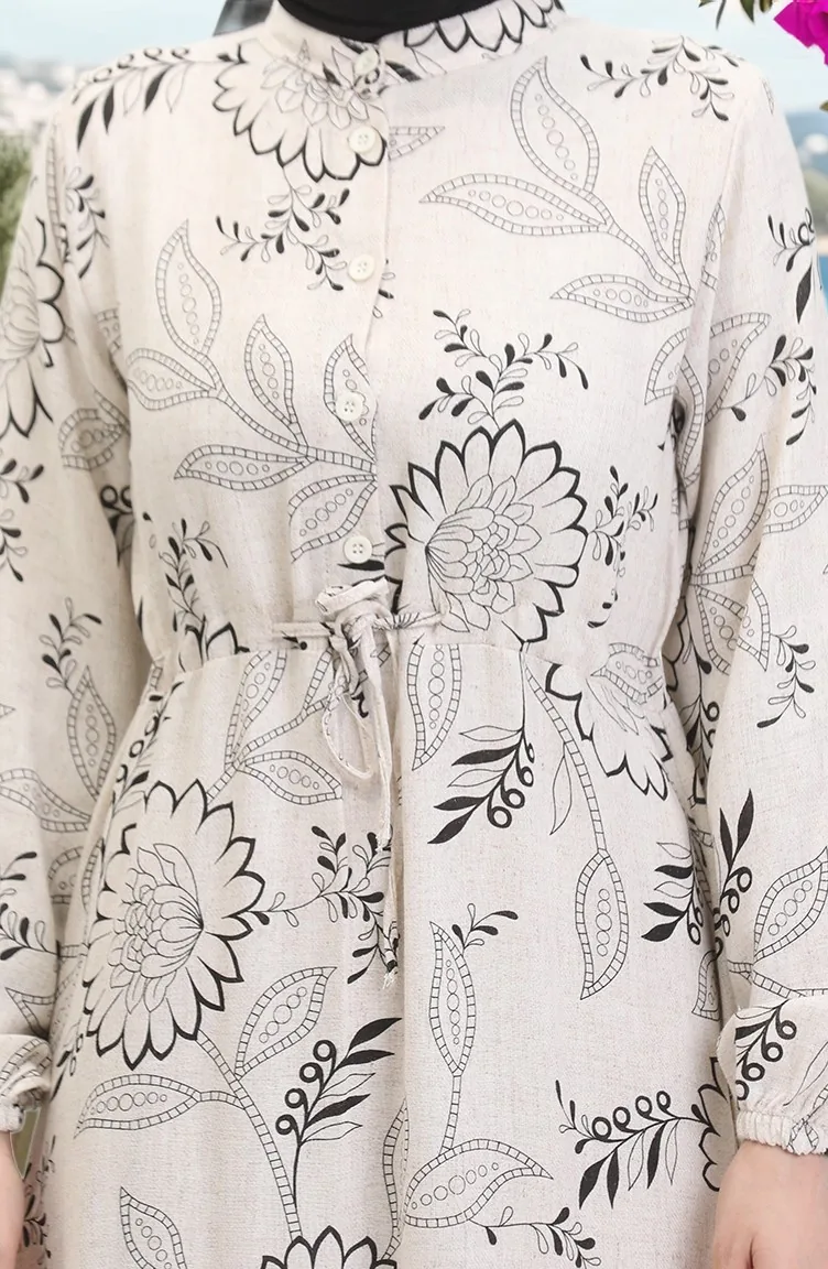 Önden Düğmeli Bağcıklı Keten Elbise 0520C-04 Bej Siyah
