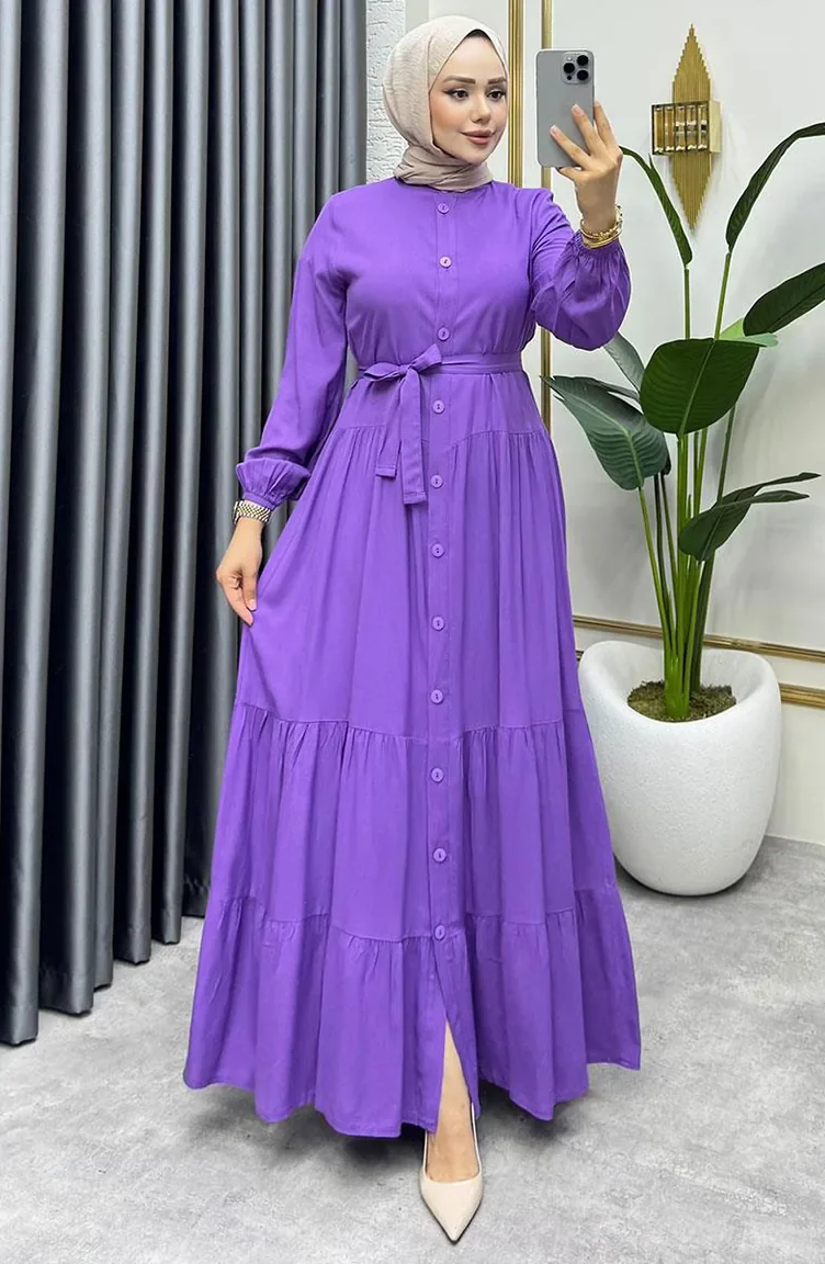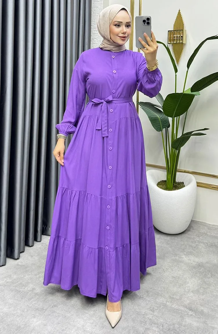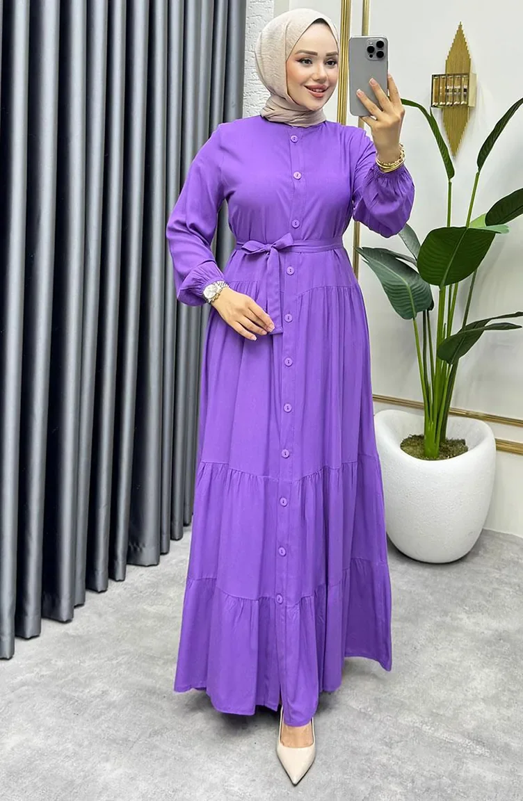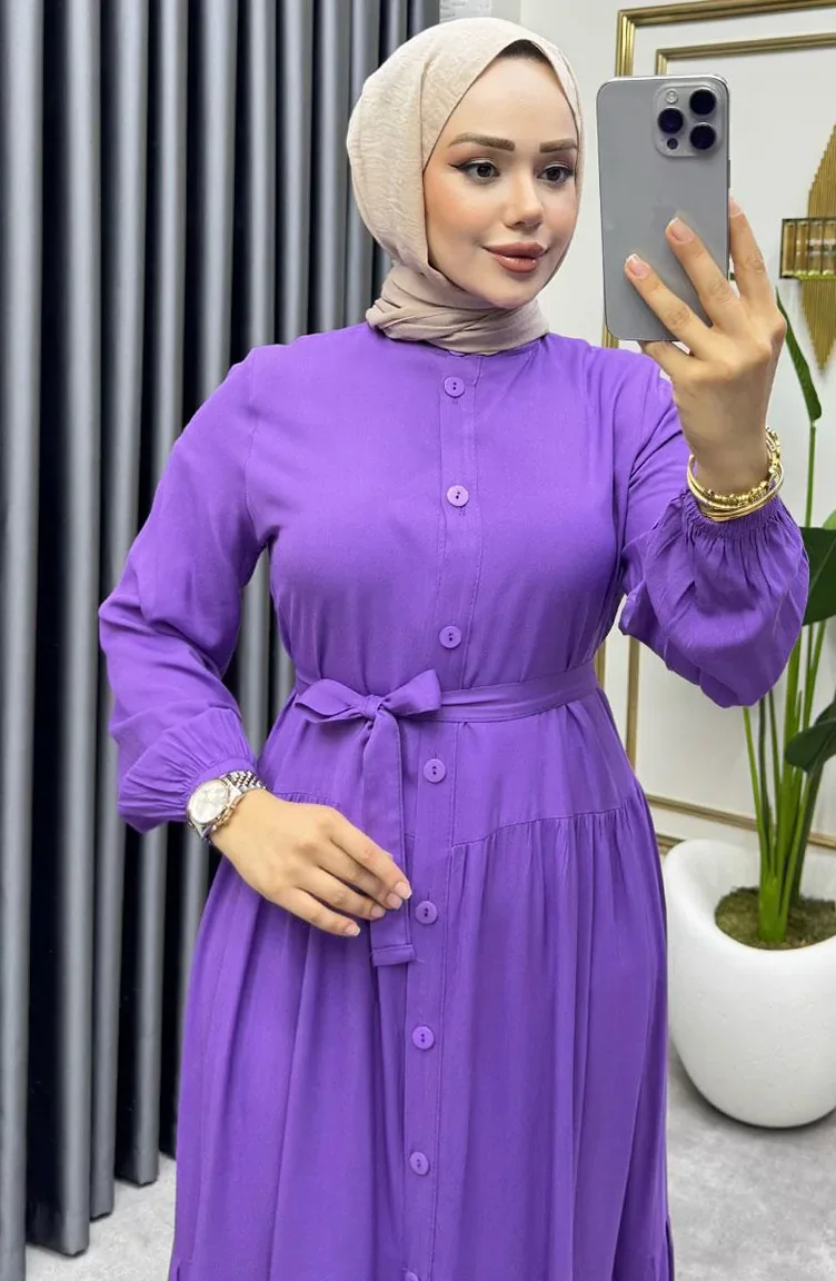 Önden Düğmeli Viskon Elbise 1124-08 Lila