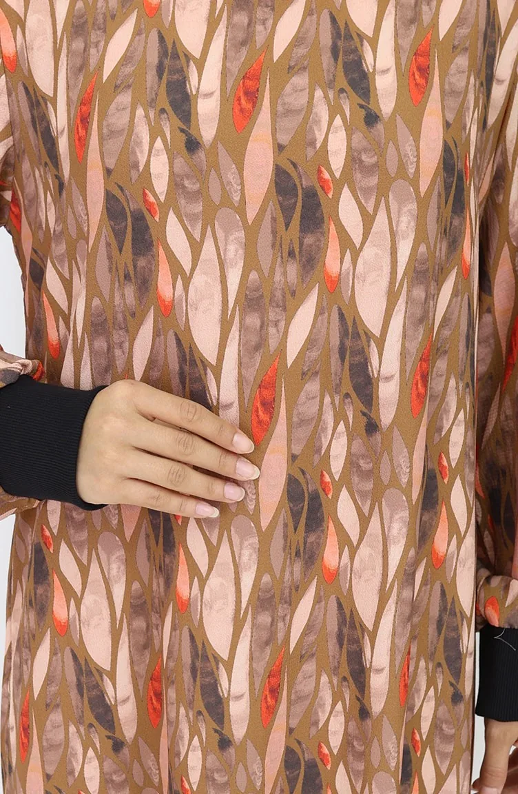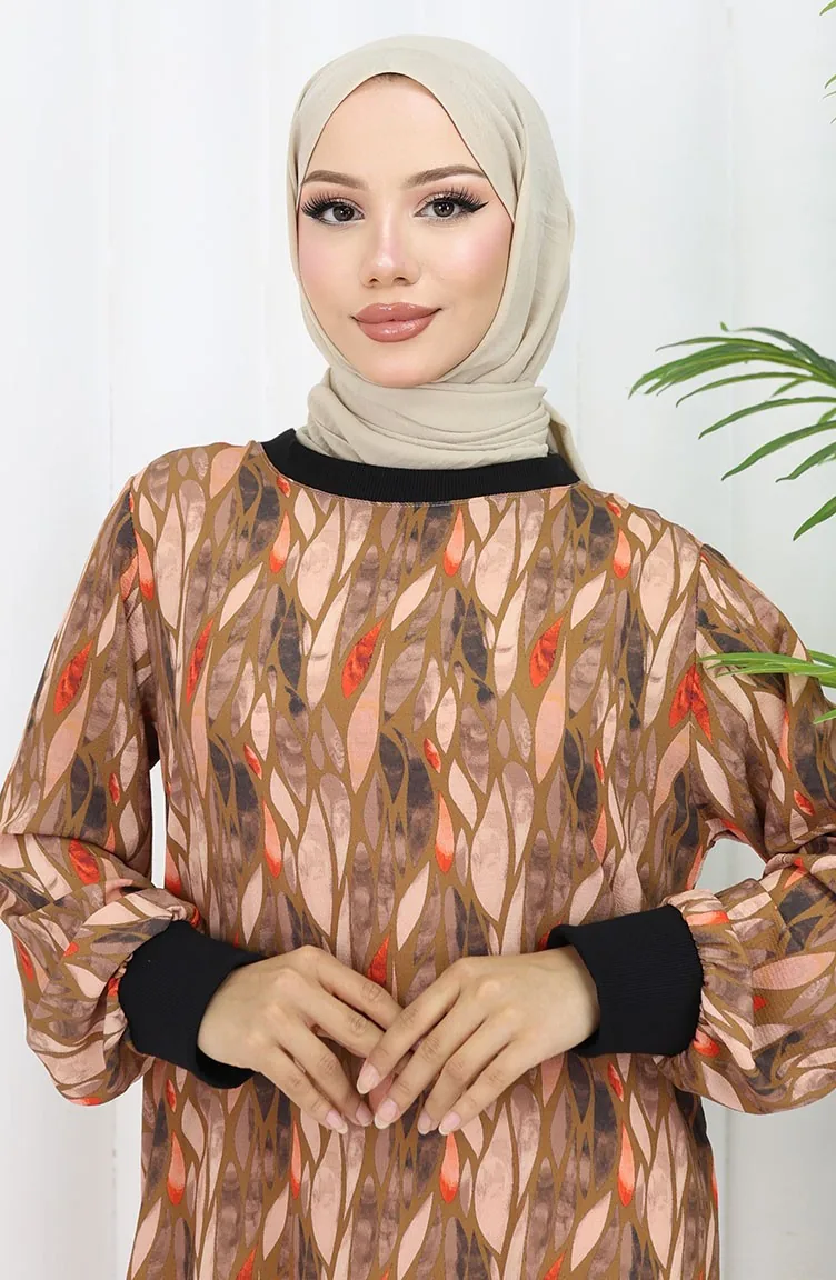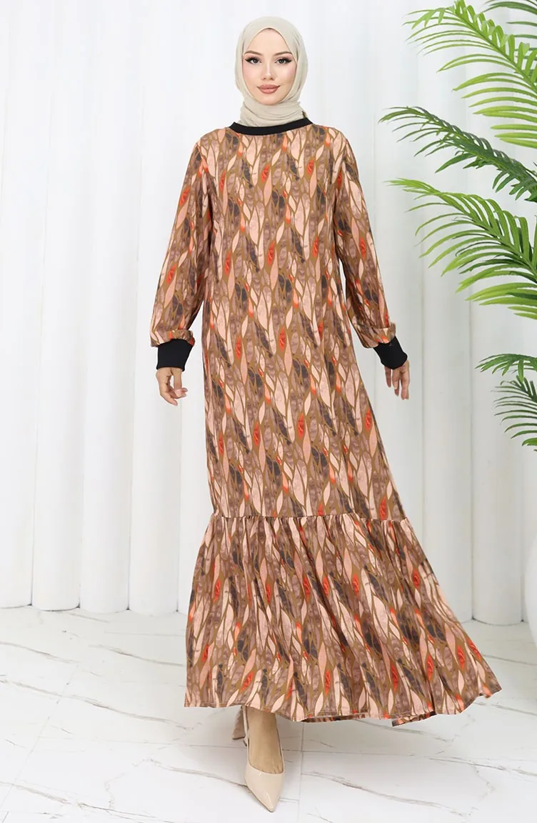 Şifon Kumaş Yaprak Desenli Elbise 0054-01 Kahverengi