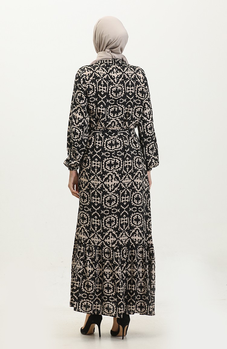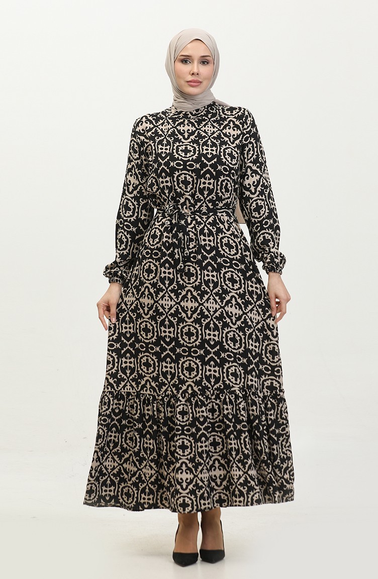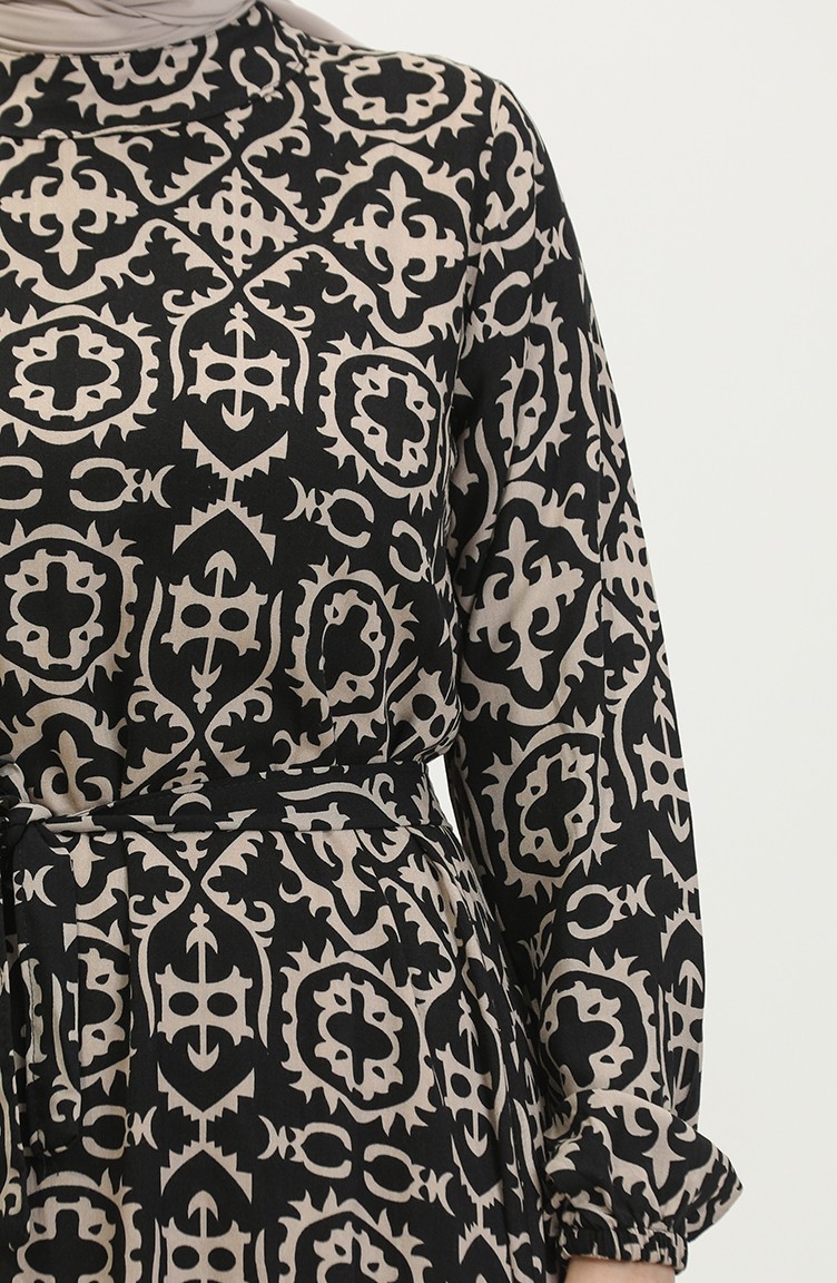 Viskon Desenli Elbise 0362-03 Siyah