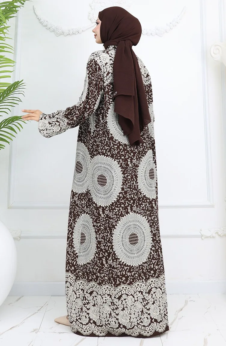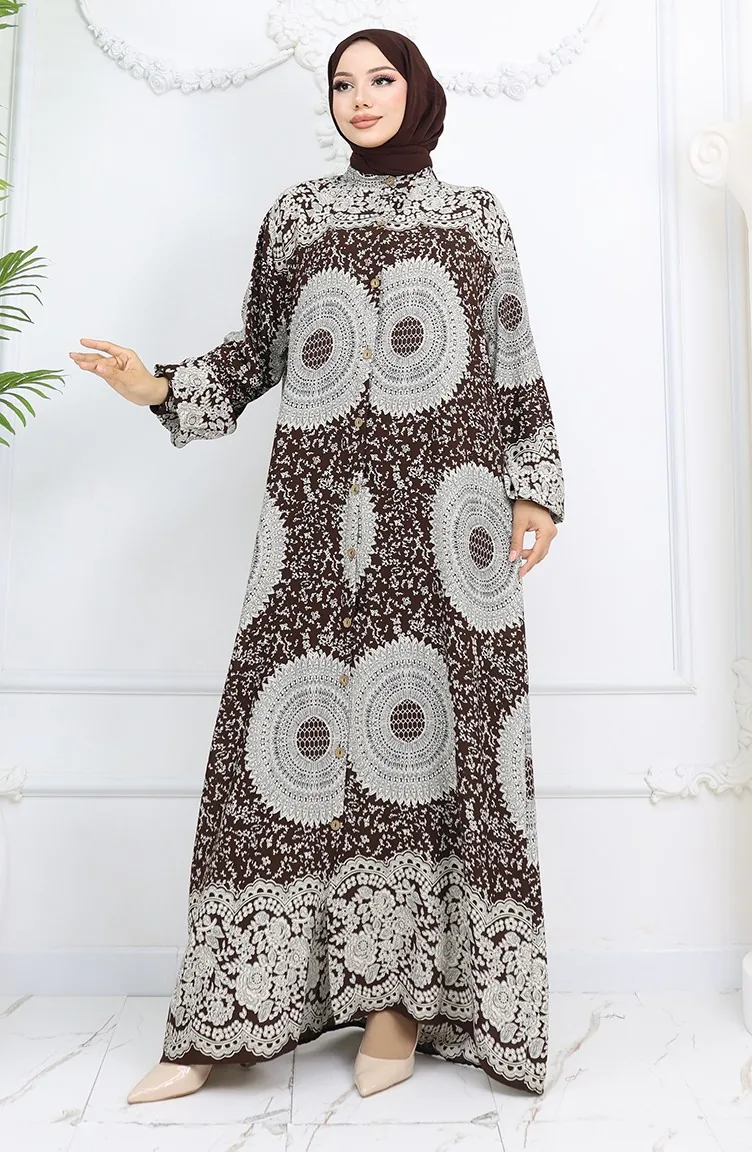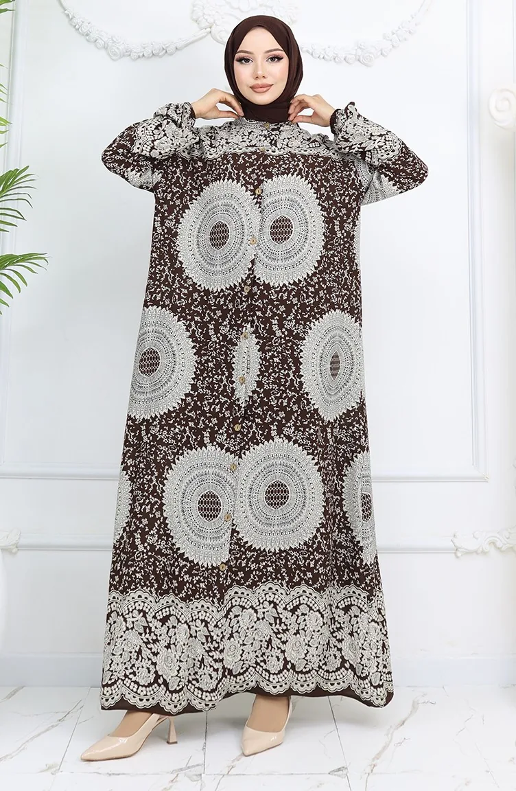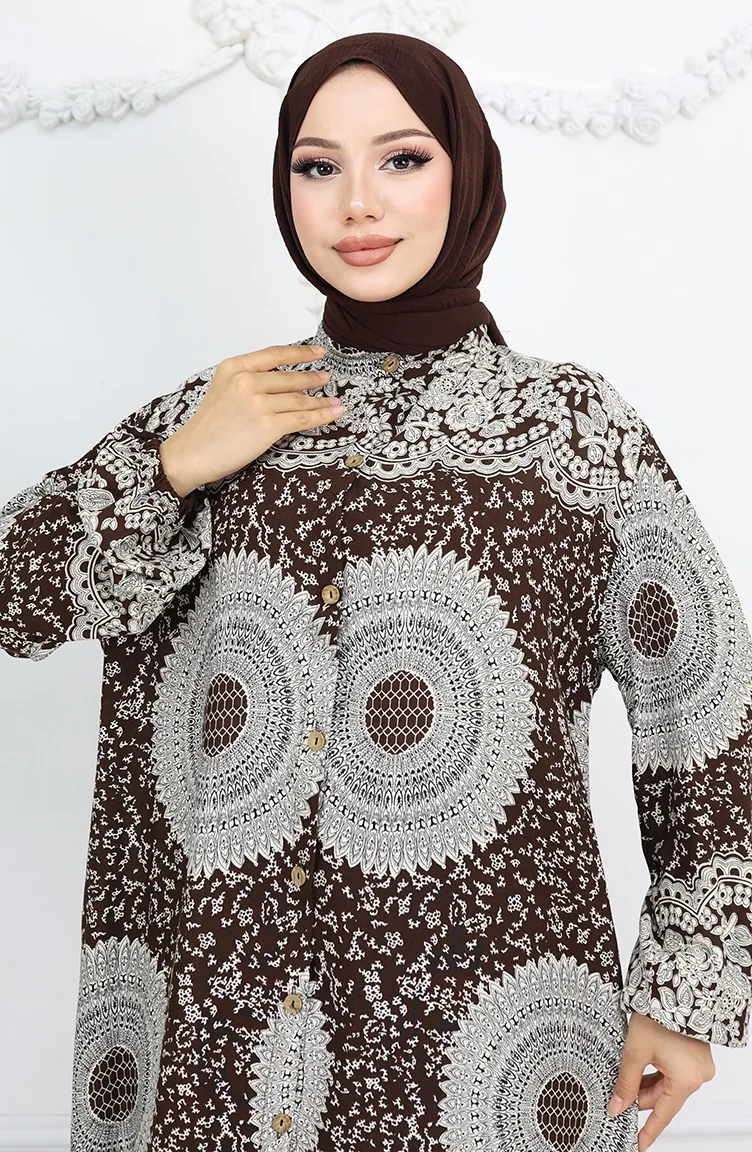 Viskon Kumaş Boydan Düğmeli Desenli Elbise 0047-02 Kahverengi