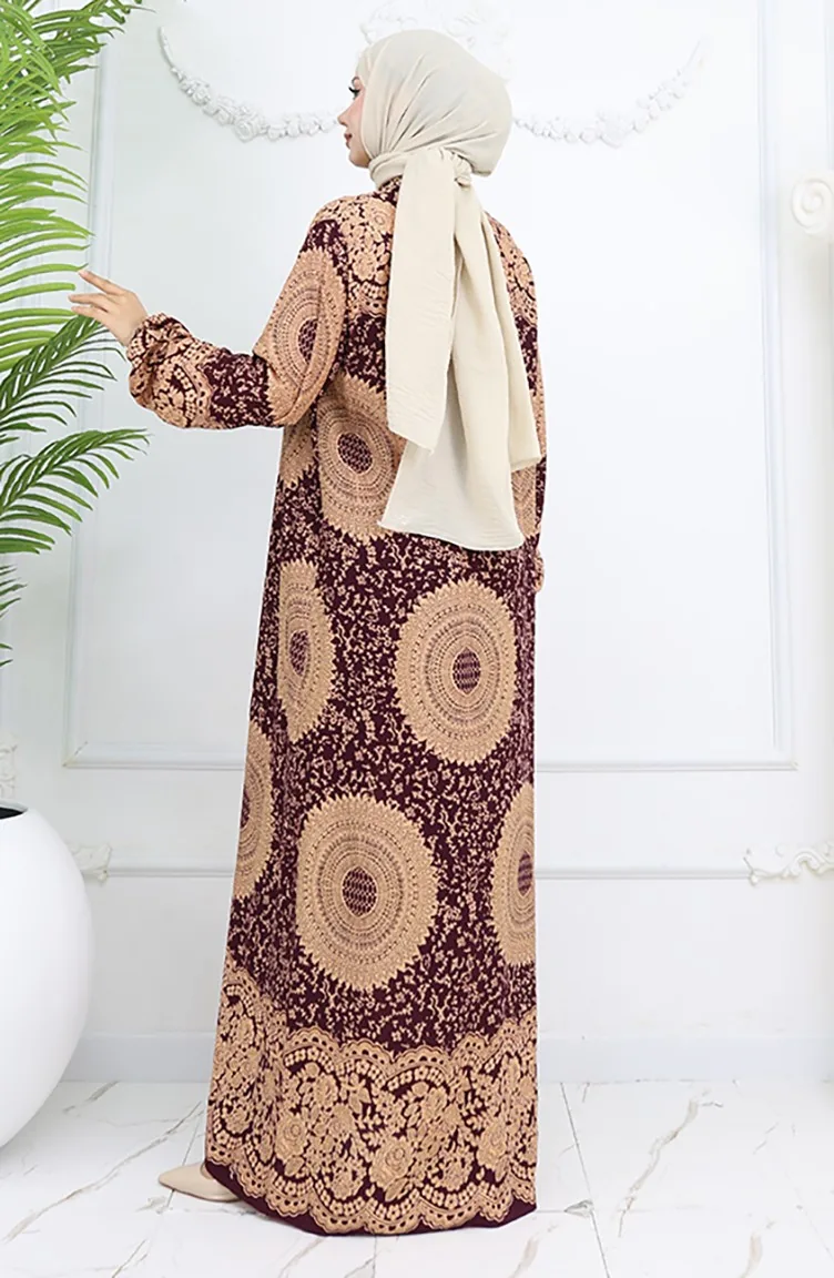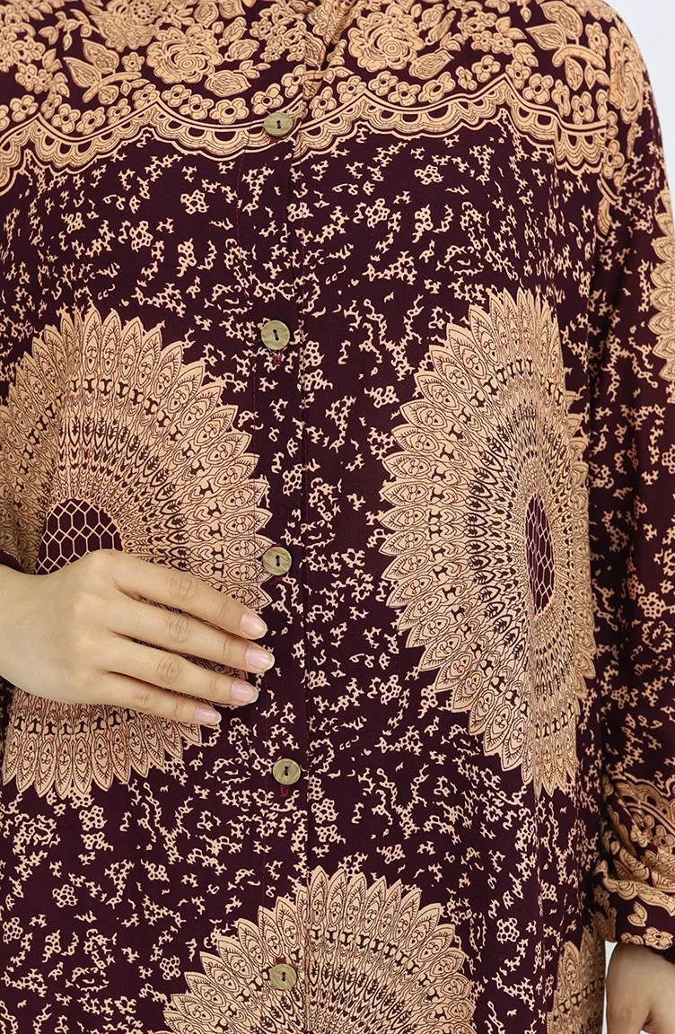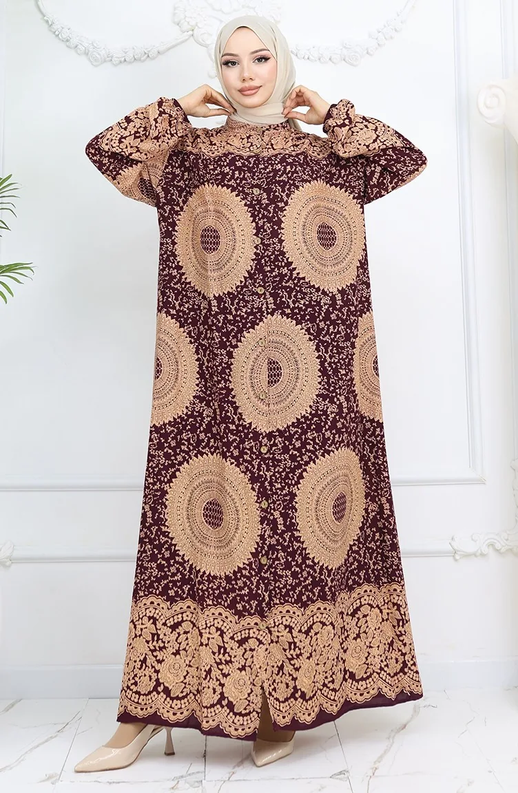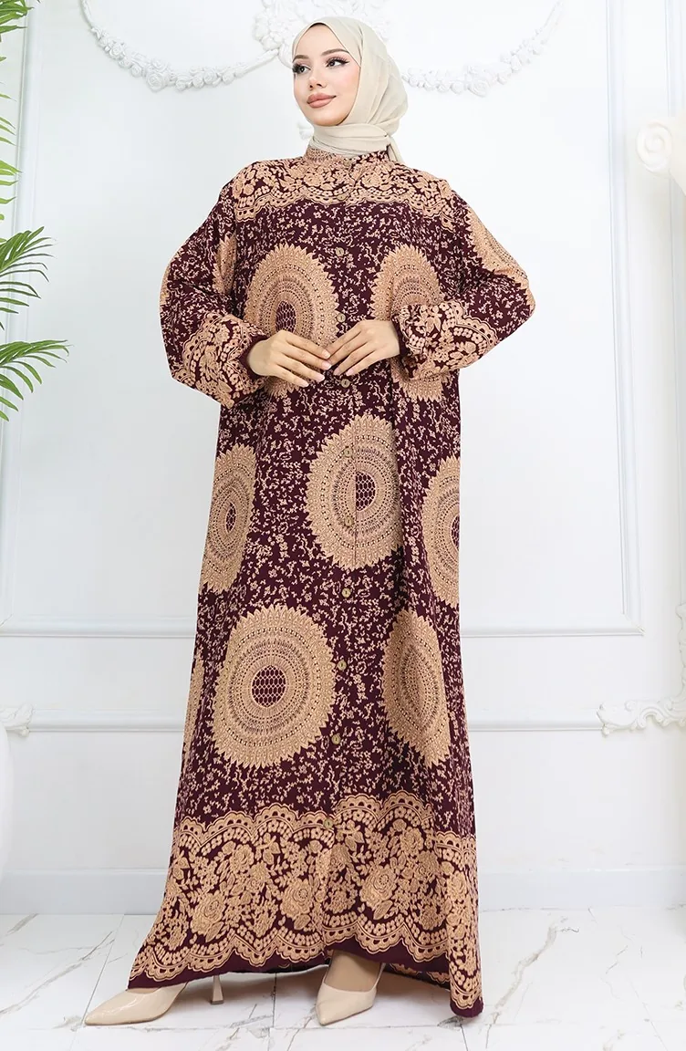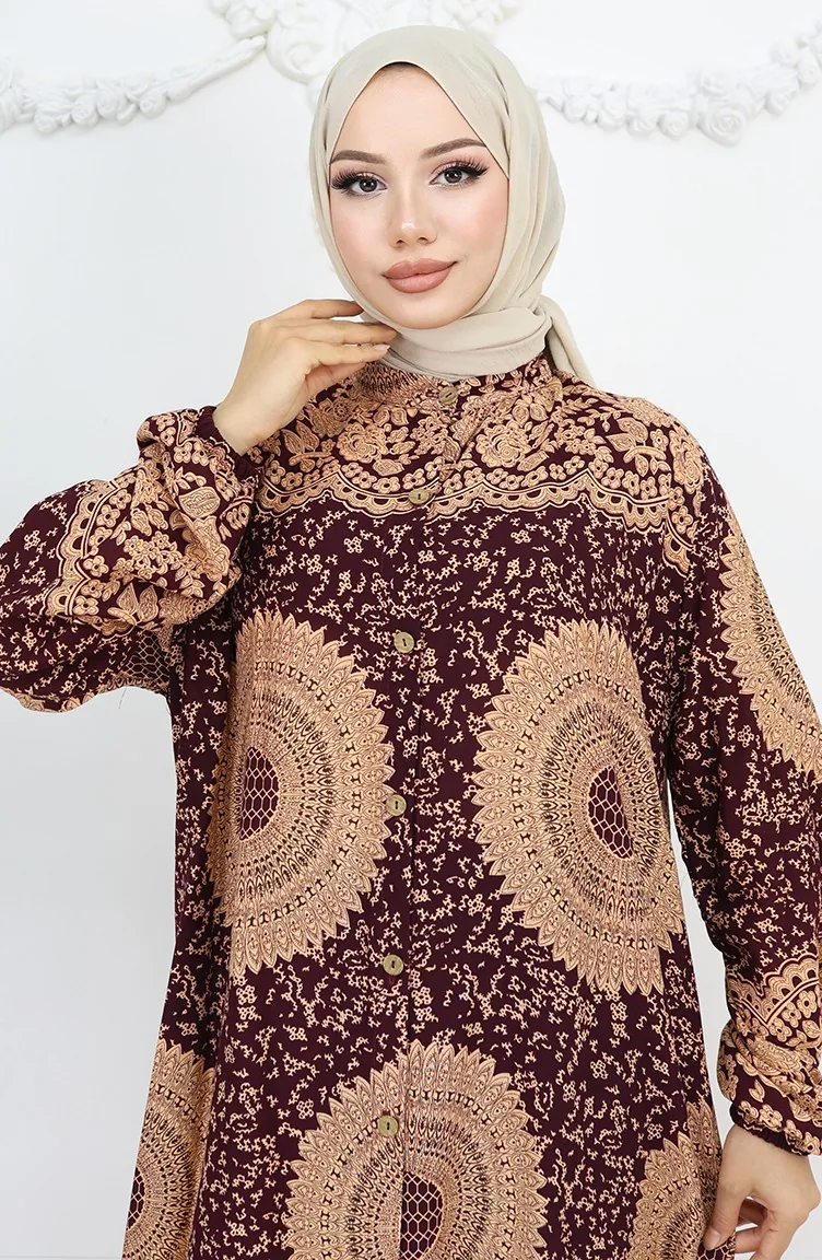 Viskon Kumaş Boydan Düğmeli Desenli Elbise 0047-06 Mürdüm