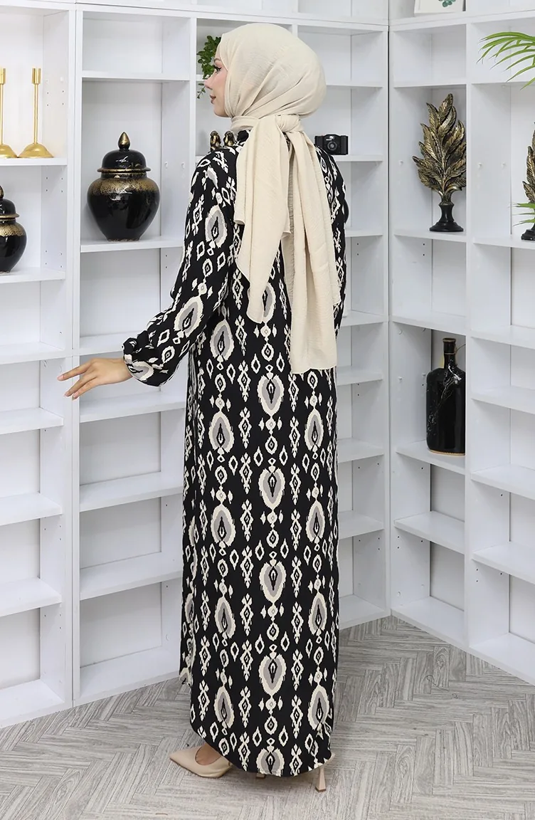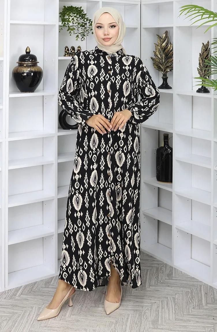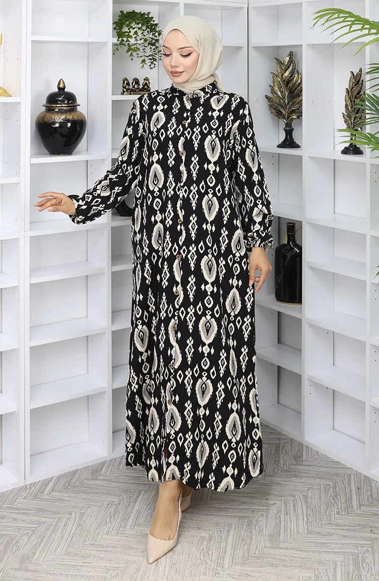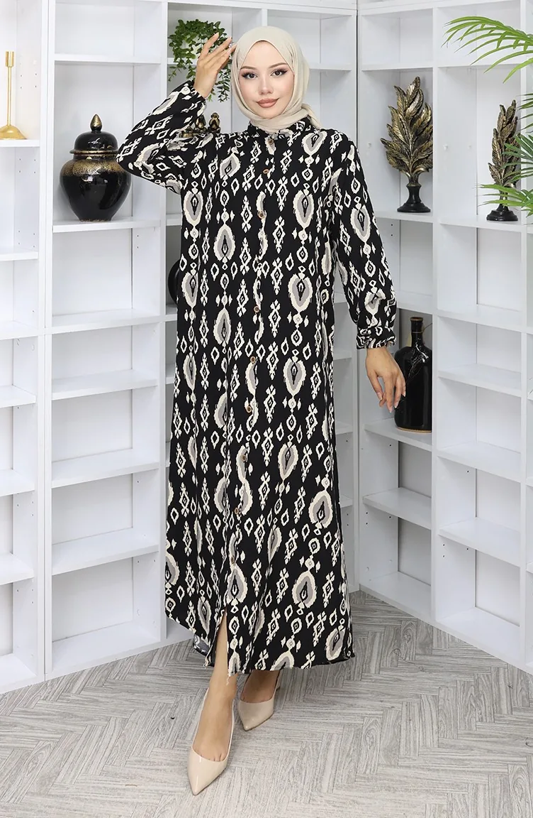 Viskon Kumaş Boydan Düğmeli Elbise 2050-04 Siyah Bej