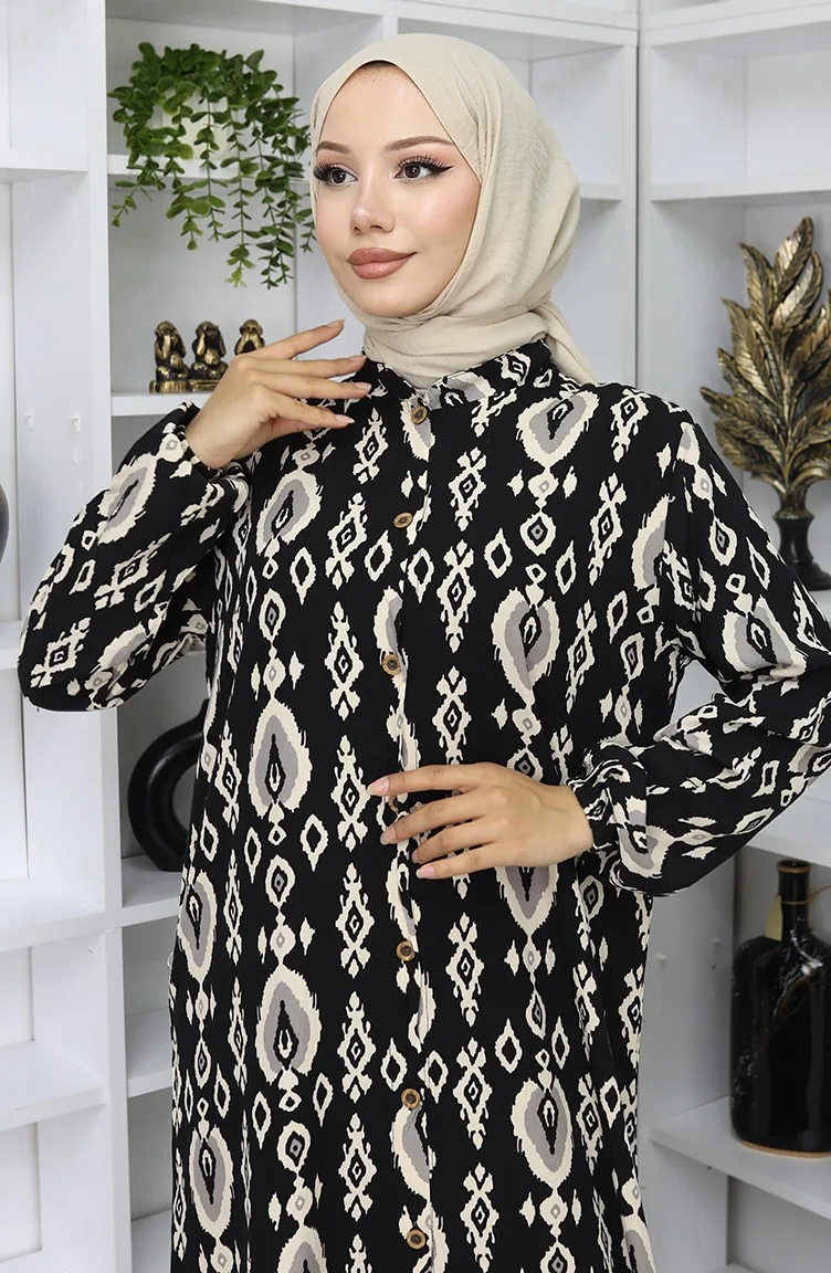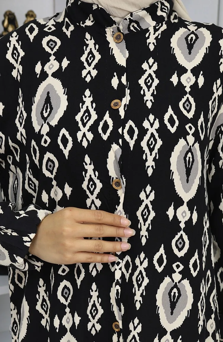 Siyah renktedir. Viskon kumaş. Desenli kumaş. Düğmeli. Lastik kollu. Hakim yaka detayı ile kullanışlı modeldir. 4 Mevsim tercih edebilirsiniz. Rahat. Büyük beden seçeneği mevcuttur.