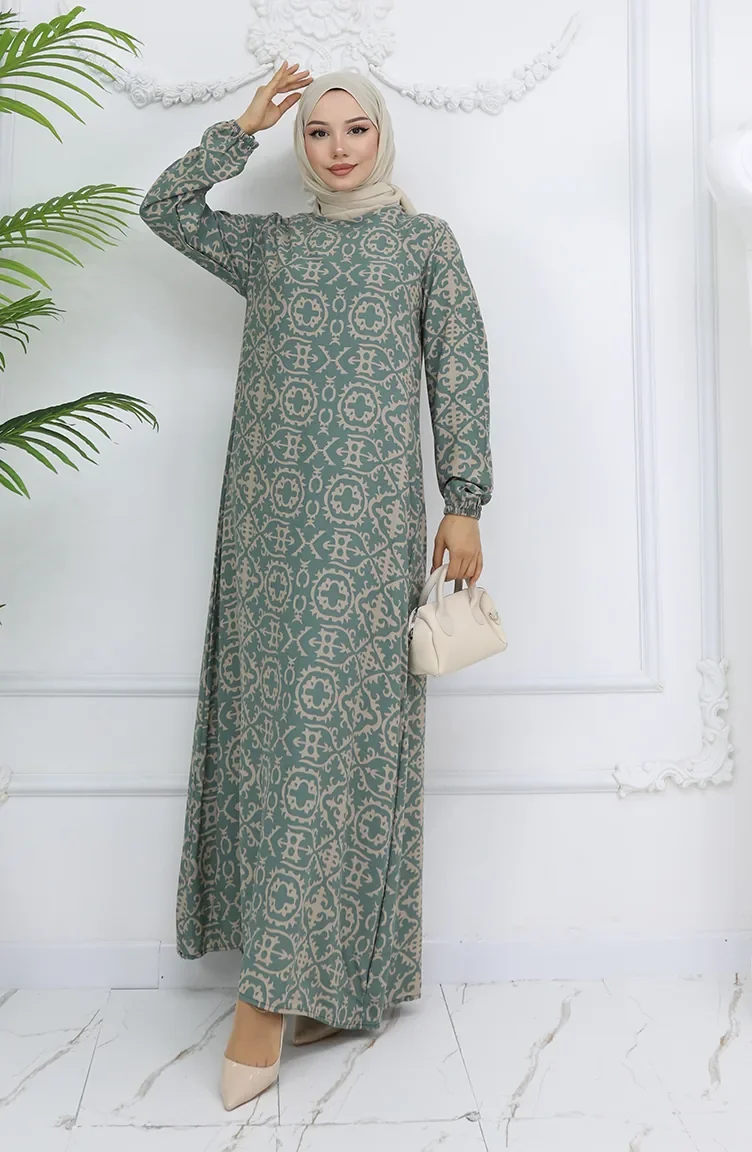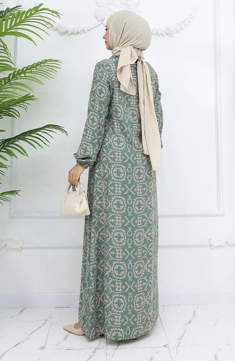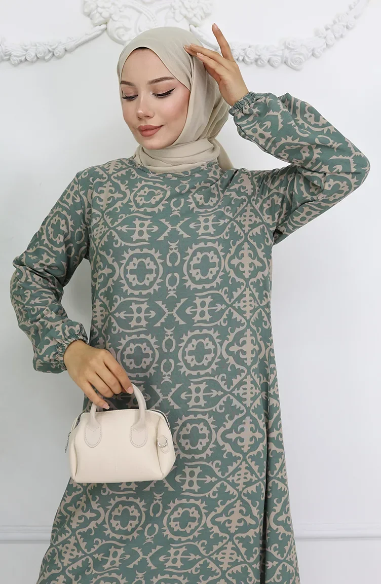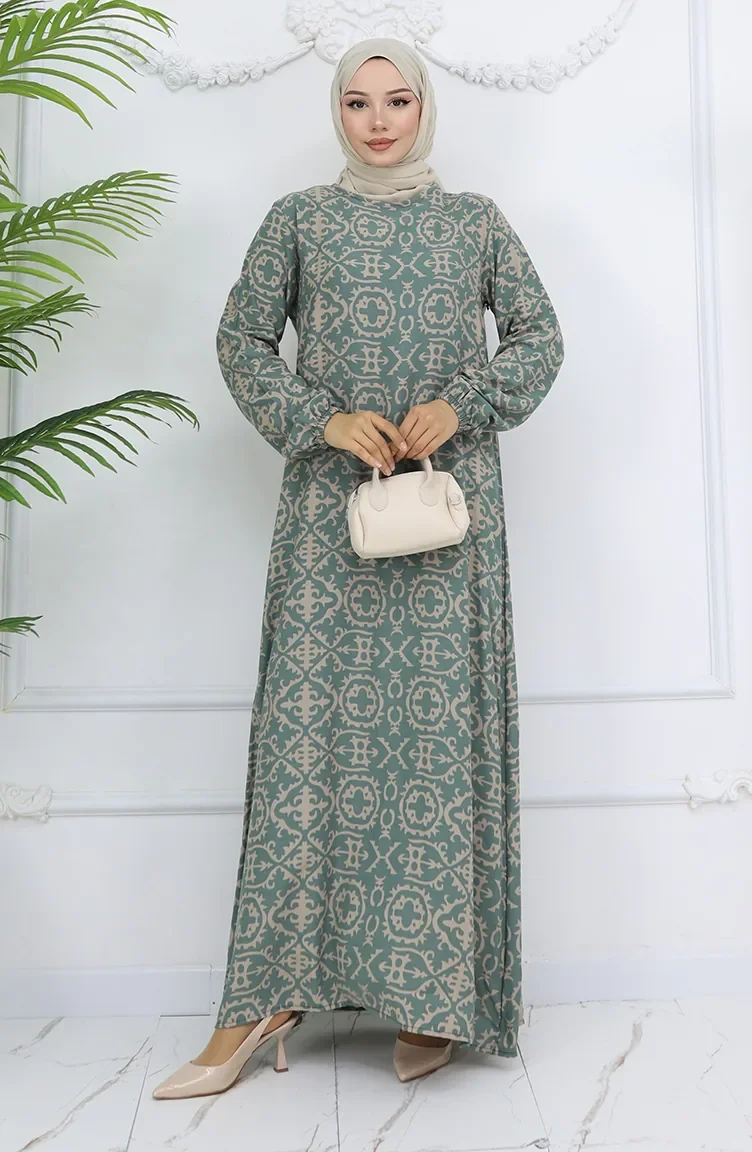 Viskon Kumaş Desenli Elbise 0036-01 Çağla Yeşili