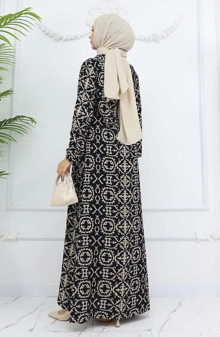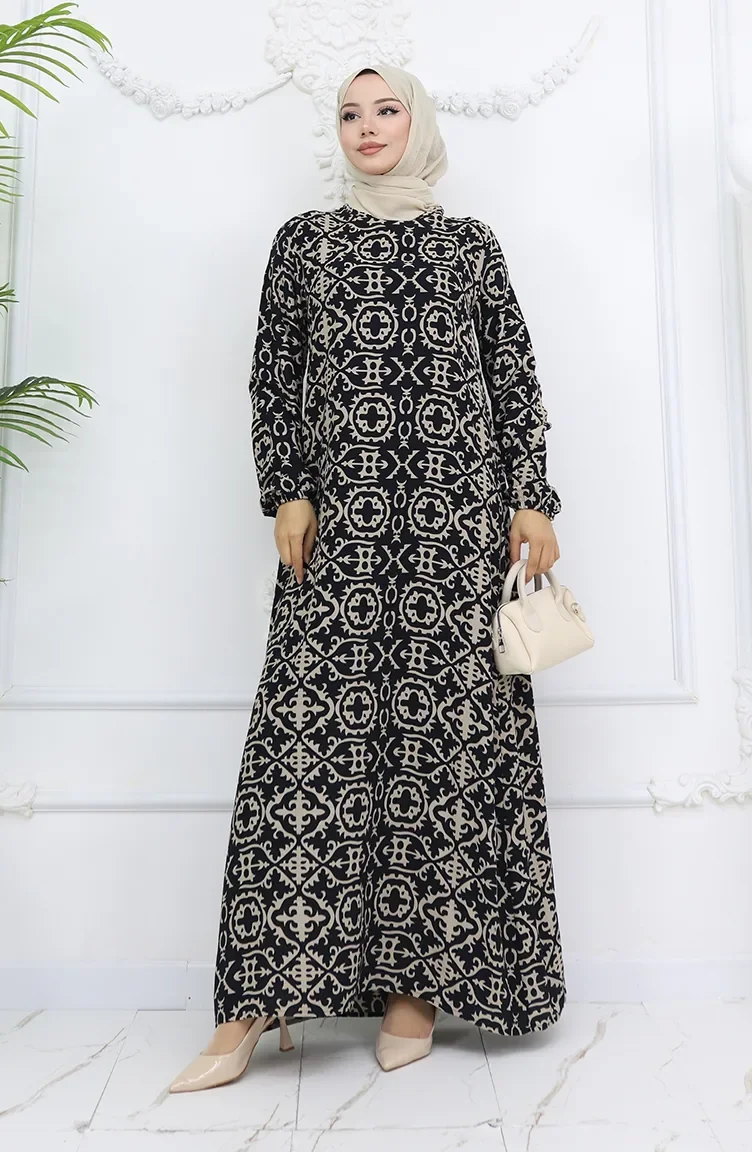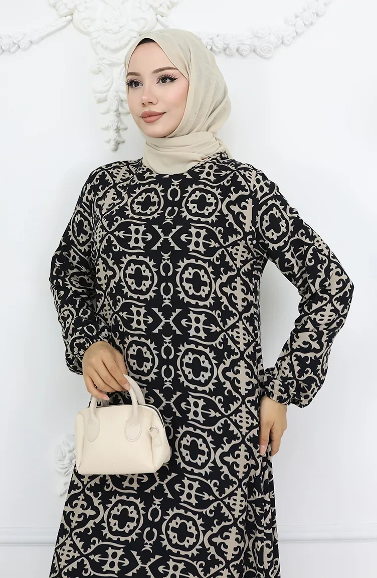 Viskon Kumaş Desenli Elbise 0036-02 Siyah